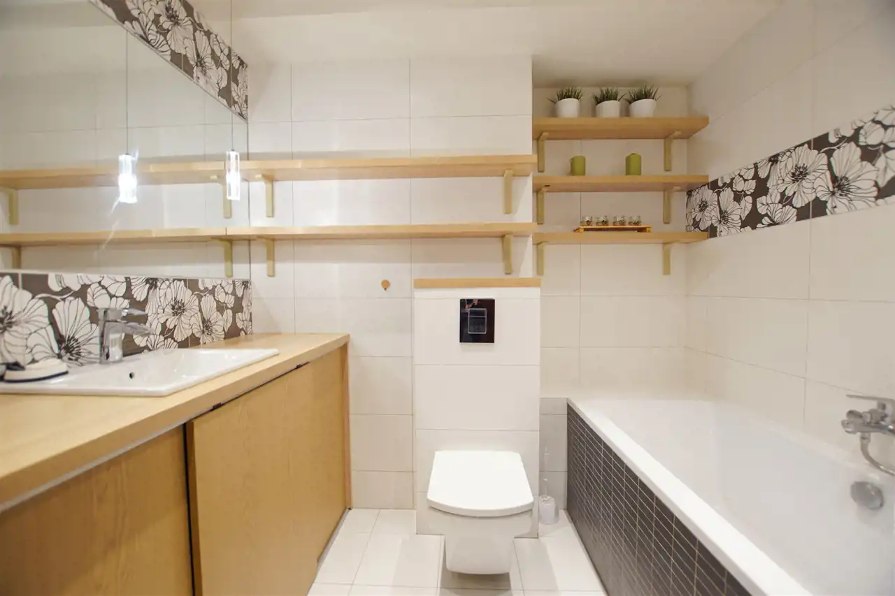 - ładnie wyflizowana i dobrze zorganizowana łazienka z wanną, wc w zabudowie, umywalką i dużą szafką z drzwiami przesuwnymi, gdzie schowana jest również pralka