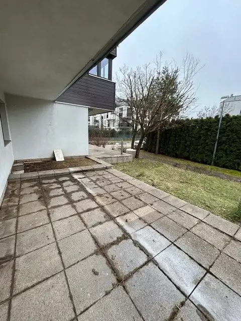 The apartment is situated on the ground floor of a low-rise building and features a large private terrace. It consists of a living room with a fully equipped kitchenette, a bedroom, a hallway and a bathroom.