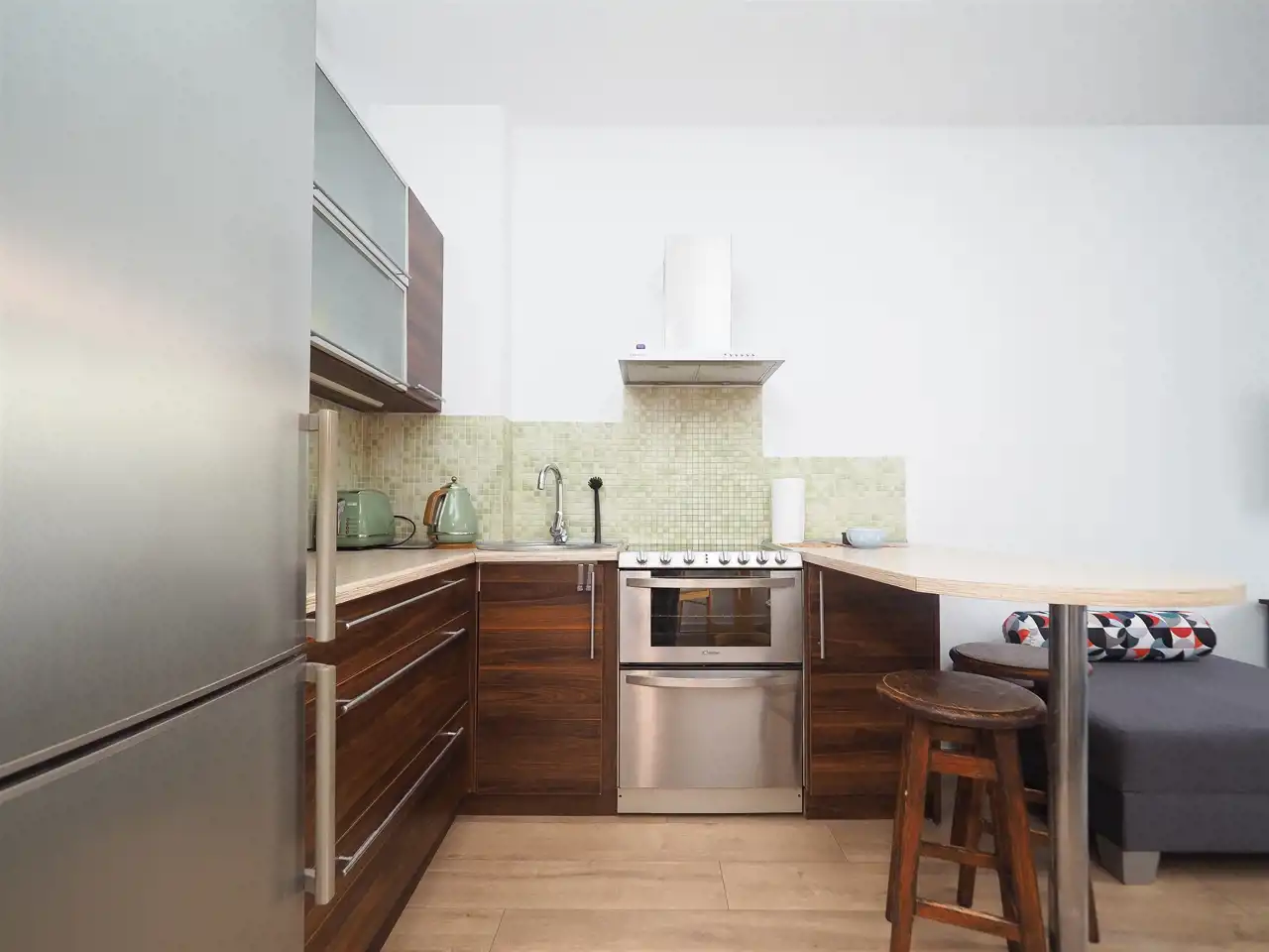 – a living room with a kitchenette equipped with an oven, dishwasher, refrigerator and induction hob