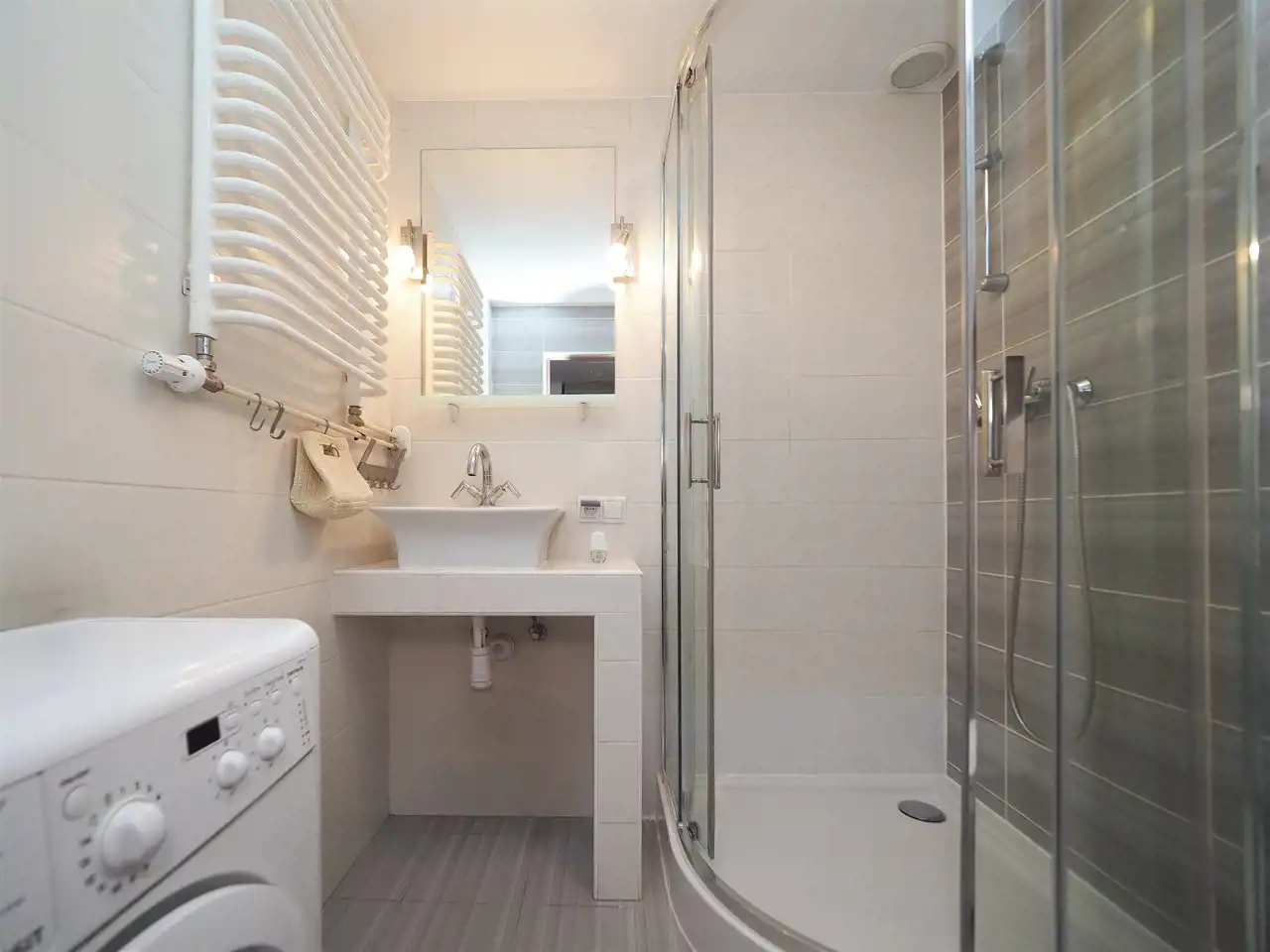 – a bathroom with a washing machine and a shower