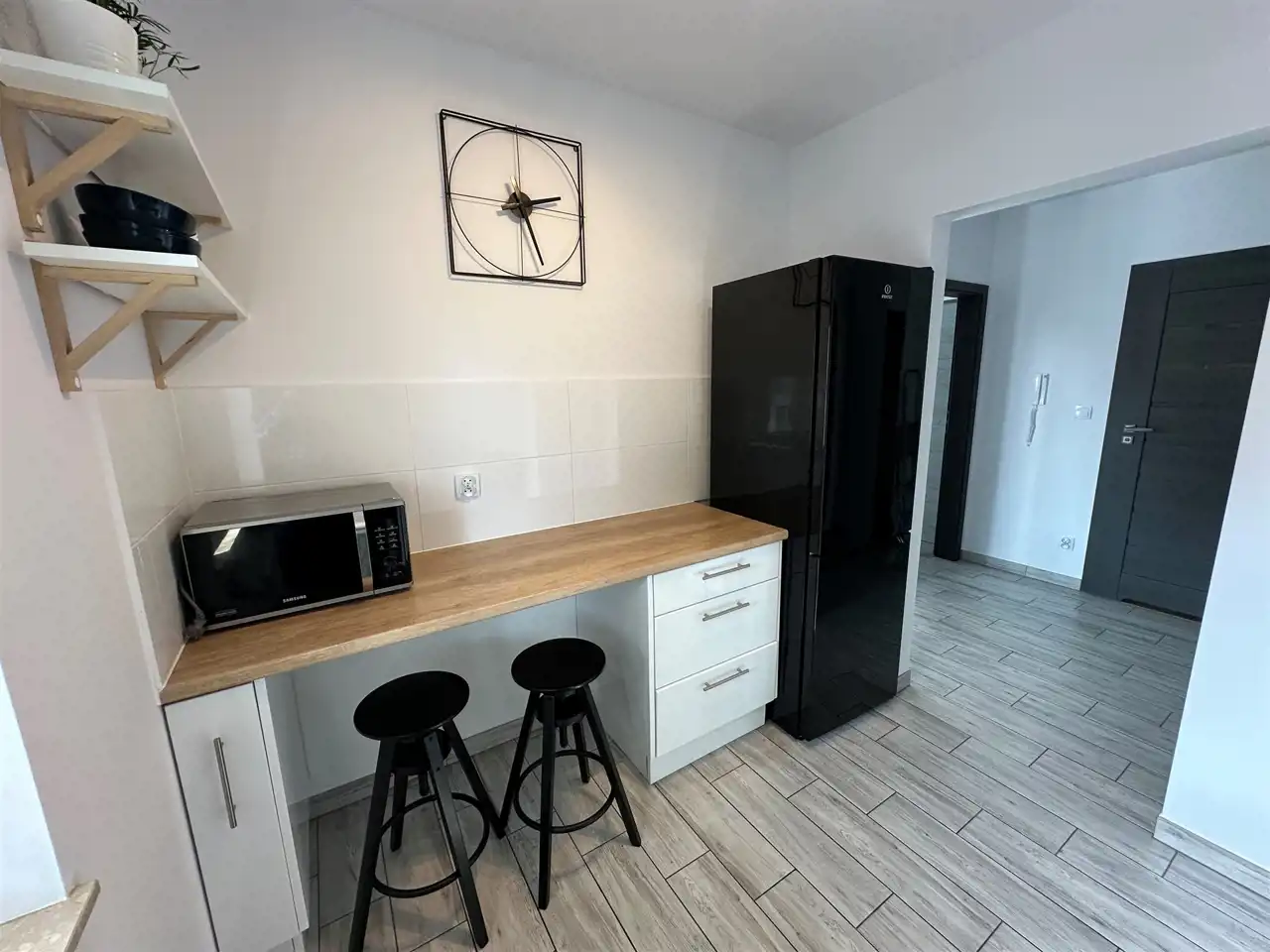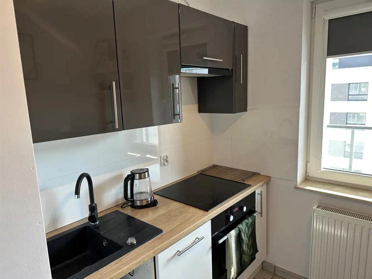 4. Kuchnia ok. 7 m2 [zabudowa meblowa, lodówka, zmywarka, piekarnik, płyta indukcyjna, okap, mikrofalówka, czajnik elektryczny]