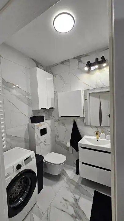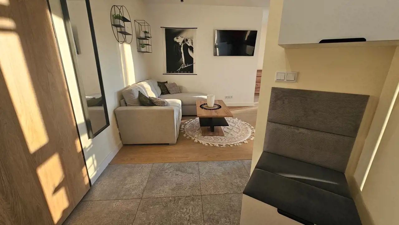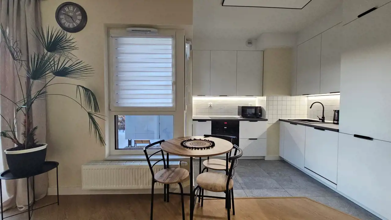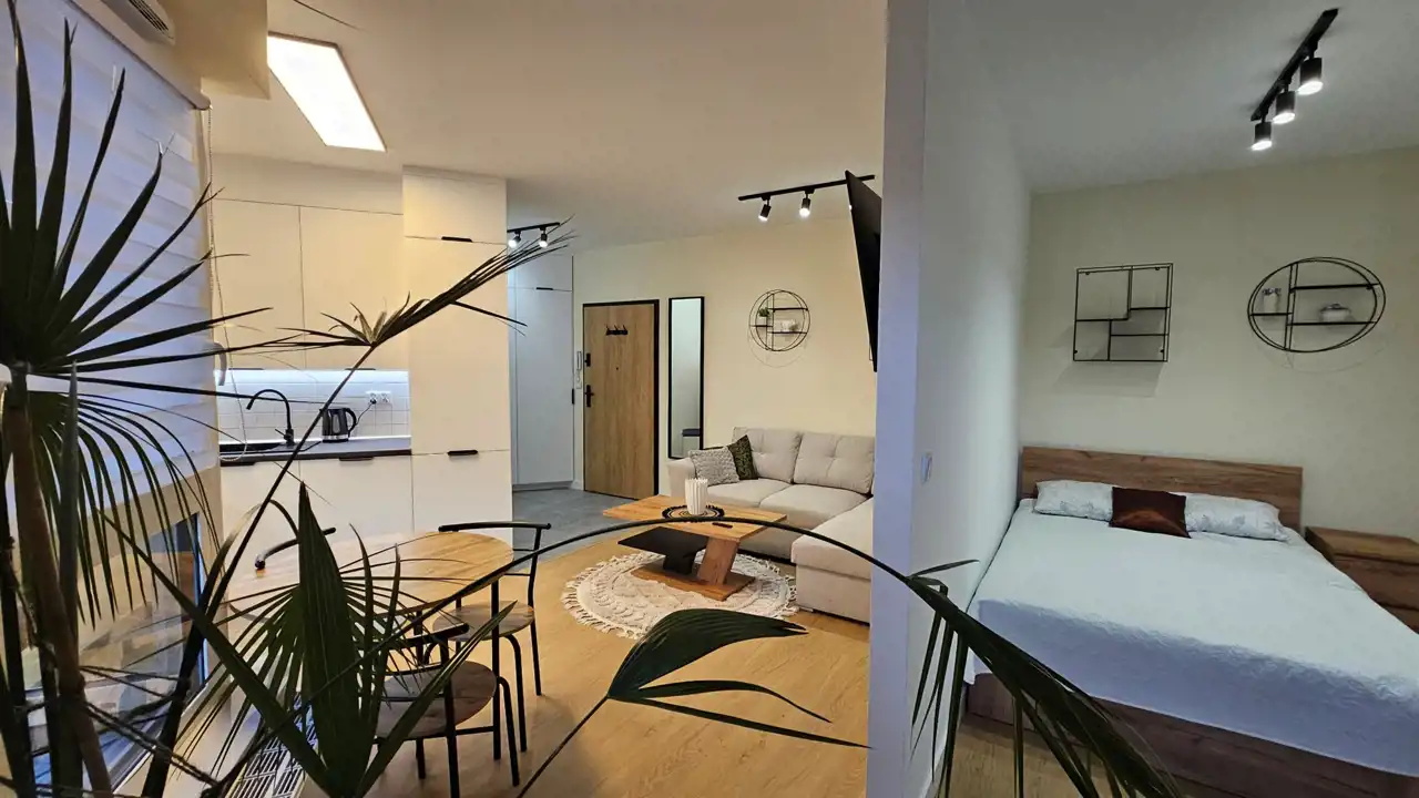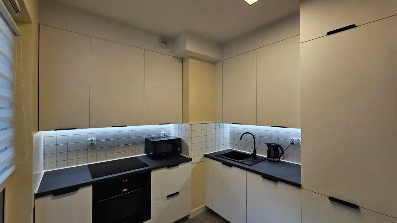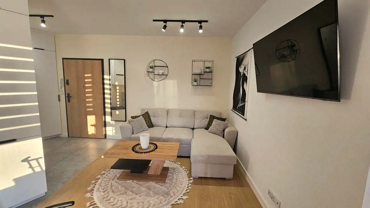 - salon połączony z kuchnią, wyposażoną w meble na wymiar i nowy sprzęt AGD (płyta indukcyjna, piekarnik, okap, lodówko-zamrażarka, zmywarka, mikrofalówka, czajnik elektryczny, odkurzacz) oraz duża rozkładana sofa, stół, ława kawowa i TV ( nowy Smart TV Samsung )