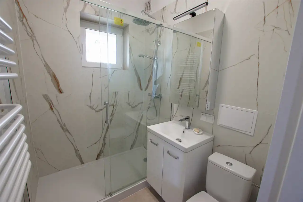 - łazienka z oknem, nowocześnie wykończona, z dużą kabiną prysznicową typu walk-in, umywalką z szafką, wc