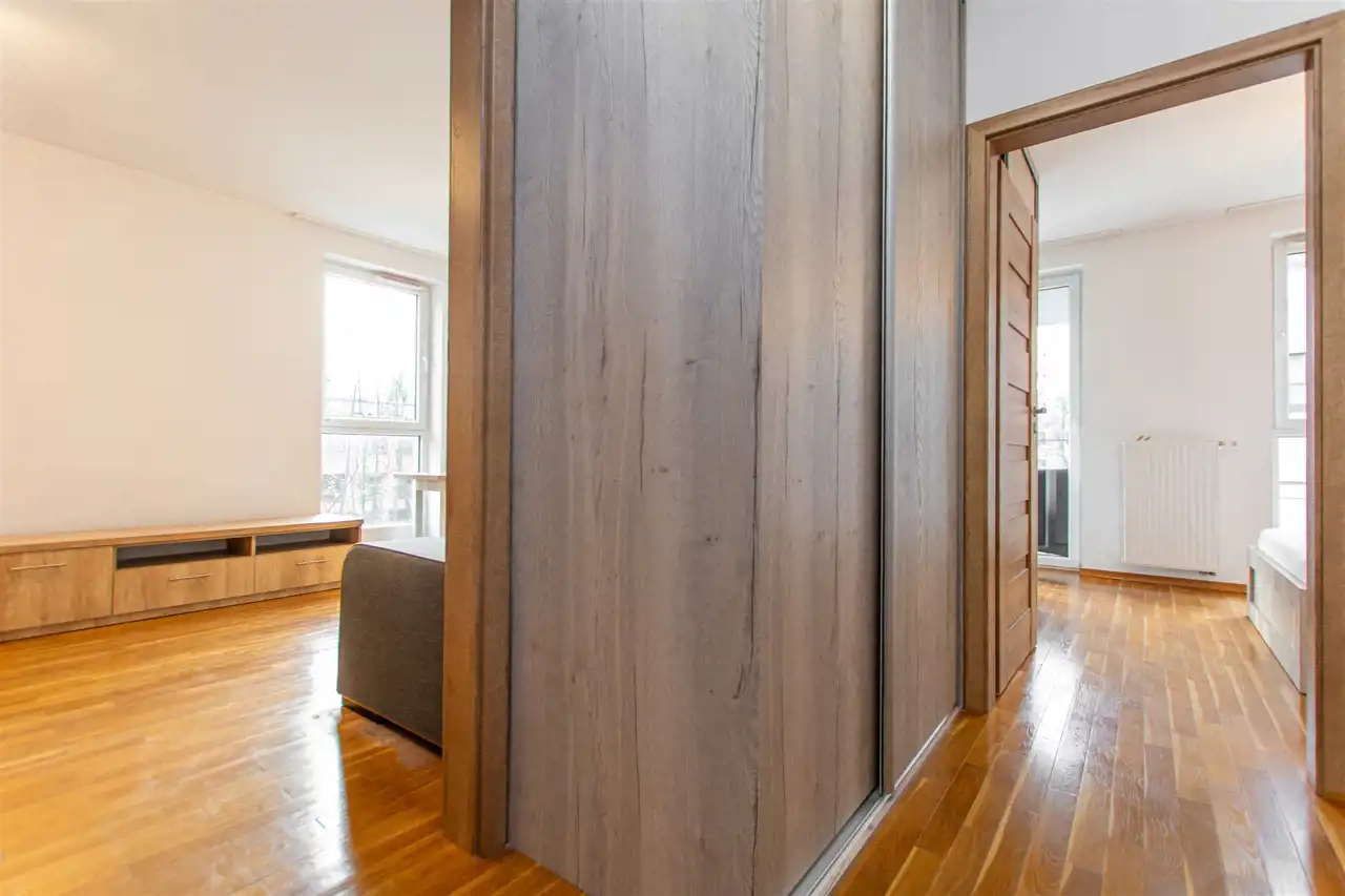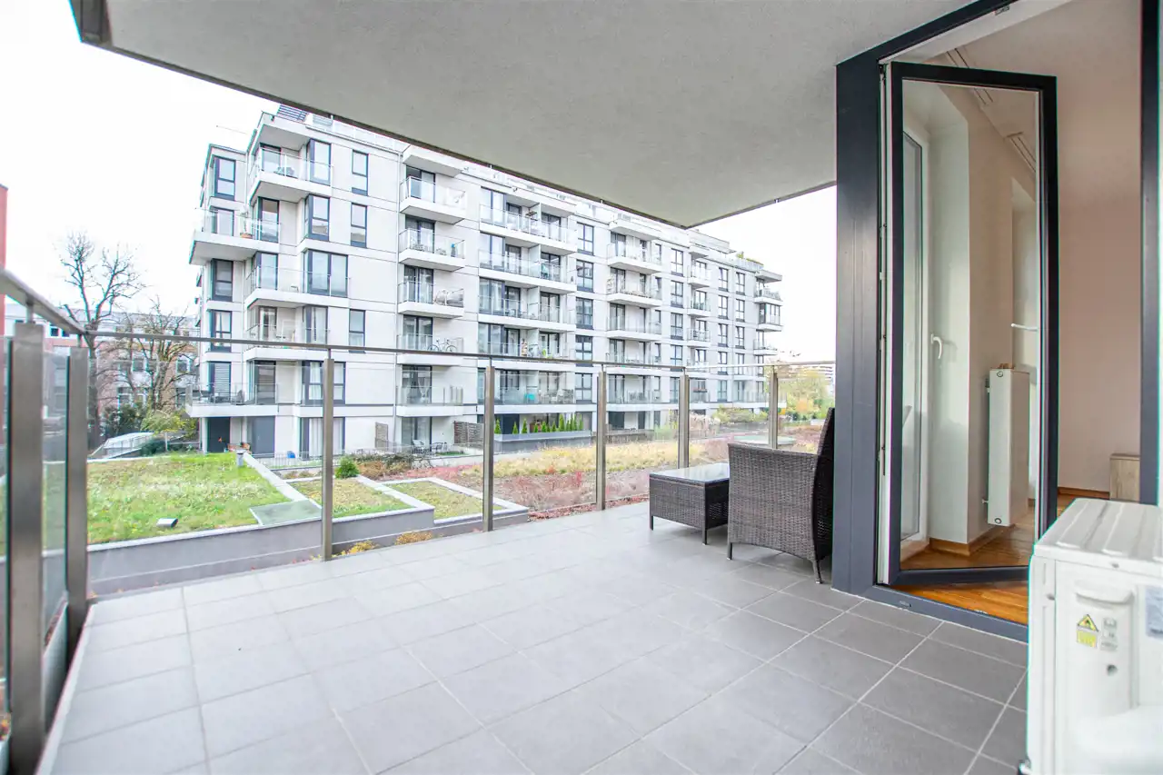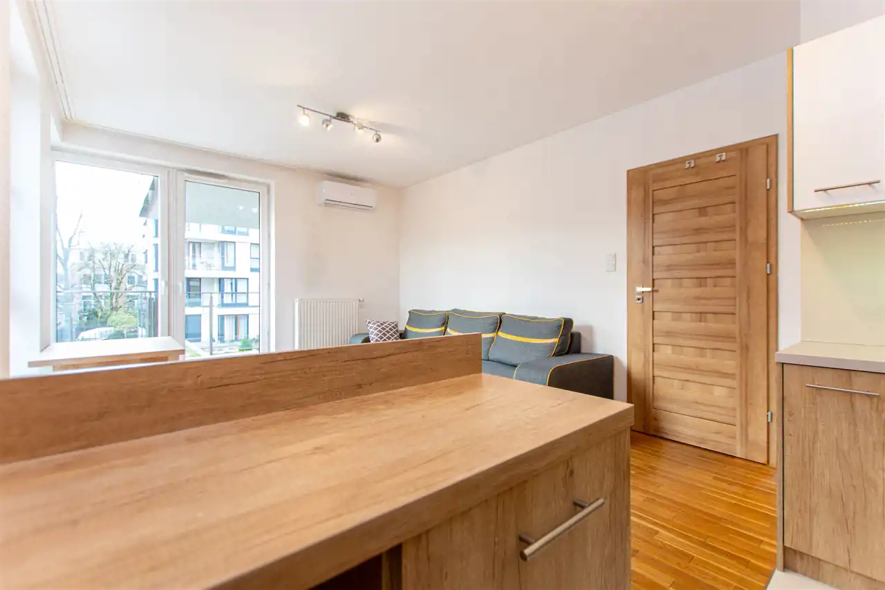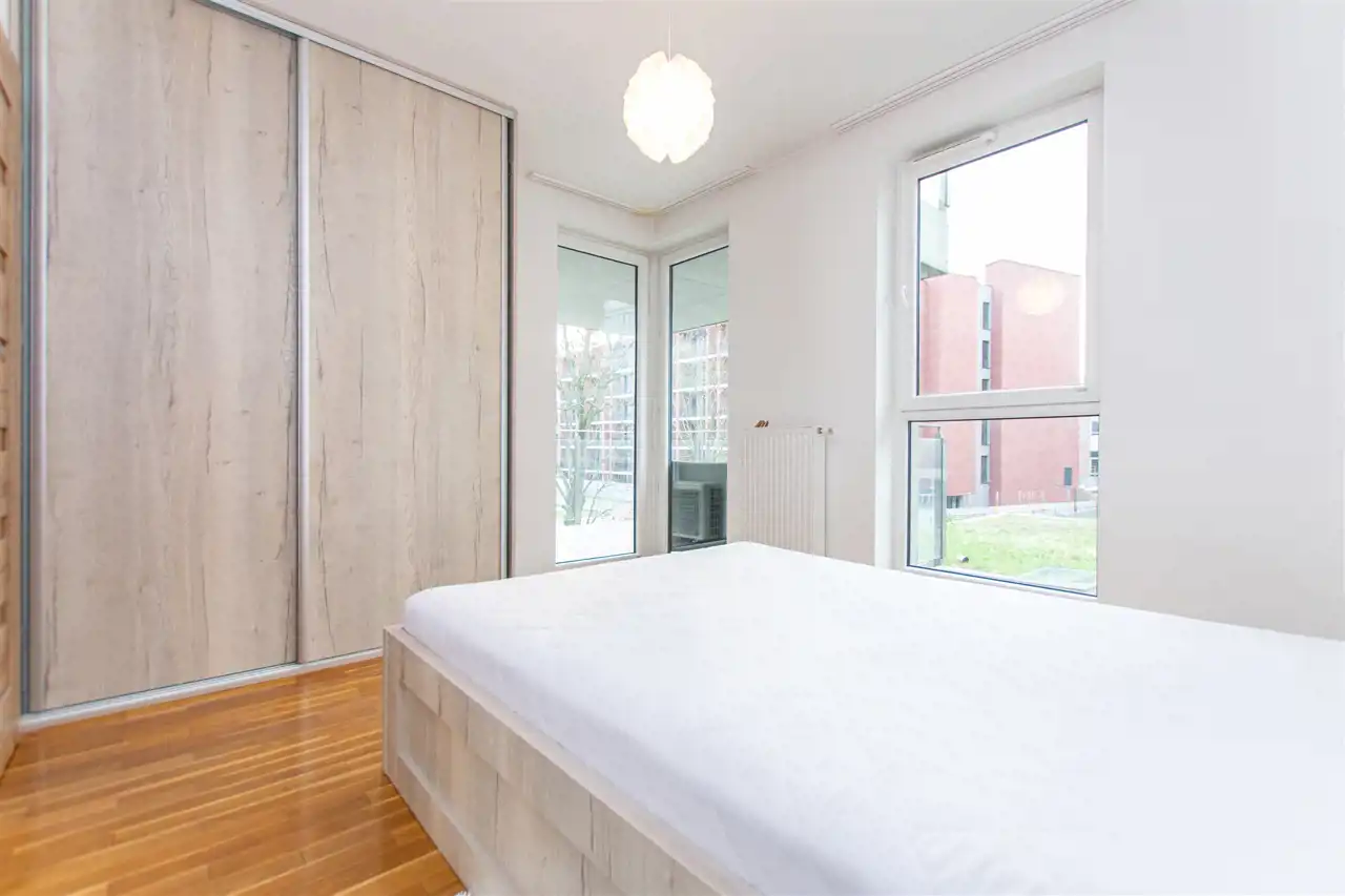 W wyposażeniu kuchennym jest  lodówka, zamrażarka, zmywarka, piekarnik, okap, płyta oraz stół z  krzesłami. Przedpokój jest wyposażony w pojemną szafę, łazienka z prysznicem. Duży balkon z dostępem z salonu i sypialni. Mieszkanie jest w pełni umeblowane i gotowe do zamieszkania. Nieruchomość jest wyposażona w żelazko, deskę do prasowania, suszarkę oraz meble balkonowe.