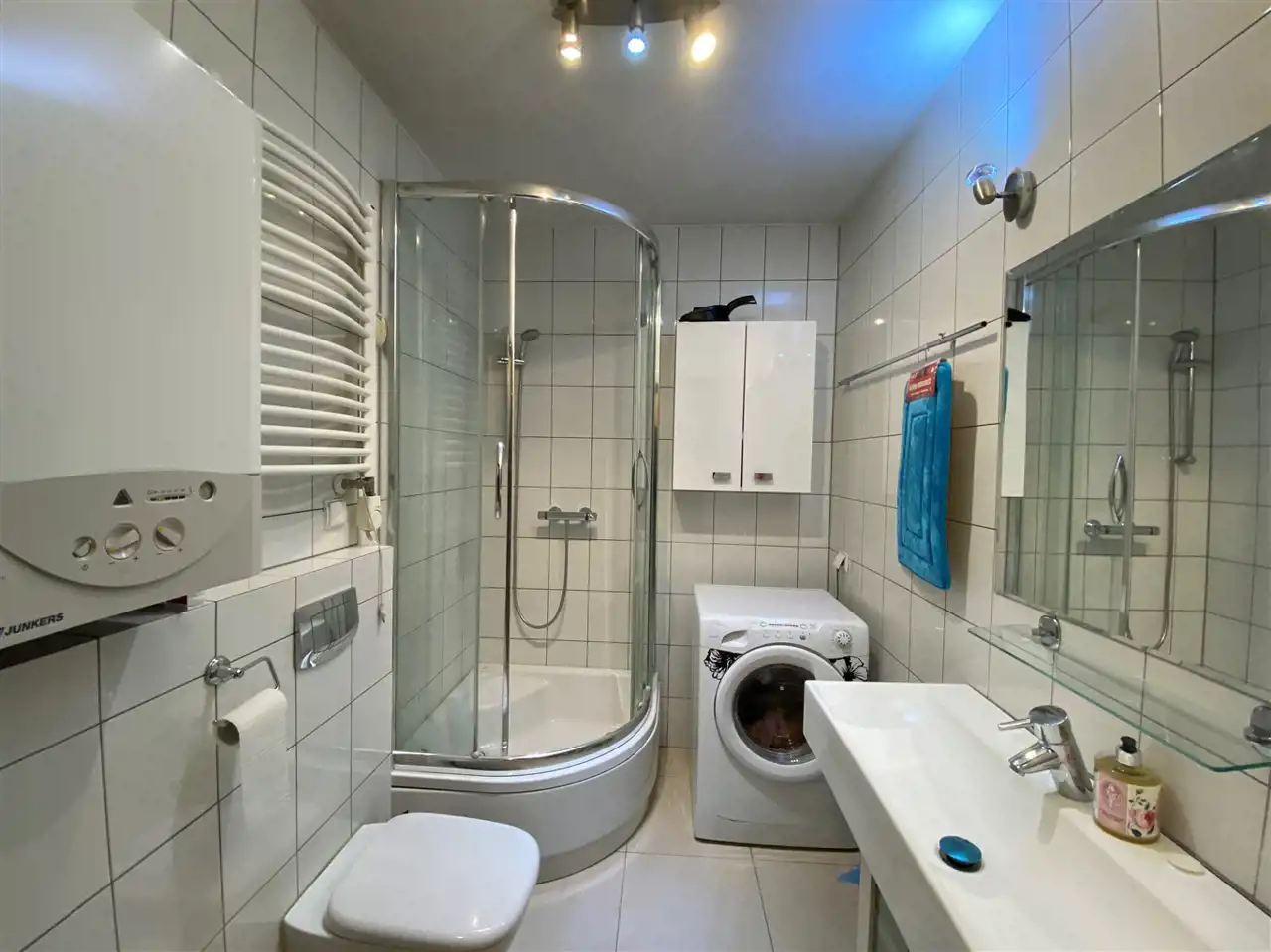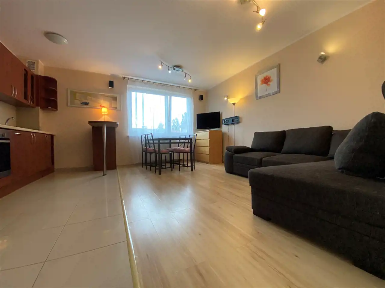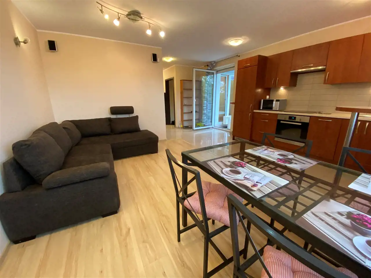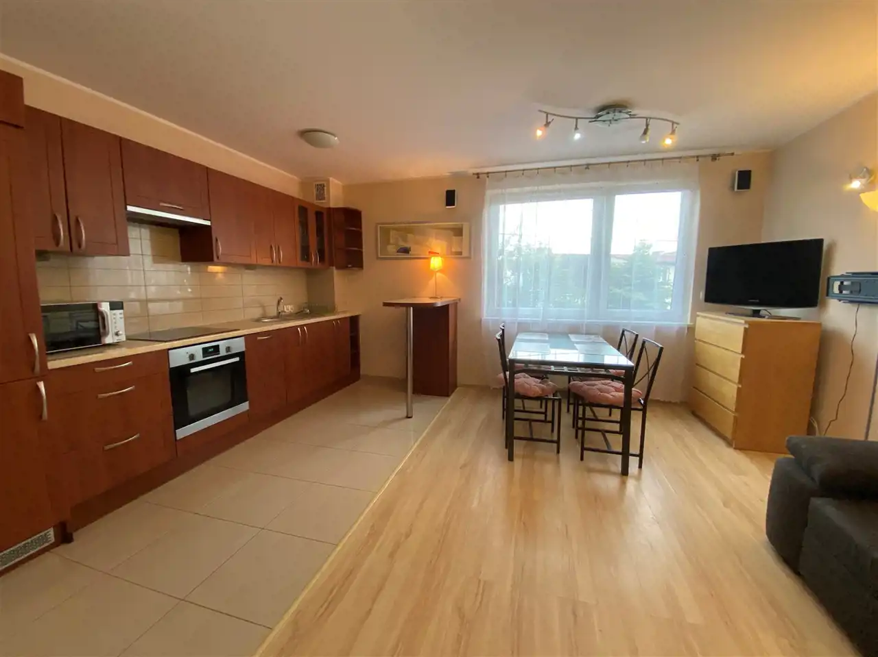 Mieszkanie o powierzchni 50m2 składa się z przedpokoju, łazienki, salonu z aneksem kuchennym oraz sypialni i balkonu. I piętro. Mieszkanie umeblowane i wyposażone, w łazience prysznic, w oknach rolety antywłamaniowe, w salonie sofa, stół, krzesła. W kuchni zabudowa kuchenna, lodówka, piekarnik, płyta, okap, zmywarka, mikrofalówka. W sypialni łóżko oraz duża pojemna szafa wnękowa i komoda. Kameralny blok. Mieszkanie ogrzewane piecem gazowym. W łazience dodatkowo ogrzewanie podłogowe. W mieszkaniu został zamontowany alarm. Duża szafa wnękowa w przedpokoju.