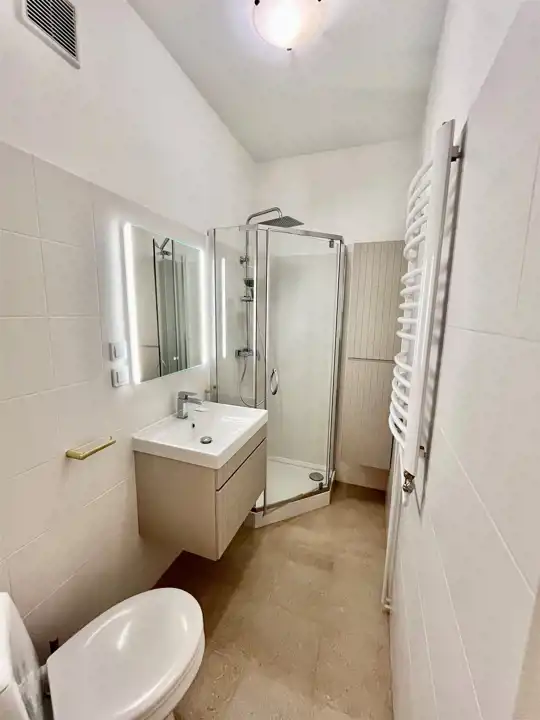 Mieszkanie składa się z przedpokoju , łazienki z prysznicem, osobnej dużej kuchni z jadalnią oraz salonu z .