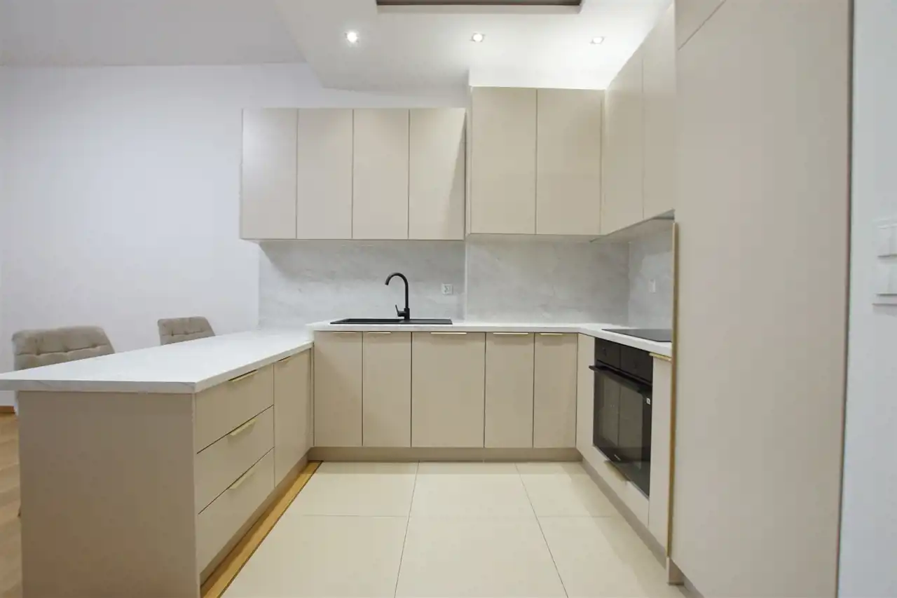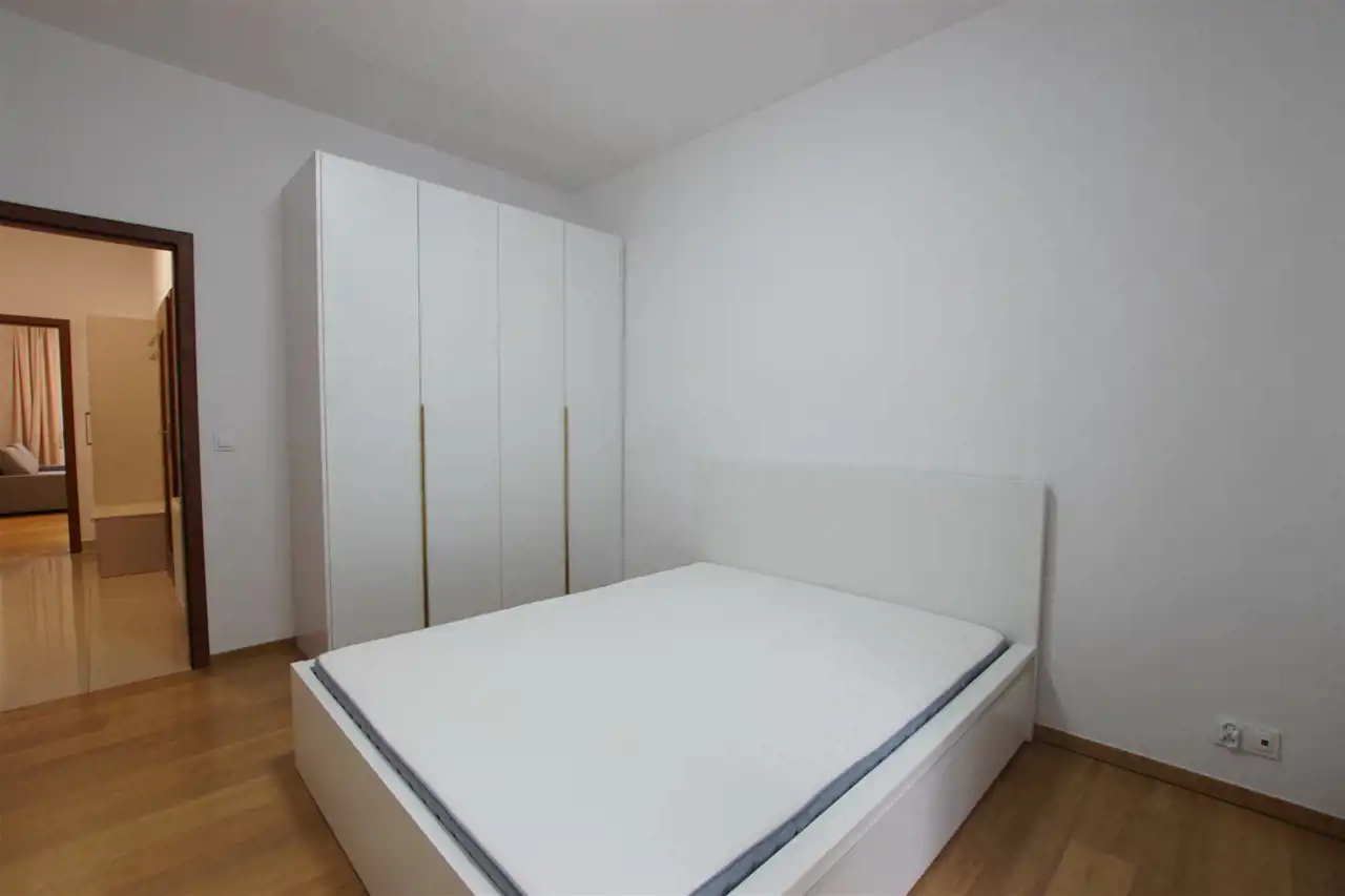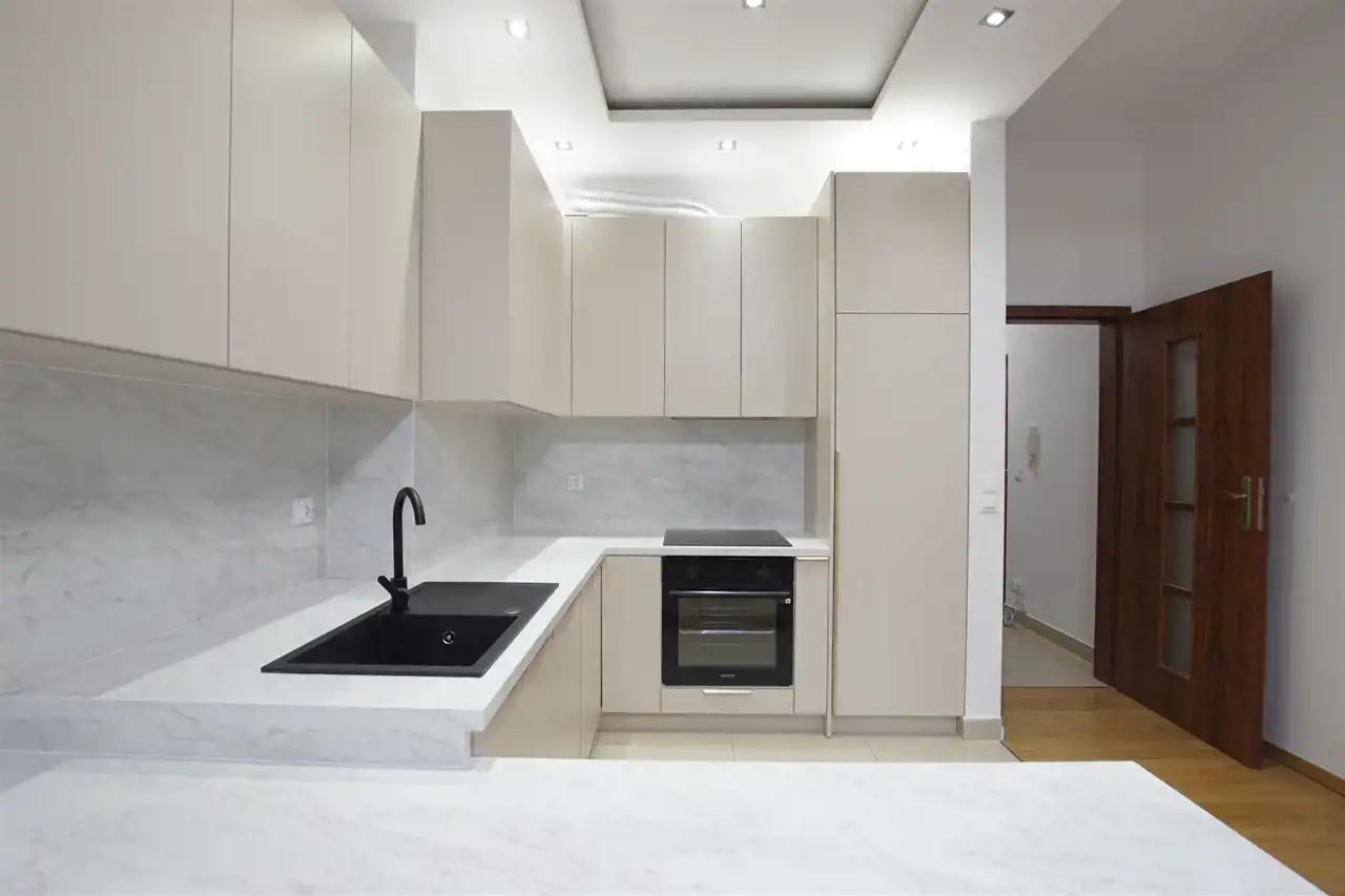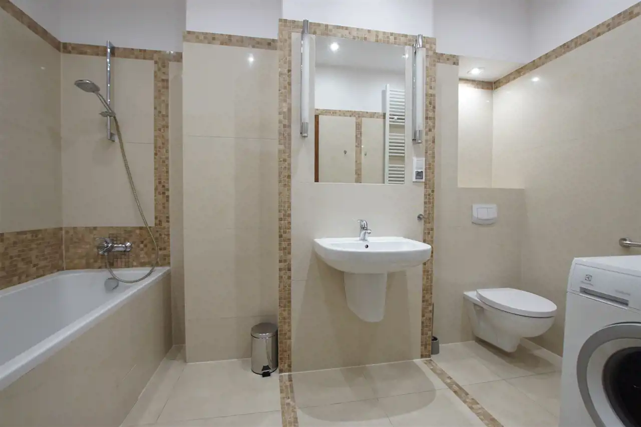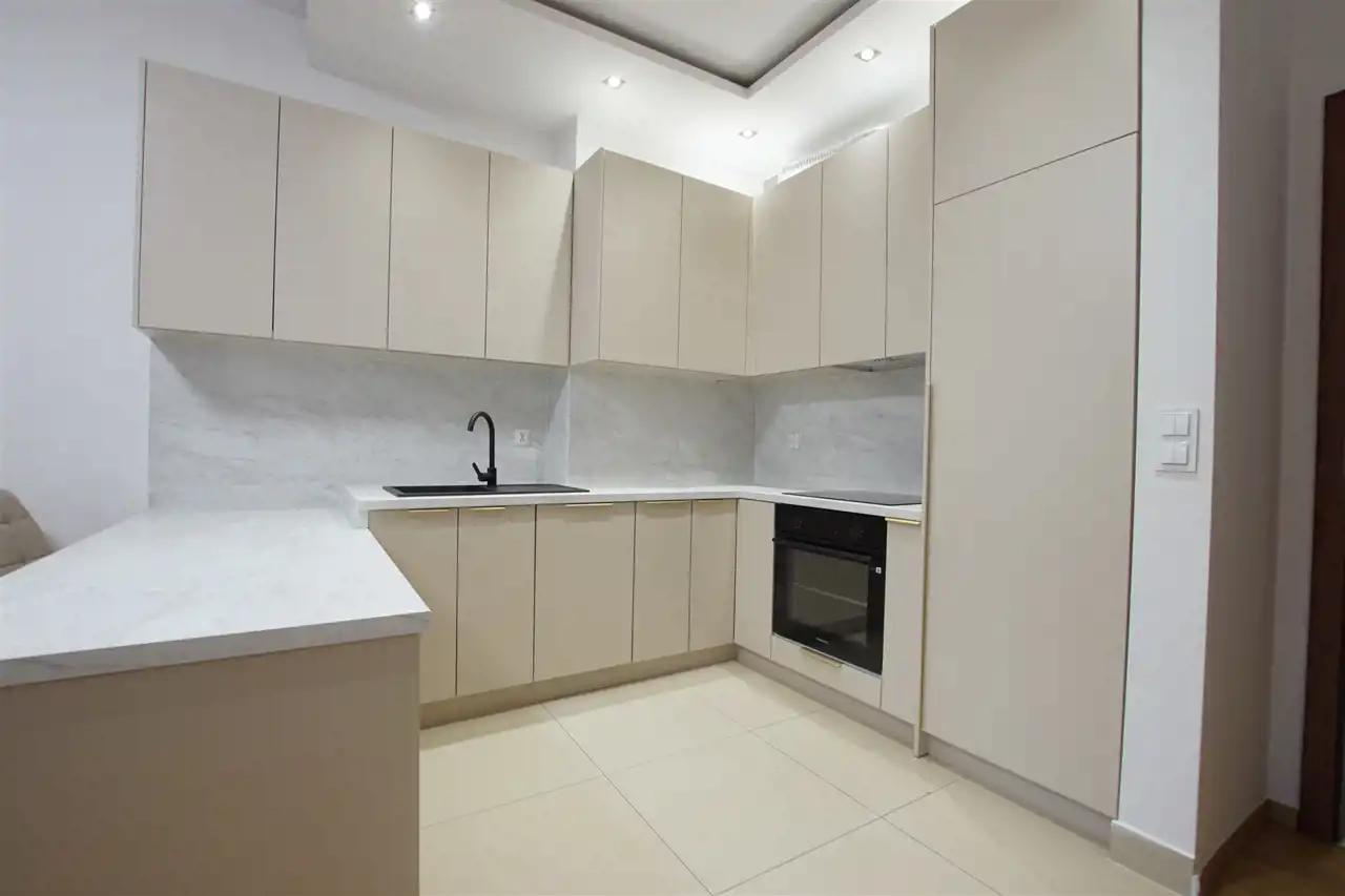 Kuchnia umeblowana i wyposażona w nowe sprzęty /meble na miarę z płytą ceramiczną, piekarnikiem elektrycznym, lodówką, zmywarką/ łazienka z wanną, jest też pralka. W sypialni duże szafy w zabudowie oraz duże łóżko 160cm.