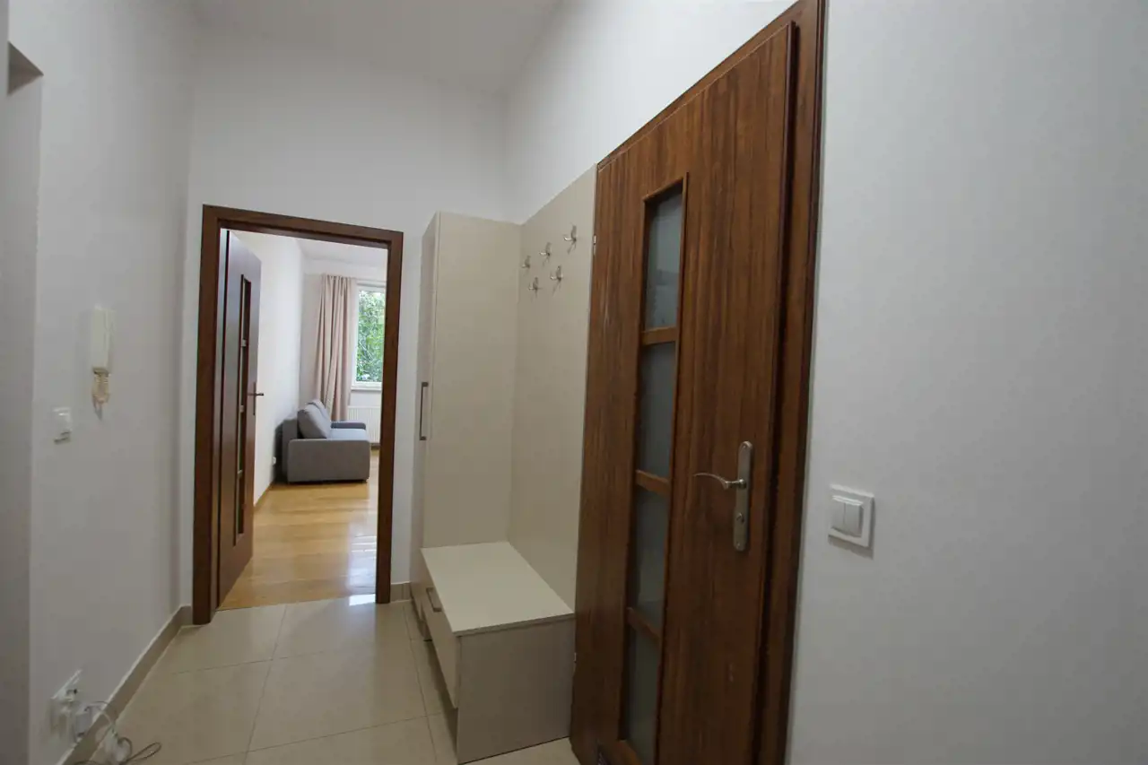 Mieszkanie składa się z pokoju dziennego z aneksem kuchennym, osobnej sypialni z balkonem od podwórka, łazienki i przedpokoju.