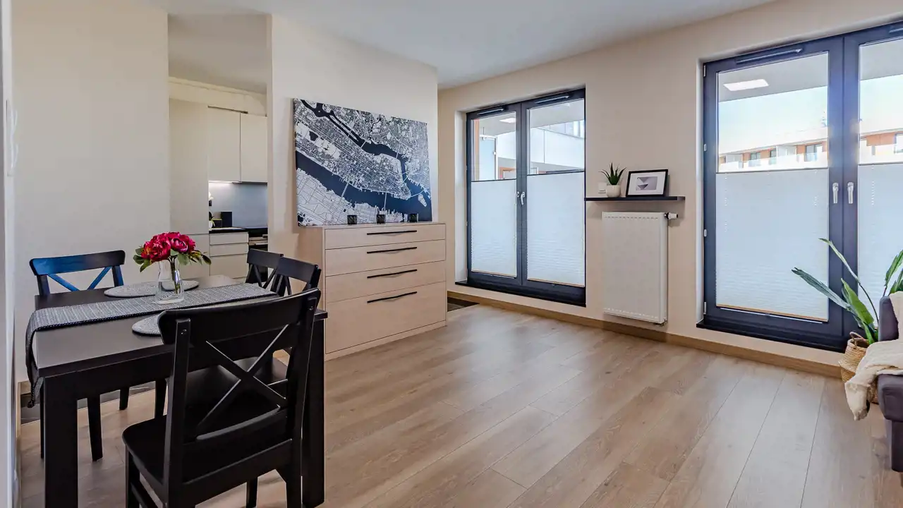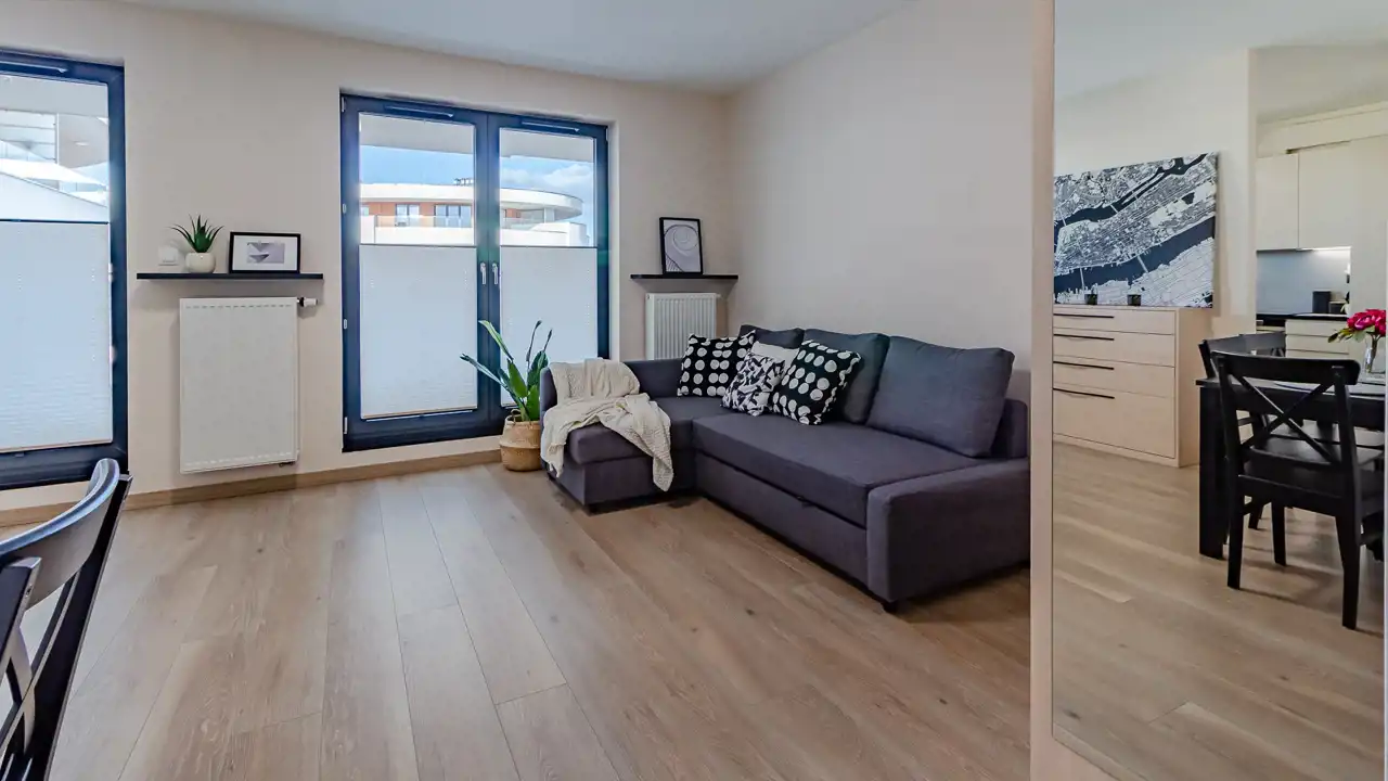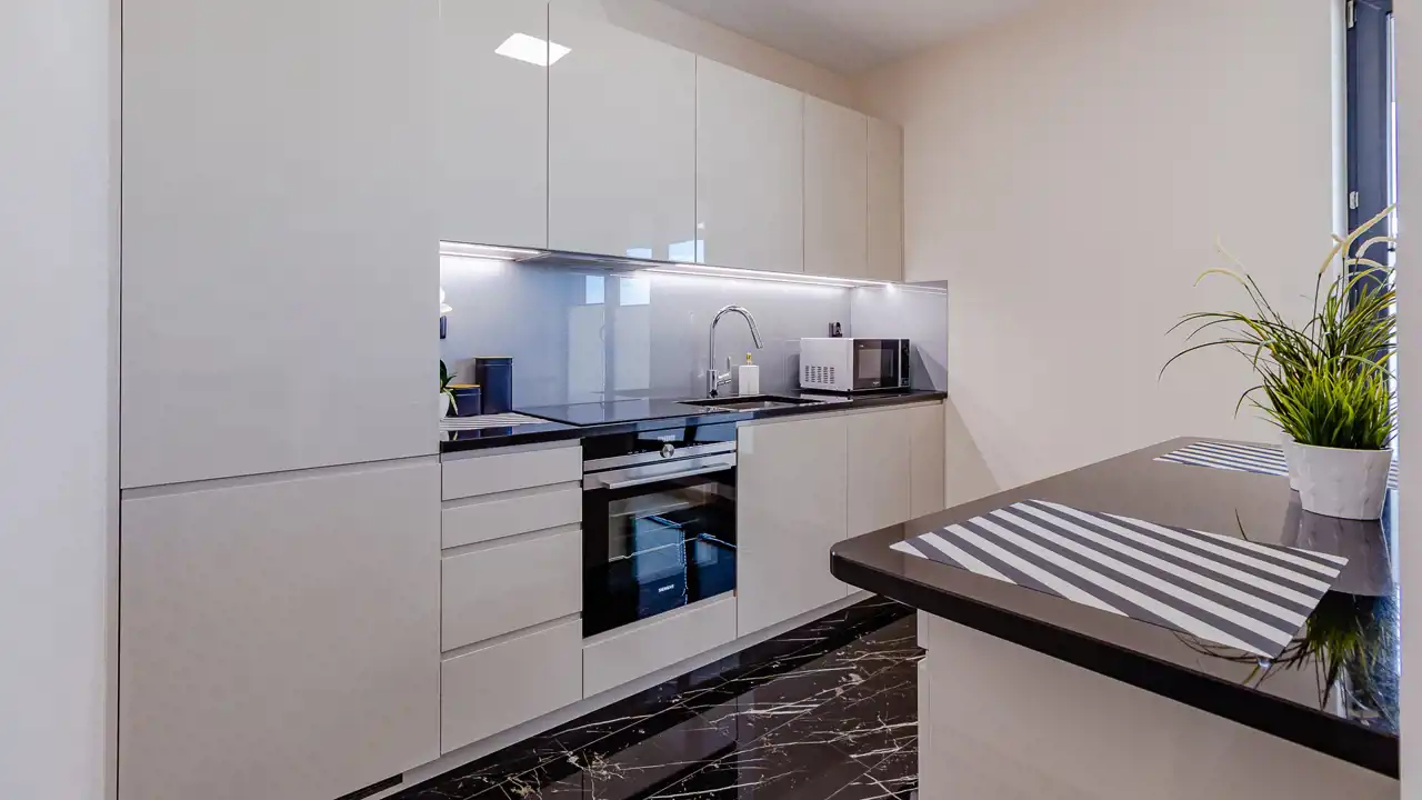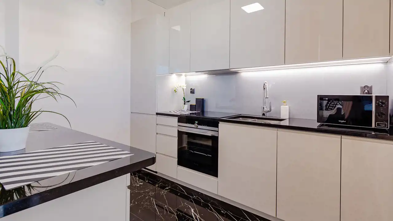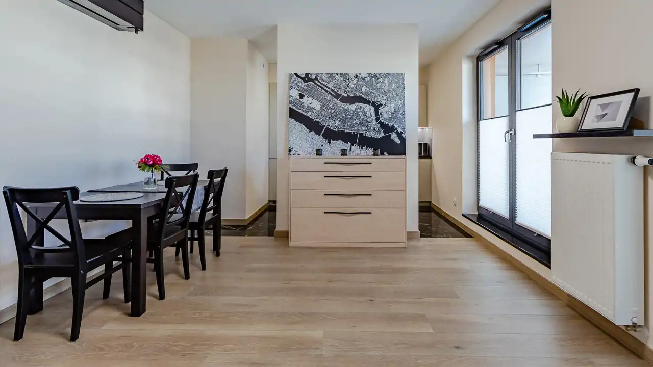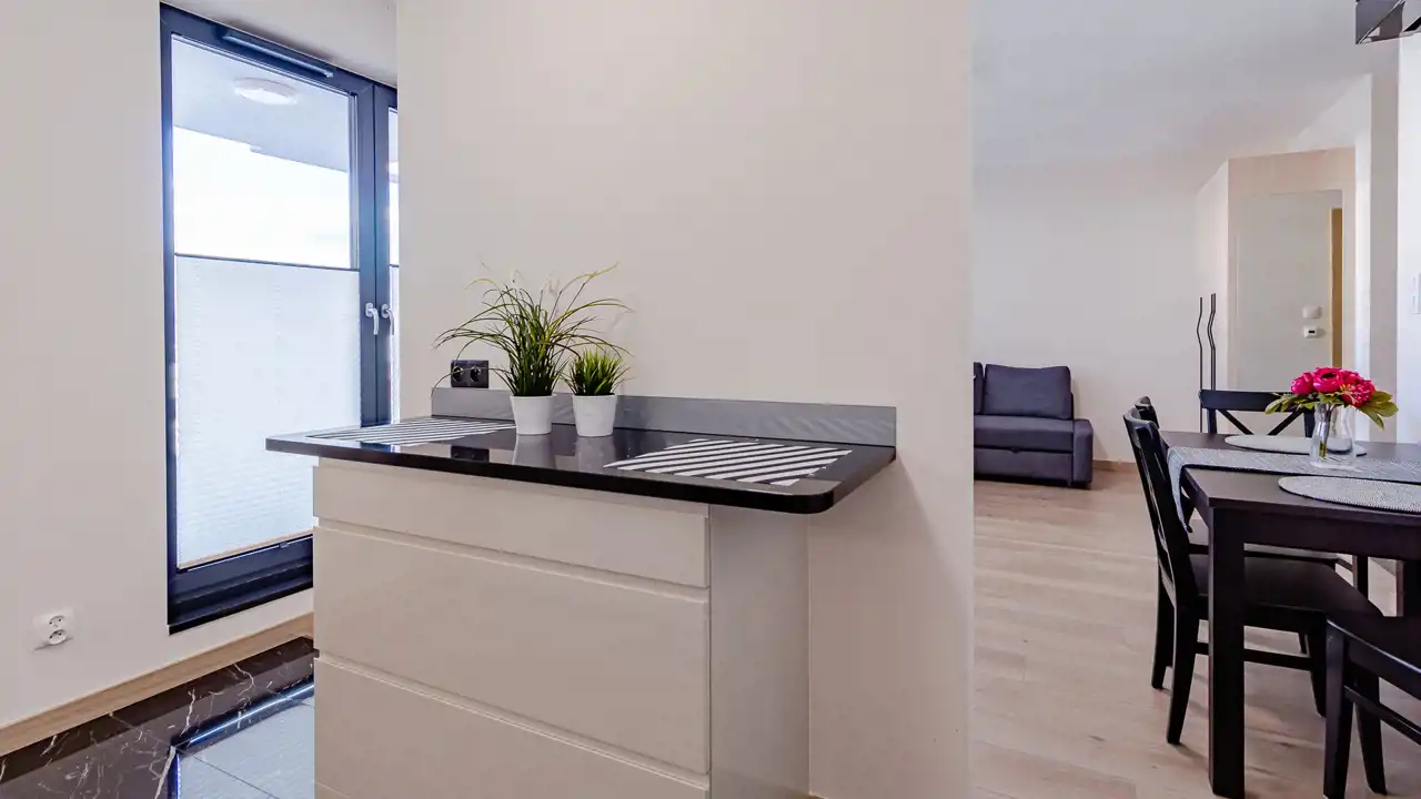 Mieszkanie o pow. 37 m2 wykończone w wysokim standardzie. Elegancka kuchnia wyposażona w zmywarkę, płytę indukcyjną, dużą lodówkę z zamrażalką, okap oraz piekarnik. Kuchnia częściowo otwarta na resztę mieszkania.