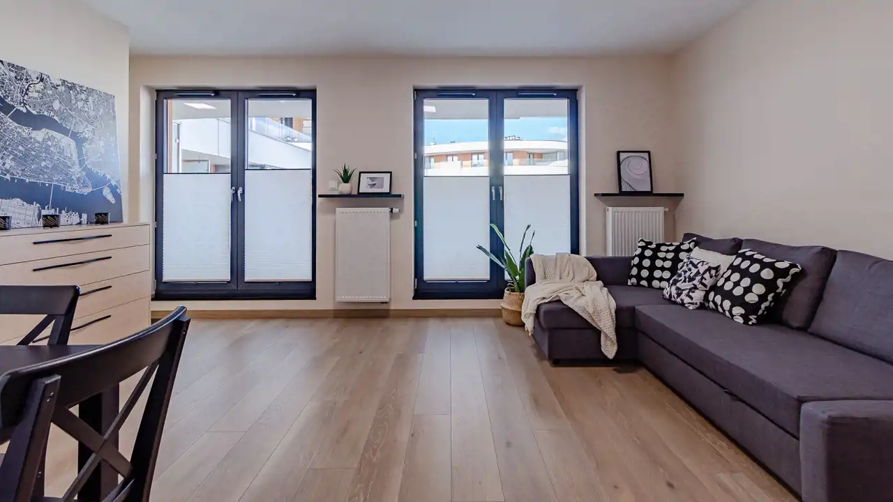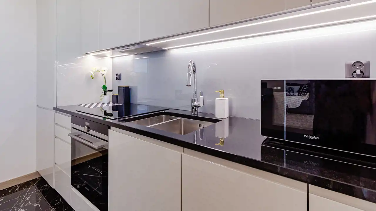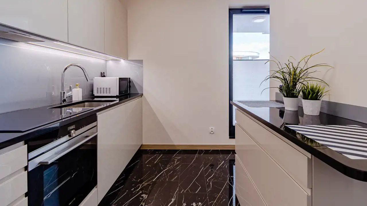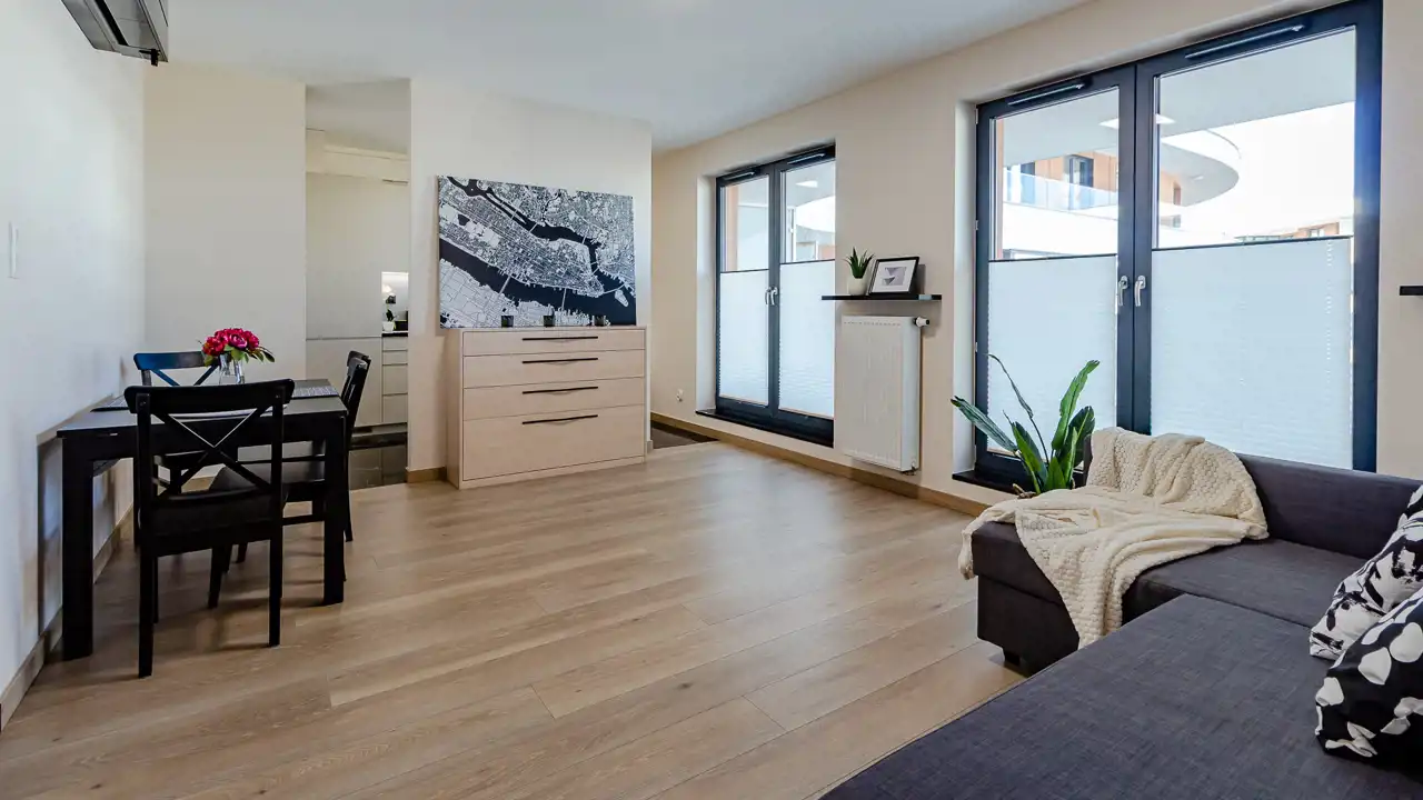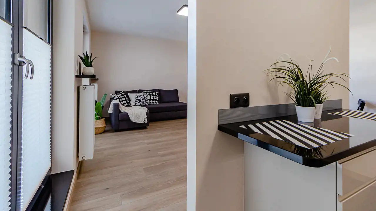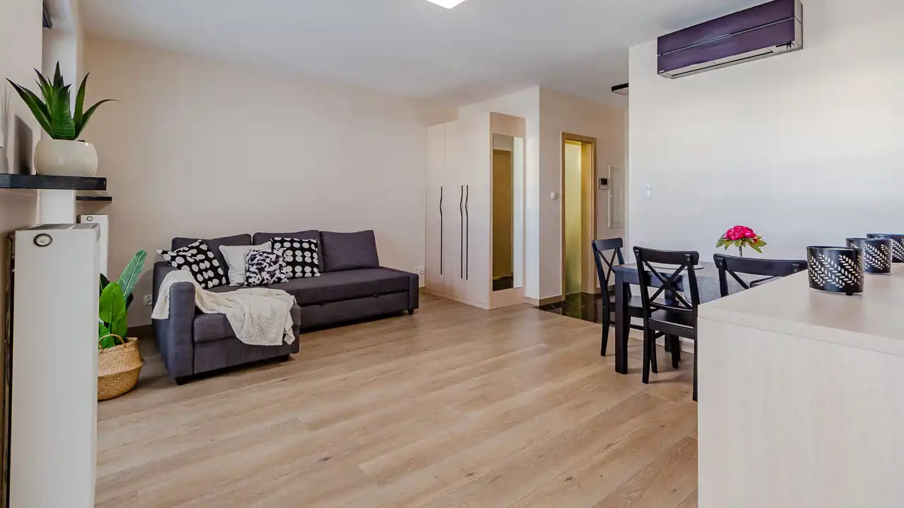 Mieszkanie o pow. 37 m2 wykończone w wysokim standardzie. Elegancka kuchnia wyposażona w zmywarkę, płytę indukcyjną, dużą lodówkę z zamrażalką, okap oraz piekarnik. Kuchnia częściowo otwarta na resztę mieszkania.
