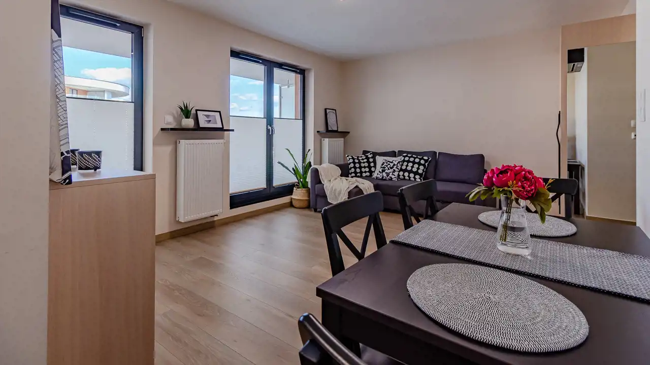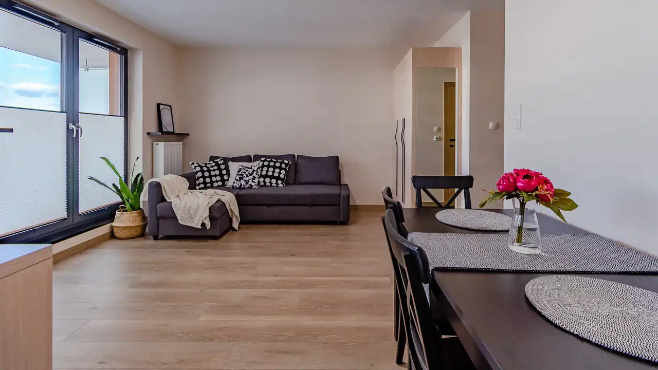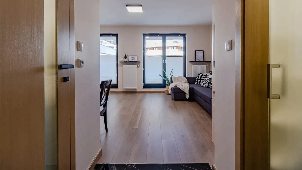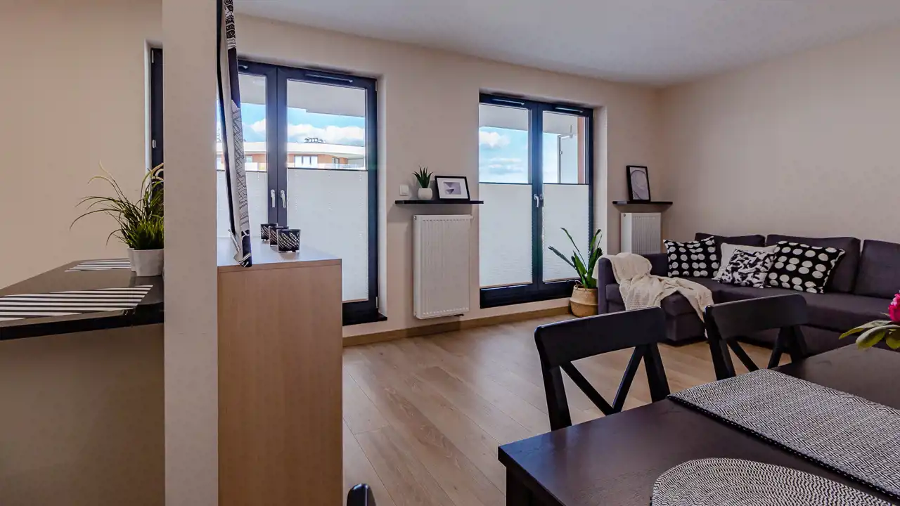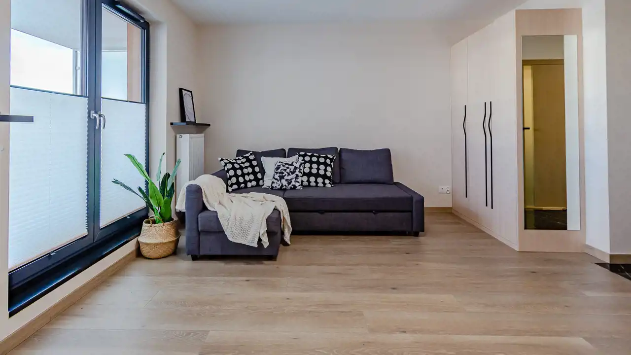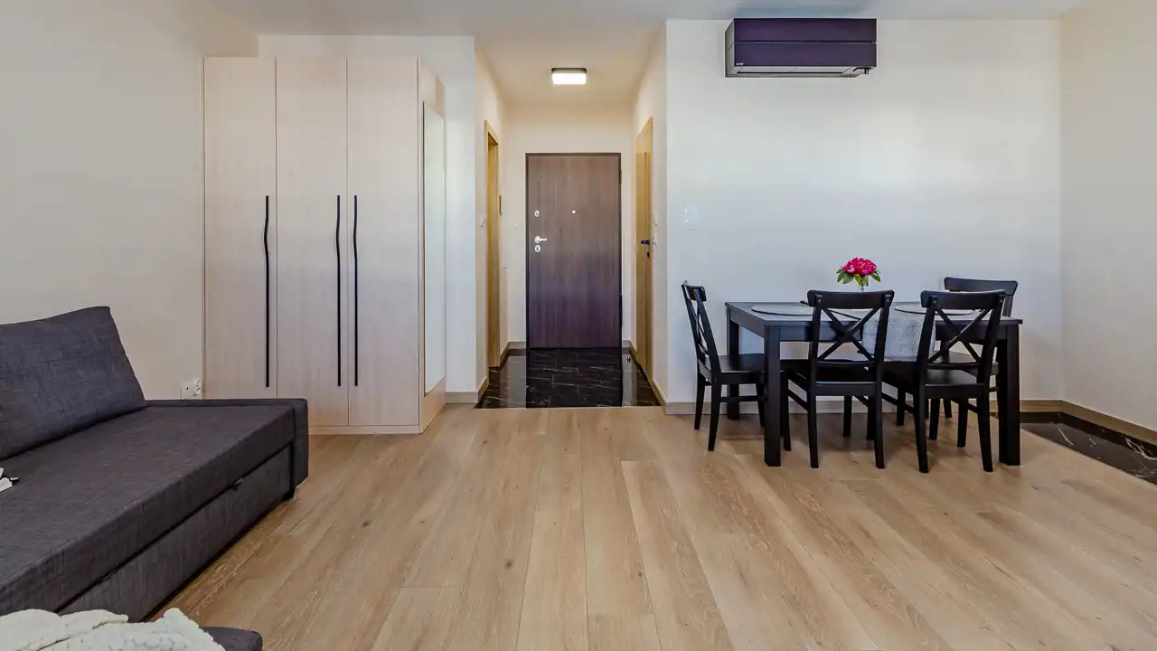 Mieszkanie o pow. 37 m2 wykończone w wysokim standardzie. Elegancka kuchnia wyposażona w zmywarkę, płytę indukcyjną, dużą lodówkę z zamrażalką, okap oraz piekarnik. Kuchnia częściowo otwarta na resztę mieszkania.