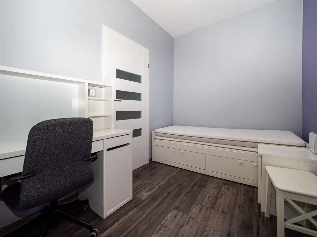 Pokój 1 (biuro) z rozkładanym łóżkiem, biurkiem, zabudowaną szafą, routerem