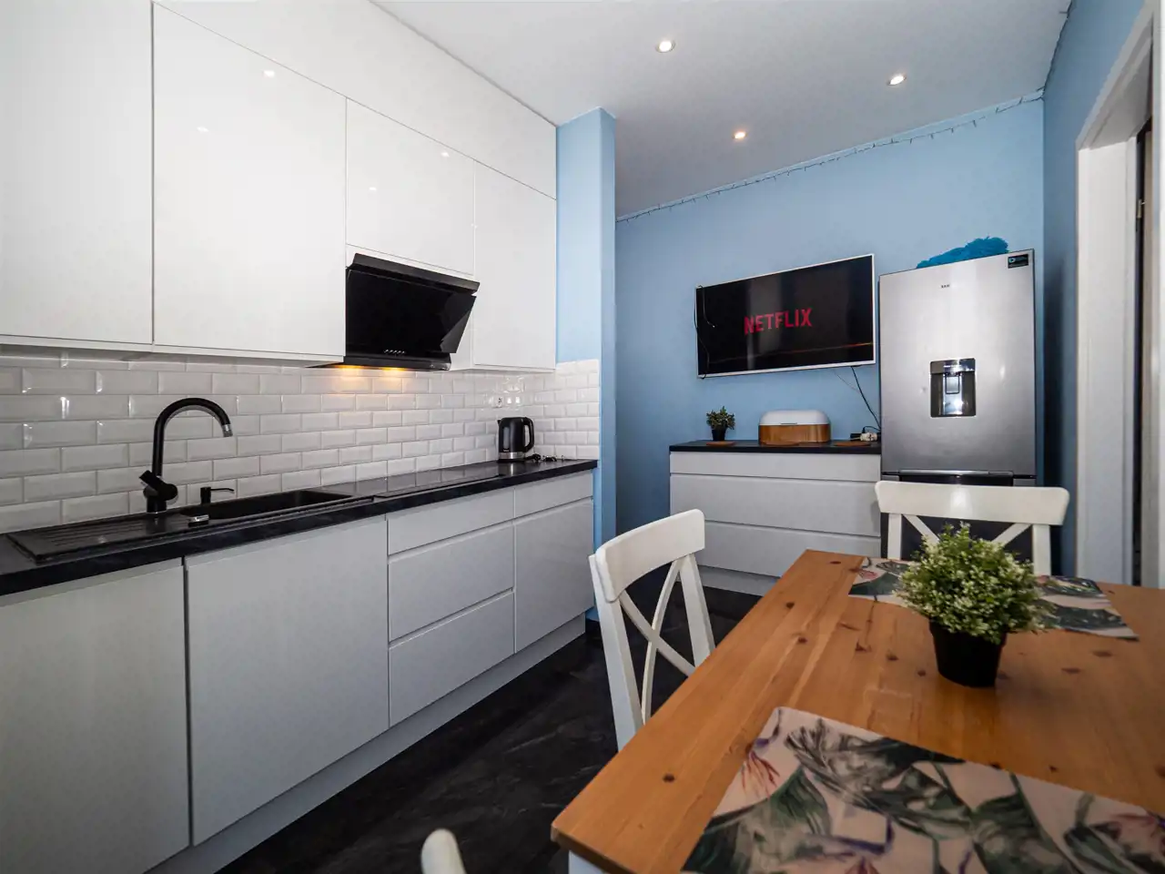 W pełni wyposażona kuchnia (lodówka, piekarnik, płyta grzewcza, mikrofalówka, zmywarka, telewizor) z wyjściem na taras (16,49 m2),