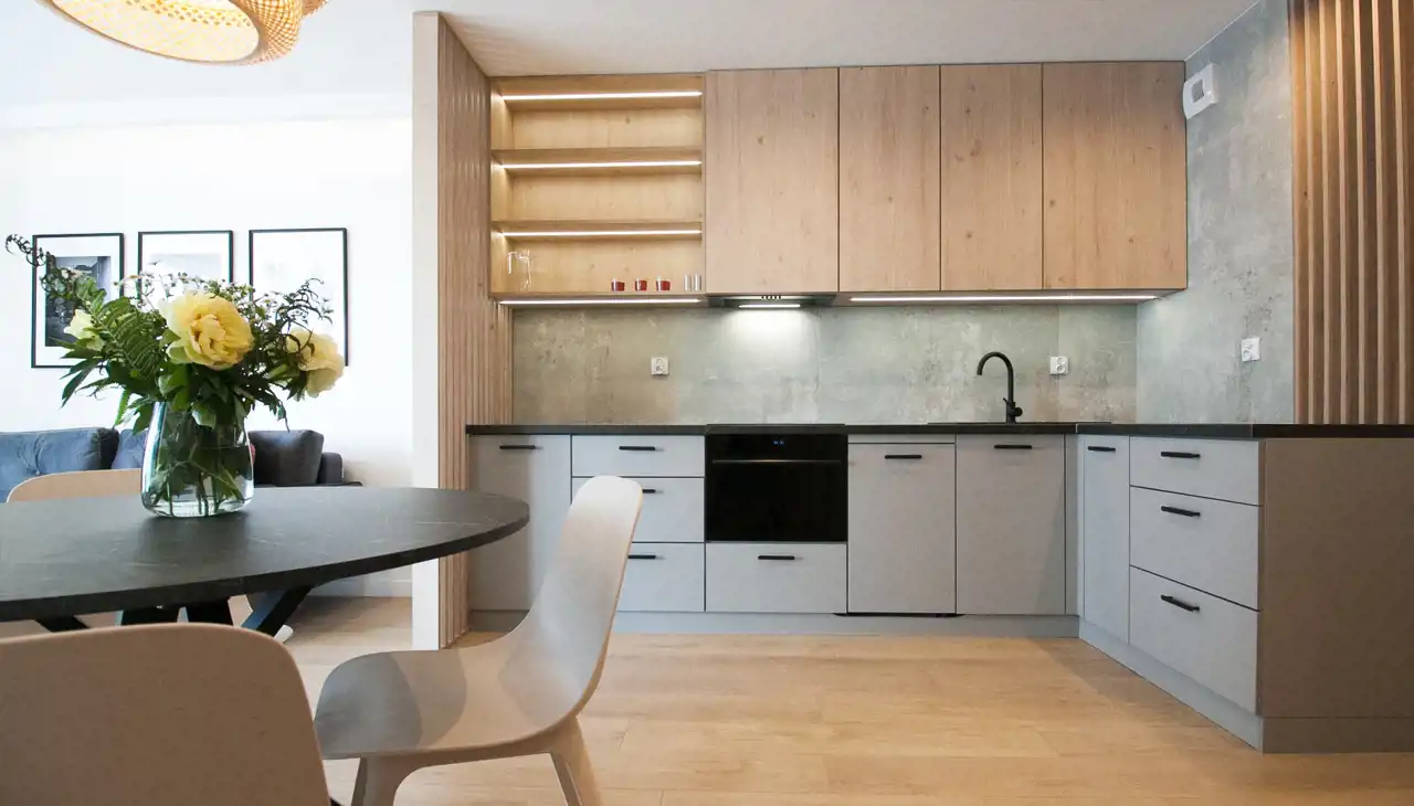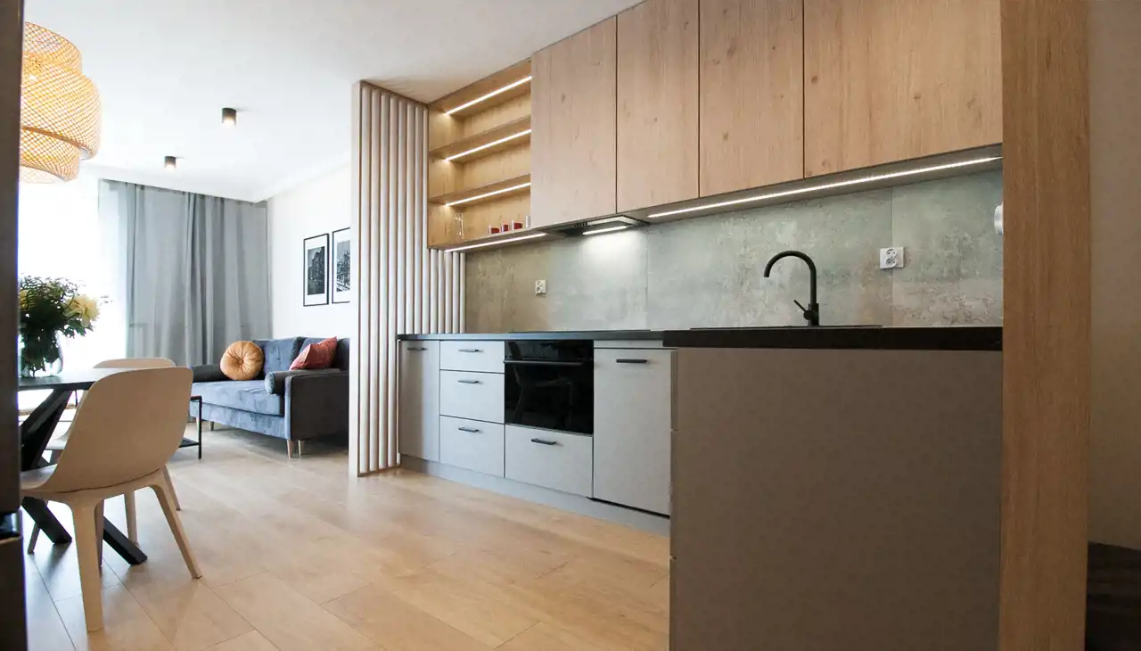 - jasnej kuchni umeblowanej i wyposażonej (zmywarka, sztućce, szklanki, garnki, itp.), otwartej i połączonej z salonem;
