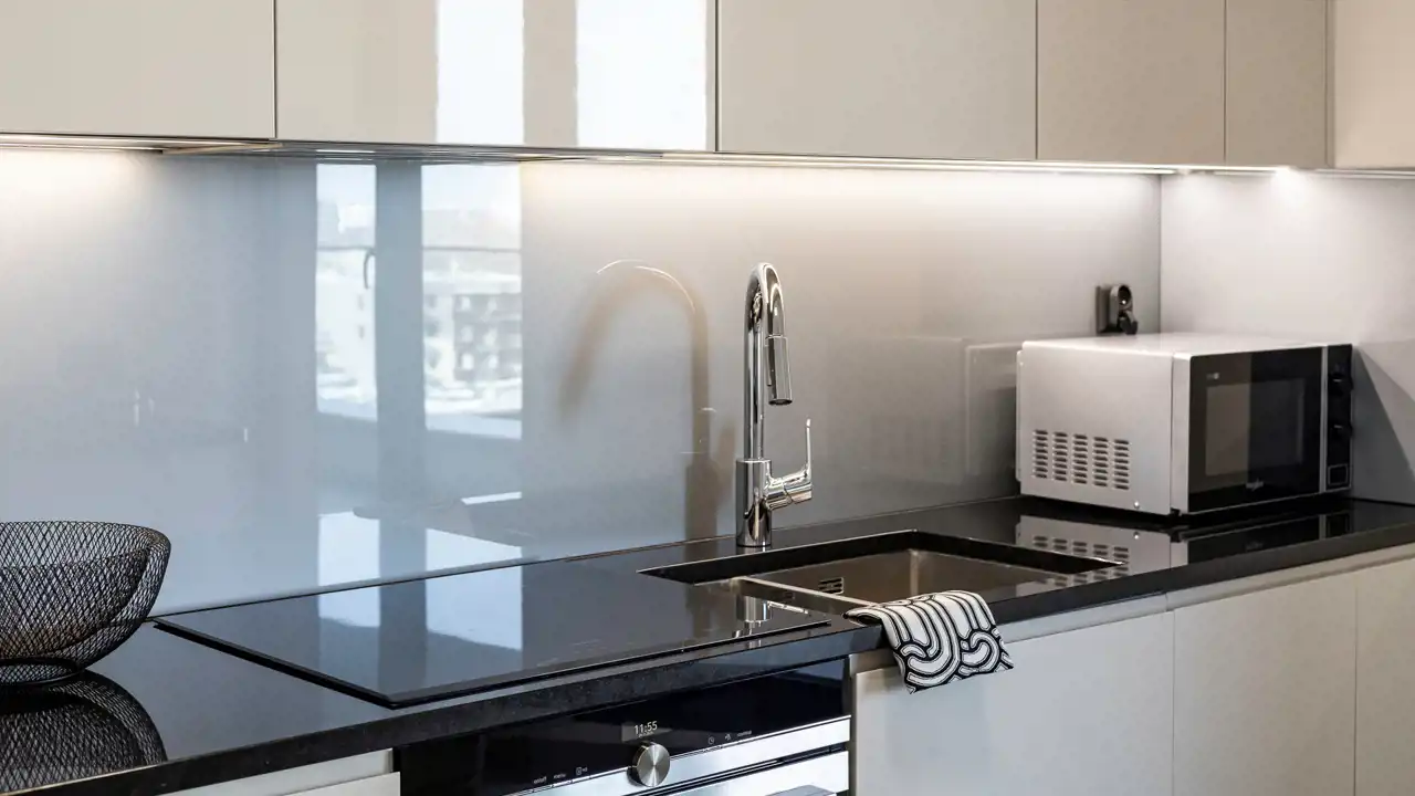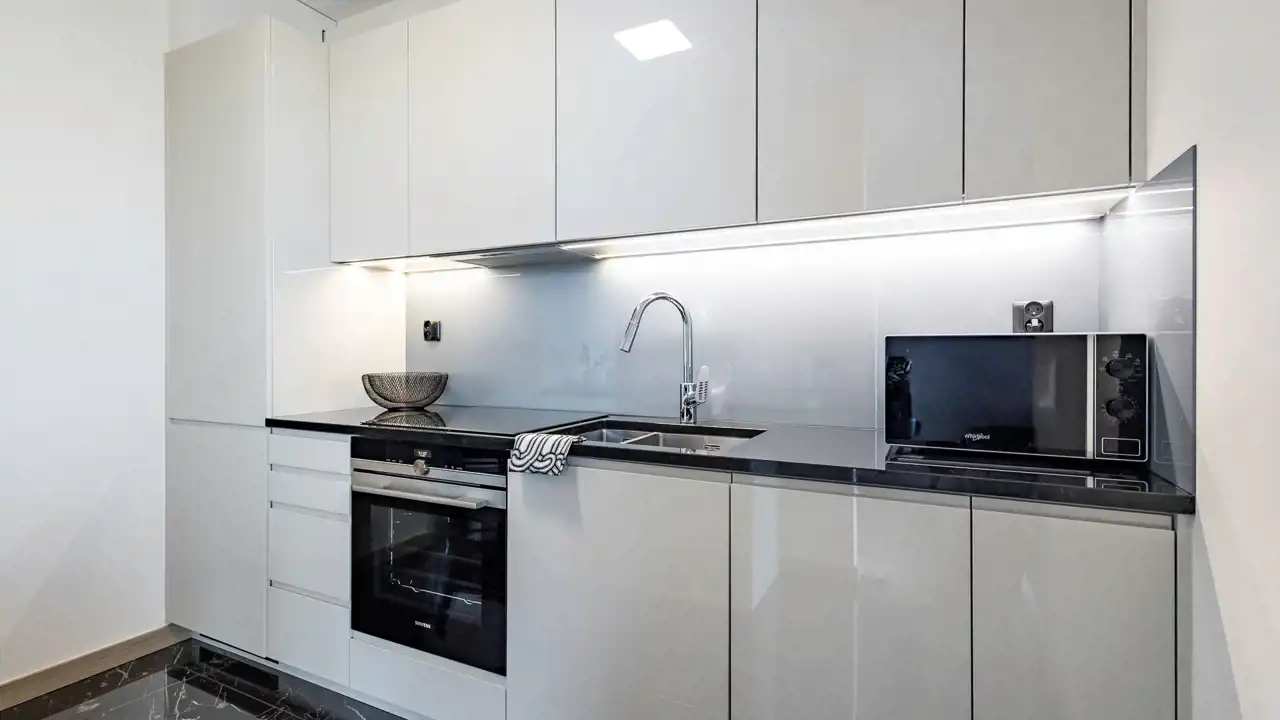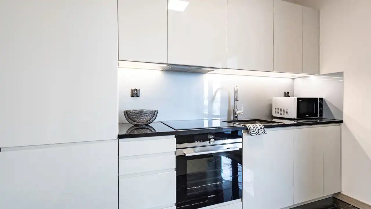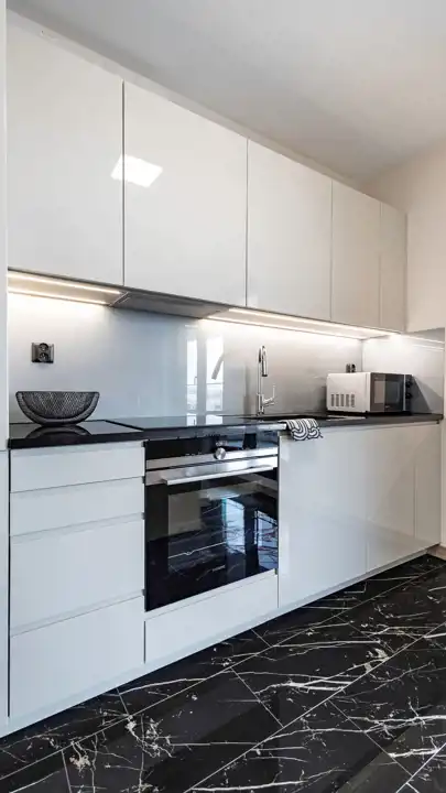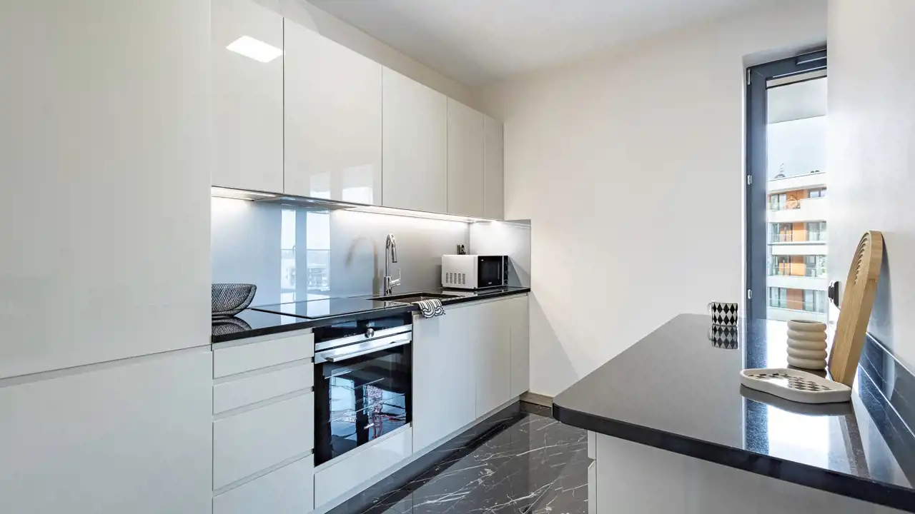 Elegancka, funkcjonalna kuchnia wyposażona jest w: zmywarkę, płytę indukcyjną, dużą lodówkę z zamrażarką, okap oraz piekarnik. Kuchnia jest częściowo otwarta na pokój dzienny.