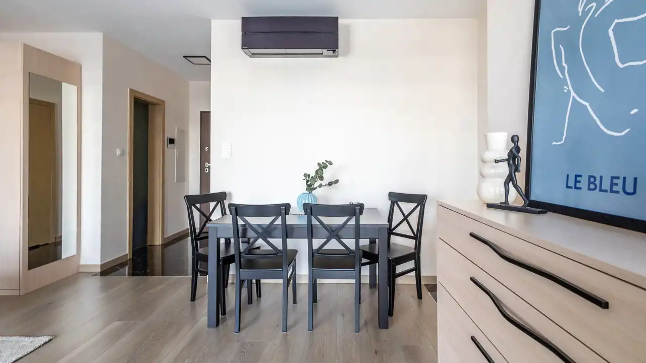 Mieszkanie posiada taras z widokiem na osiedle i okolicę, a dla pełnego komfortu zainstalowano klimatyzację.