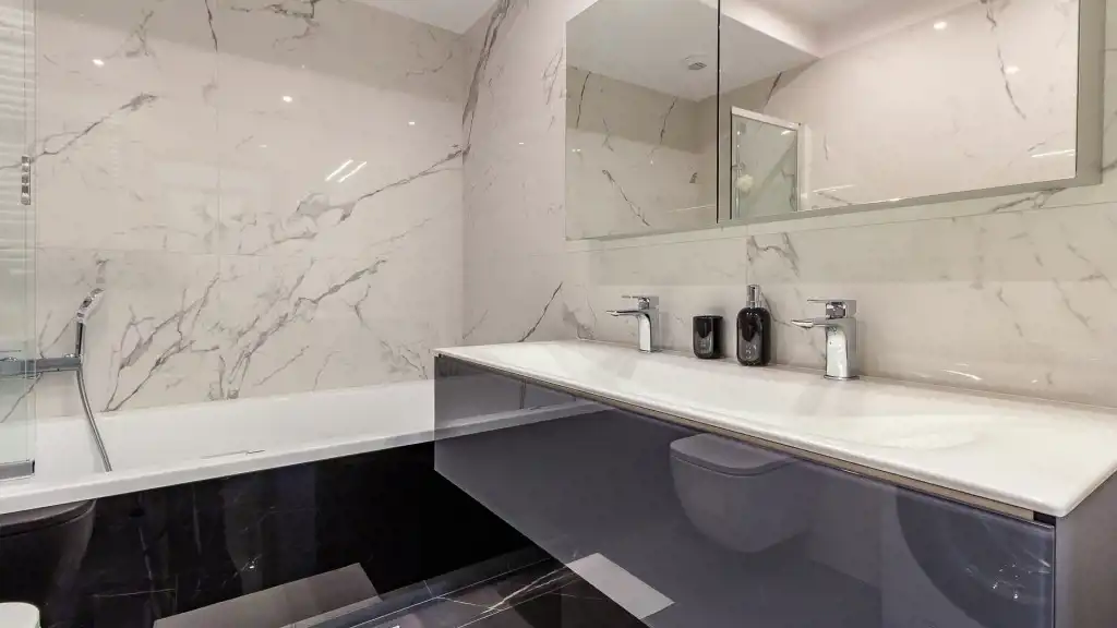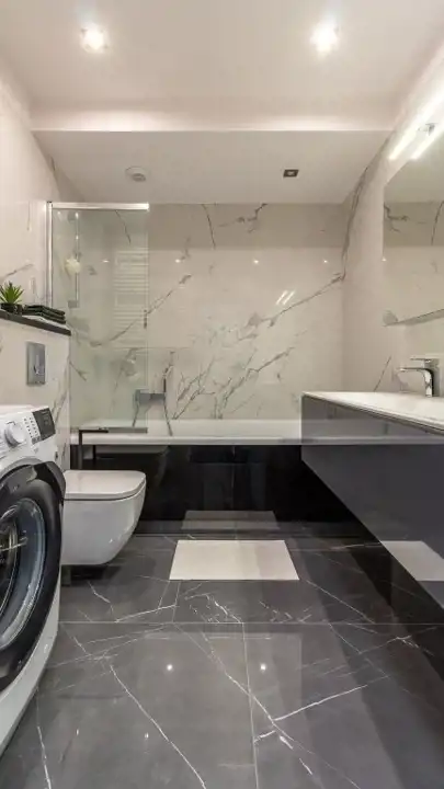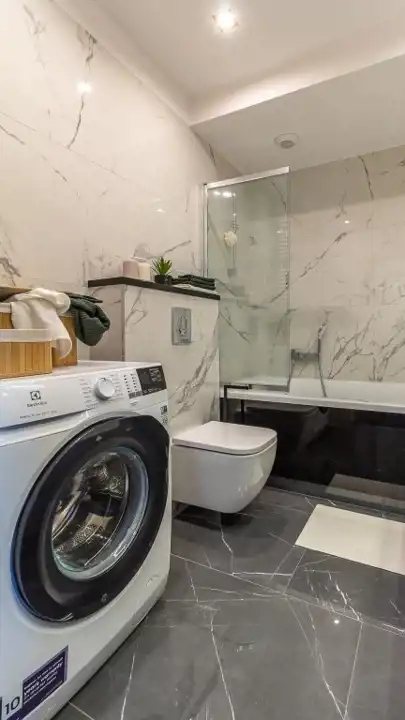 Elegancka, komfortowa łazienka została wykończona materiałami wysokiej jakości. Znajdziemy w niej dużą wannę z funkcją prysznica, WC, podwójną umywalkę oraz liczne miejsca do przechowywania.
