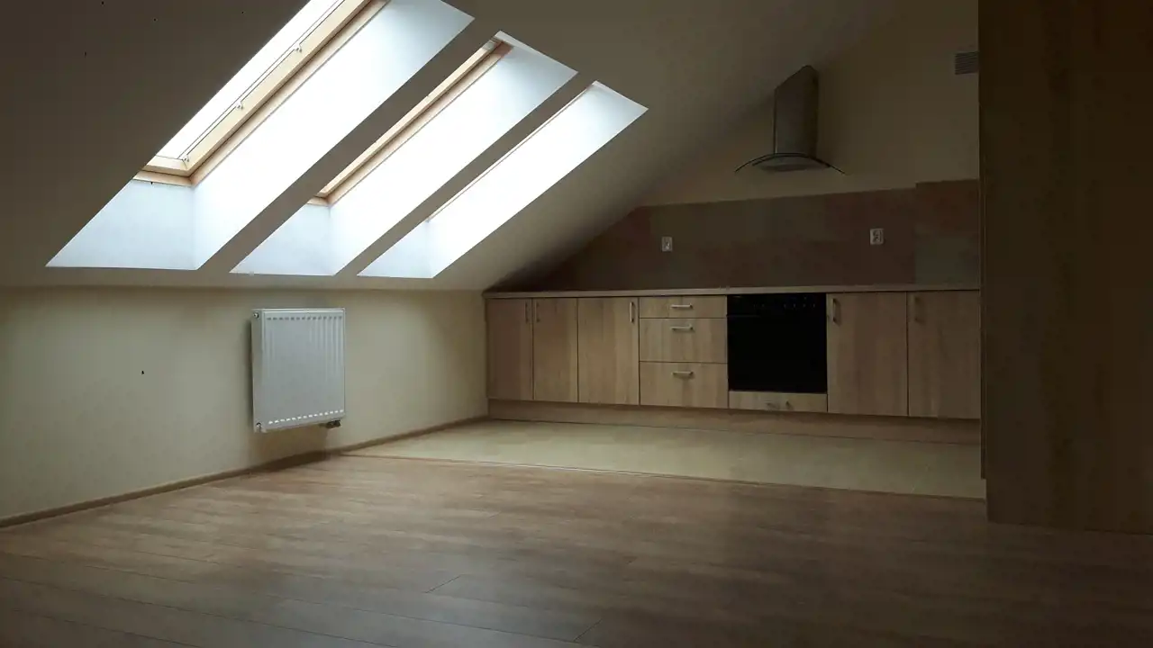 - salonu z aneksem kuchennym (lodówko zamrażarka, zmywarka, płyta elektryczna, zabudowa kuchenna, posiada skosy),
