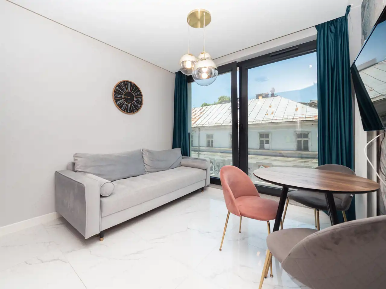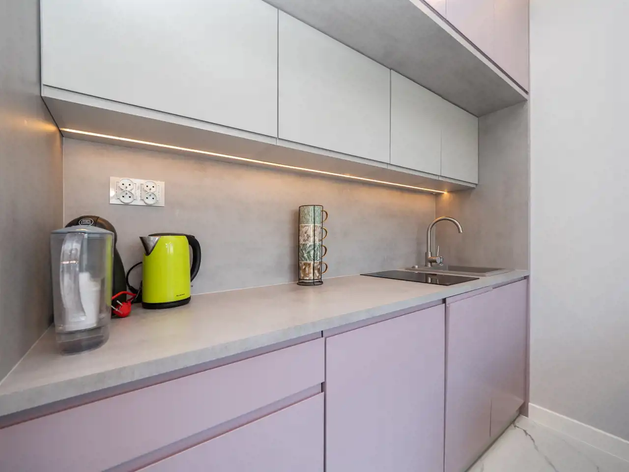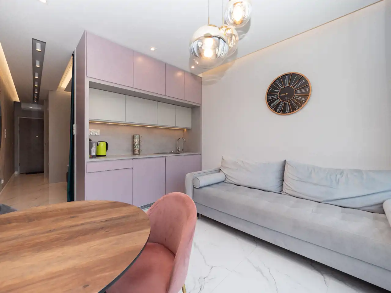 The apartment has 29 sqm. Thanks to the well-thought-out interior design, the property has a separate night zone with a double bed. In addition, a living room with a kitchenette,