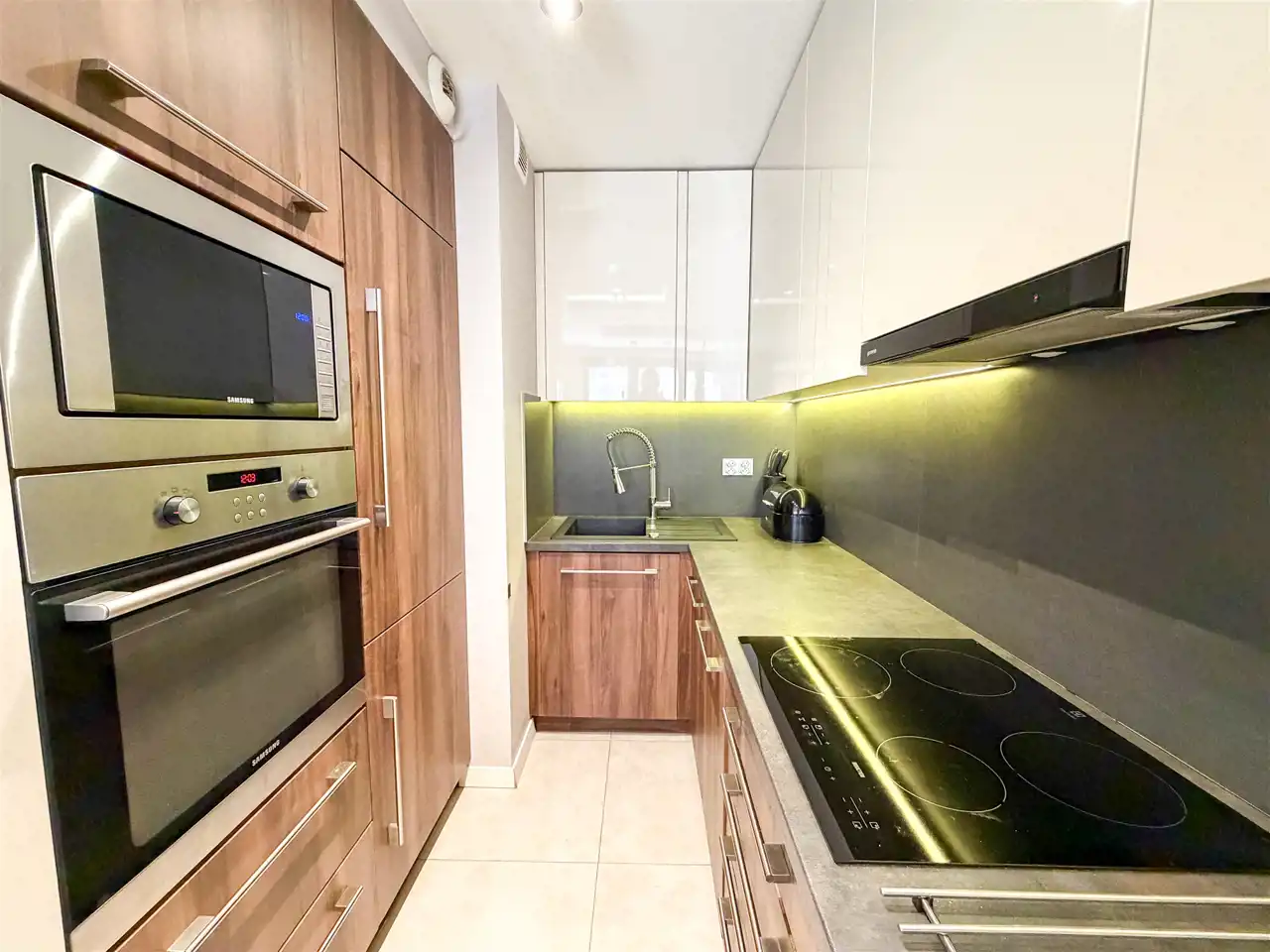 - Kuchnia: lodówka w zabudowie, piekarnik, płyta indukcyjna, zmywarka, pralka.