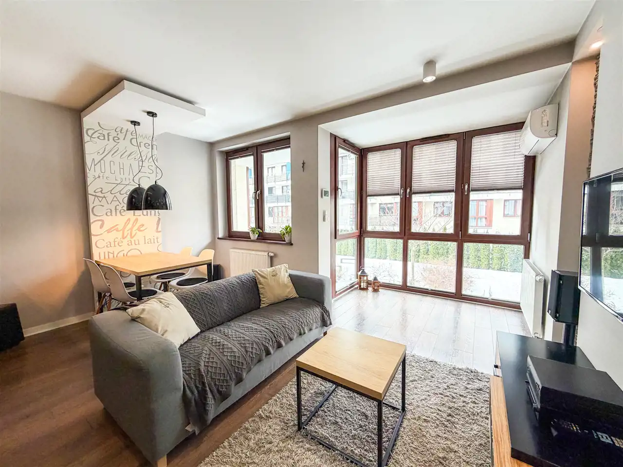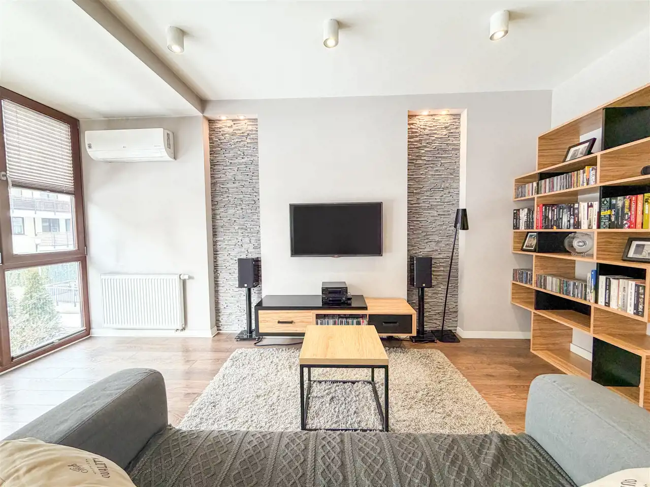 - Salon: kanapa, stolik kawowy, stół i cztery krzesła, telewizor z podstawowym pakietem tv, regał na książki, klimatyzacja .