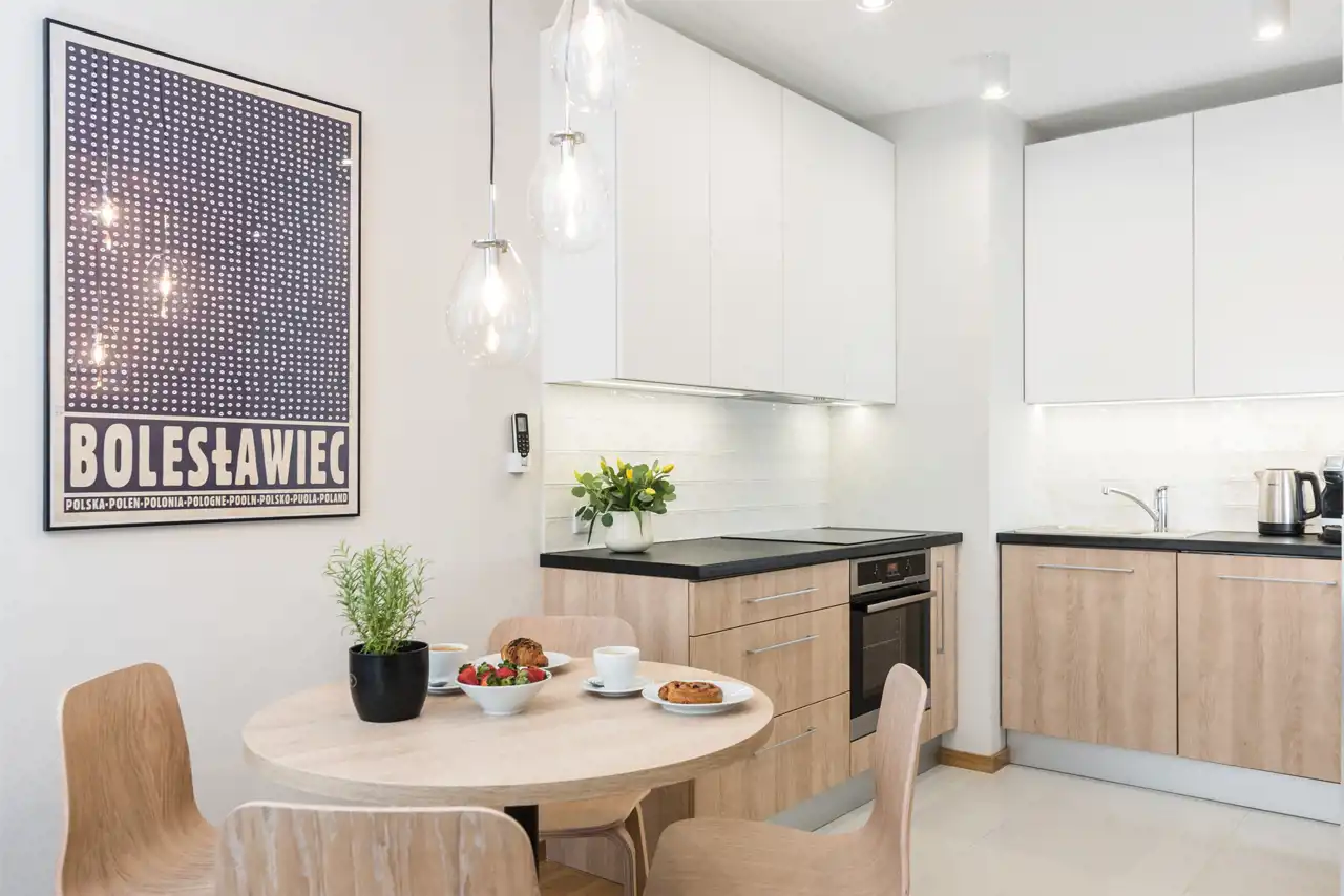 Aneks kuchenny jest w pełni wyposażony w lodówkę z zamrażalnikiem, piekarnik, płytę indukcyjną oraz zmywarkę, dodatkowo w aneksie kuchennym znajdują się kubki, szklanki, talerze i sztućce.