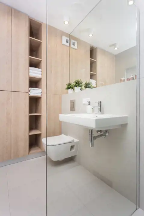 Gustownie urządzona łazienka posiada prysznic z deszczownicą, toaletę, umywalkę oraz szafkę w zabudowie, lustro i pralkę.