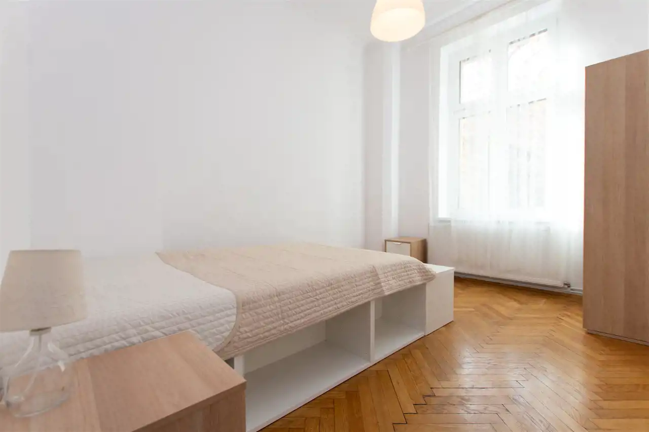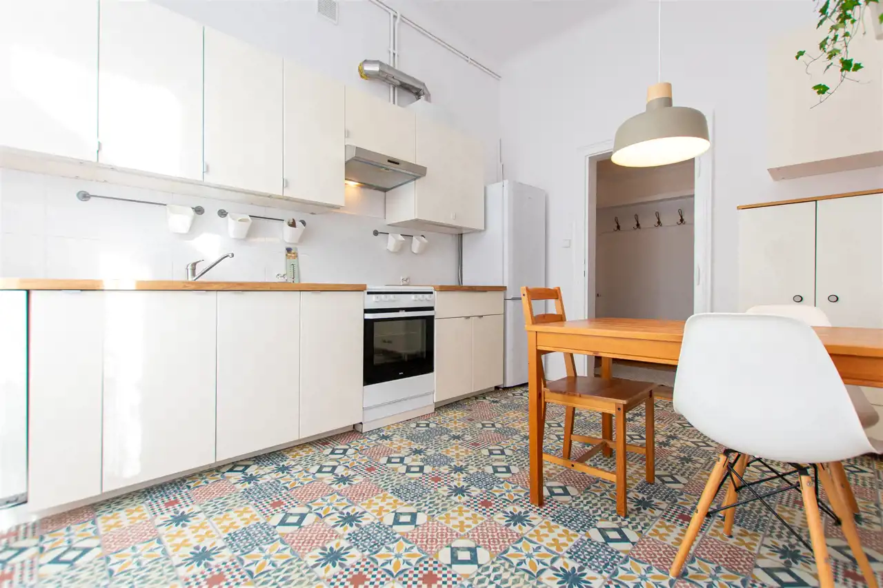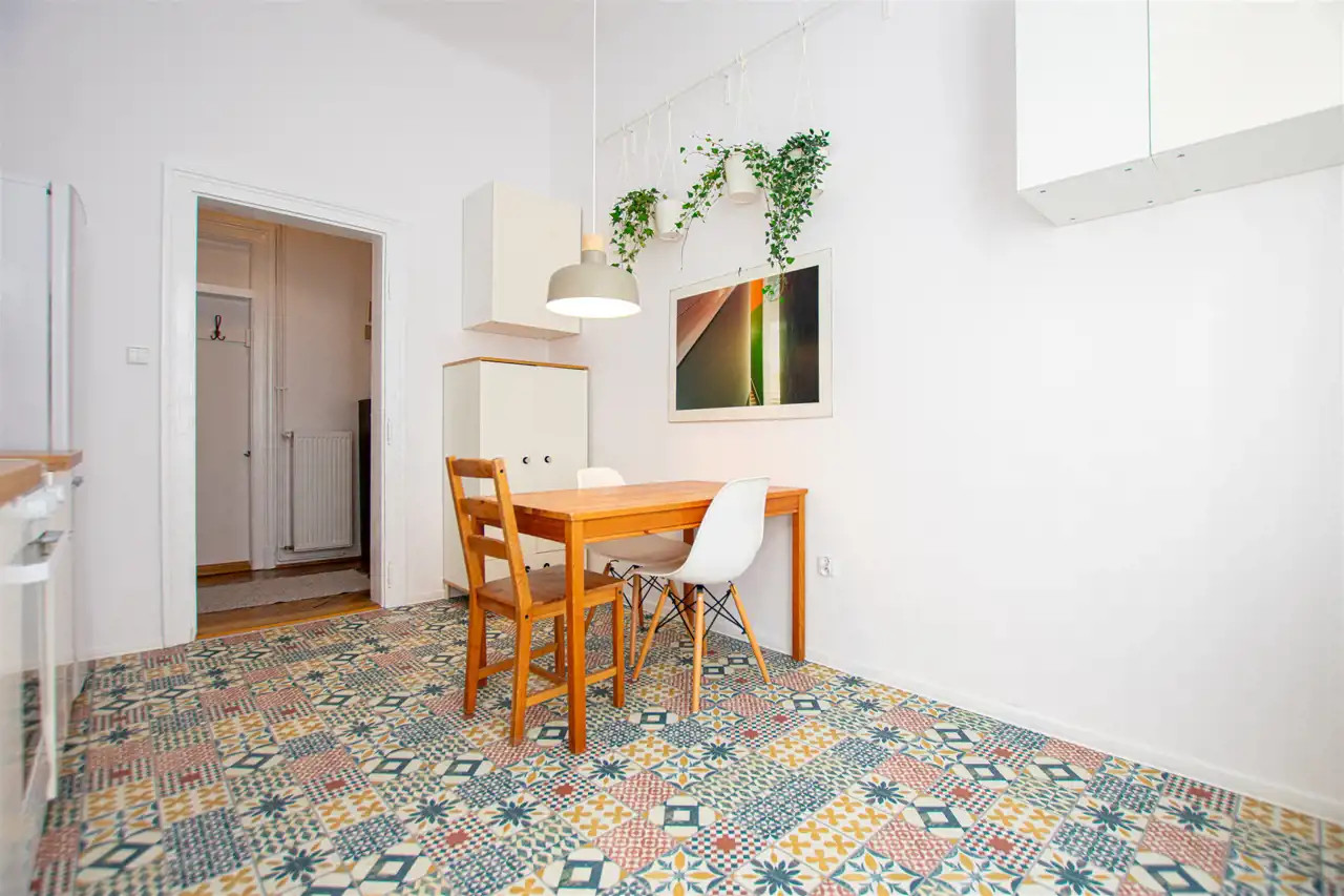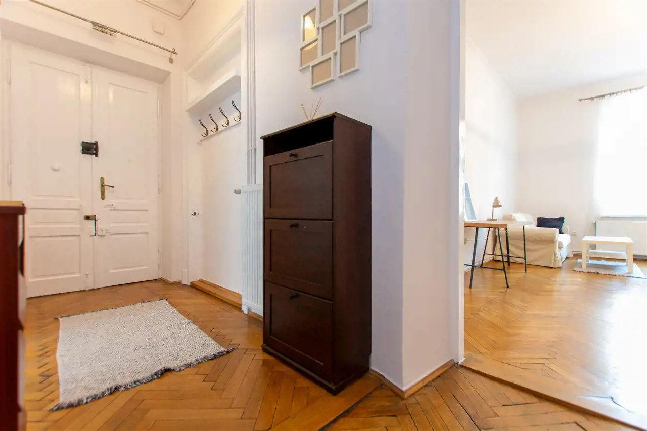 Kuchnia wyposażona jest w płytę ceramiczną dwustanowiskową, piekarnik, lodówko-zamrażarkę, zlewozmywak, zmywarkę. Miejsce na przechowywanie zapewniają dwie duże szafy. Mieszkanie zostało odmalowane i odświeżone. Ogrzewanie i ciepła woda z nowoczesnego gazowego pieca II-funkcyjnego z zamkniętą komorą spalania. Kamienica ma dostęp do Internetu światłowodowego.