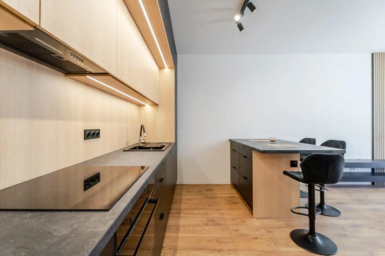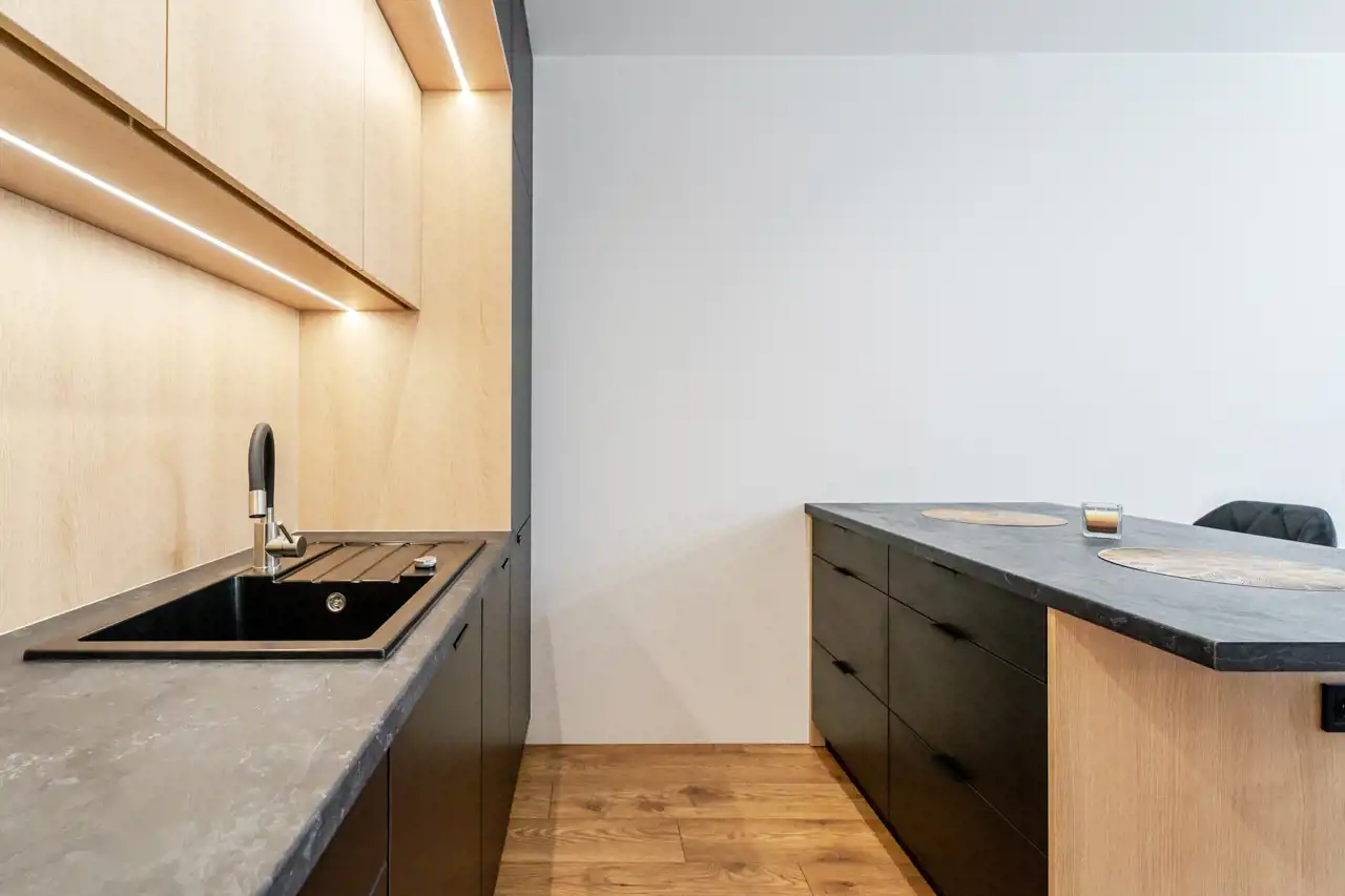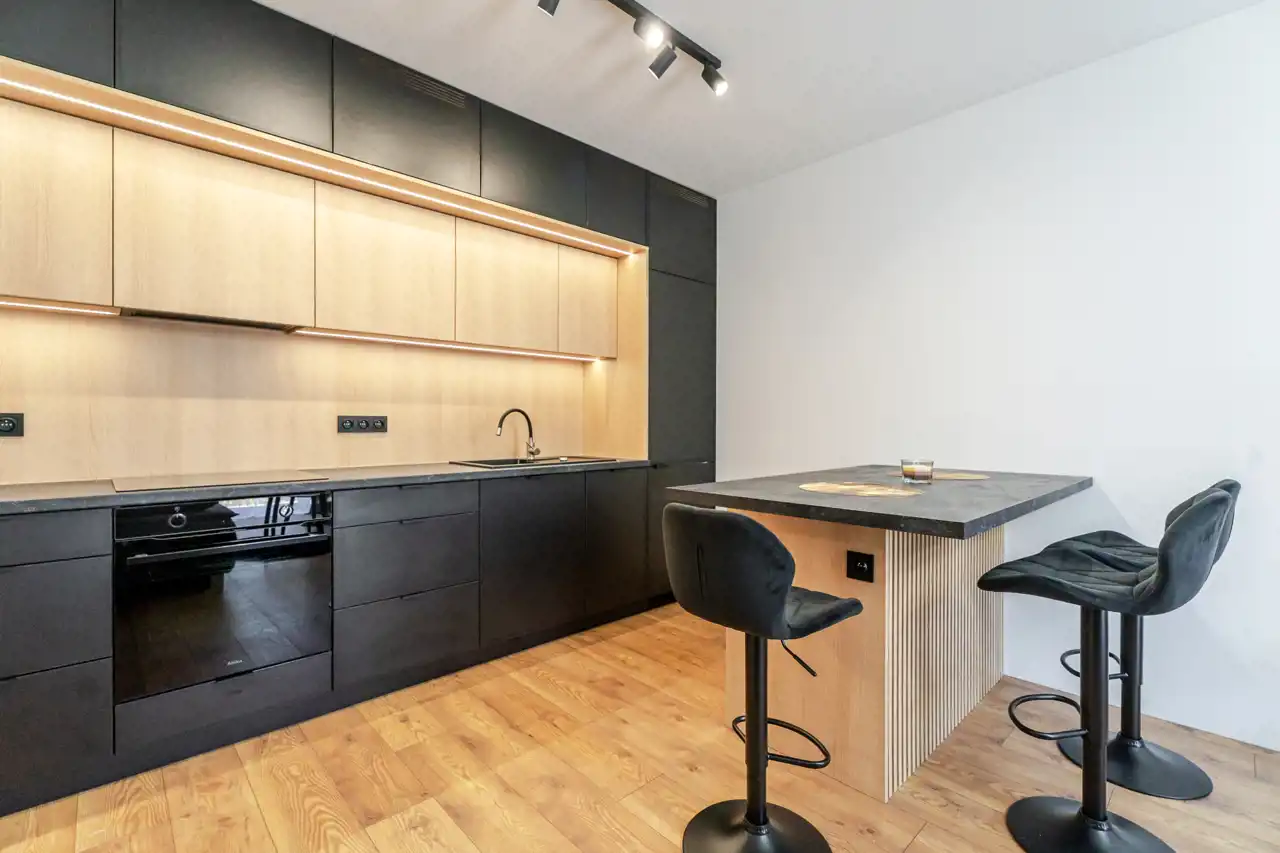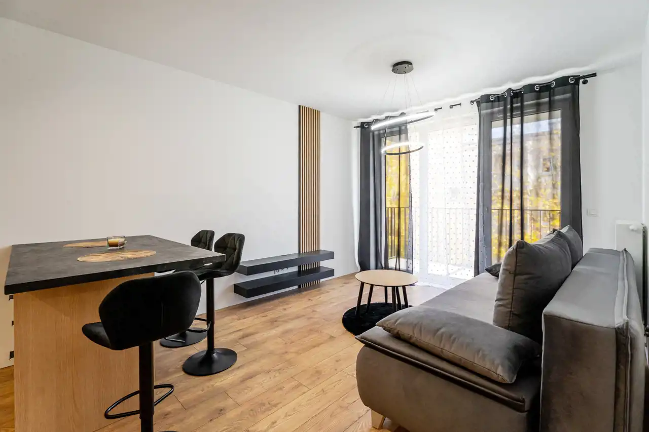 Przestronny salon z aneksem kuchennym i wyjściem na duży balkon