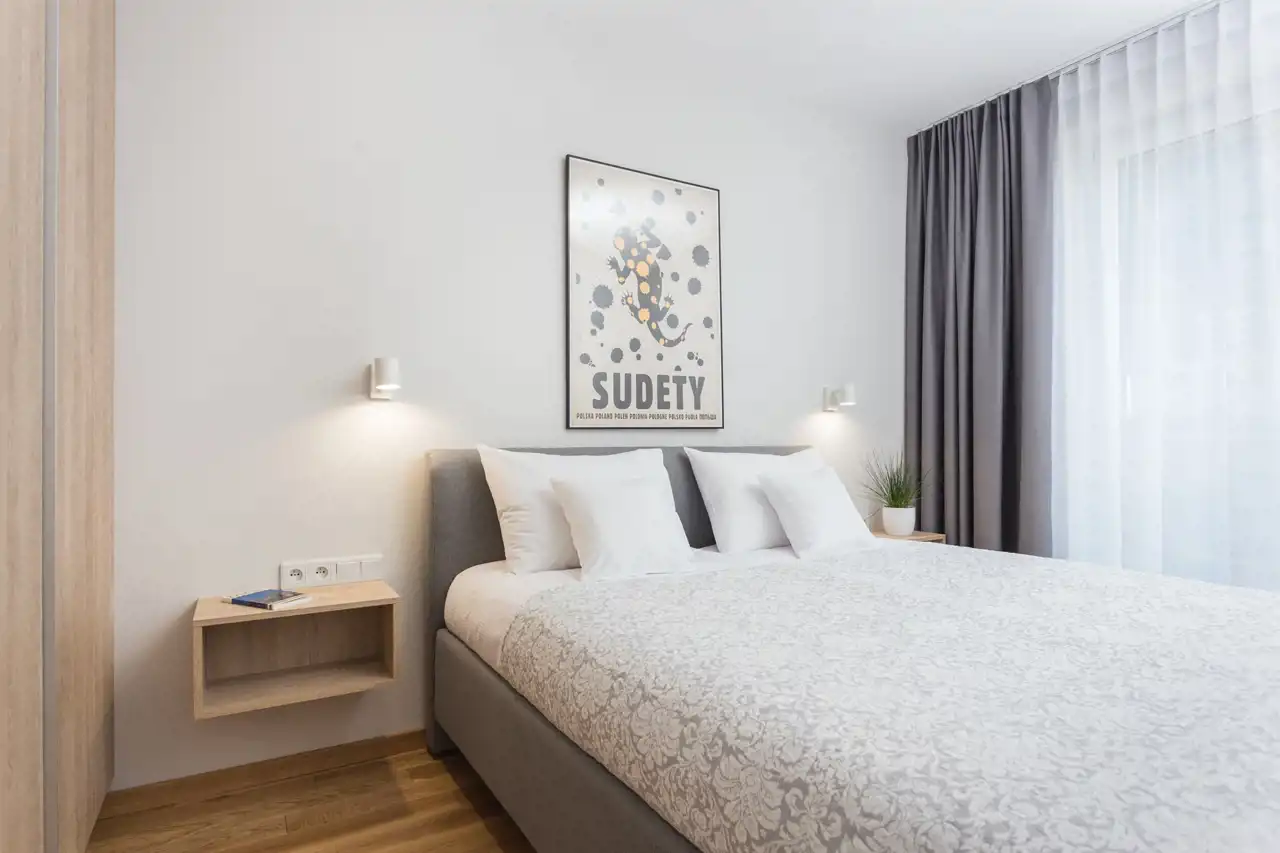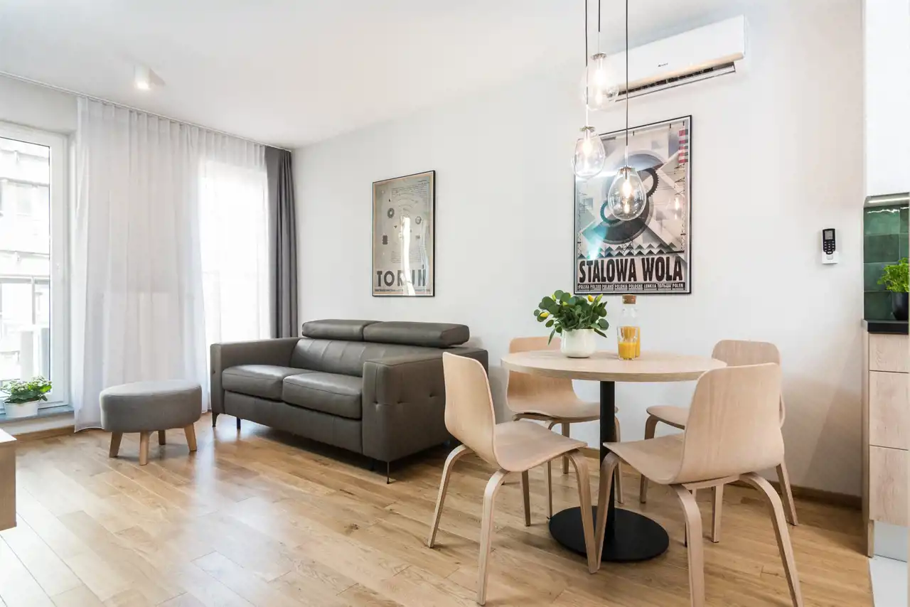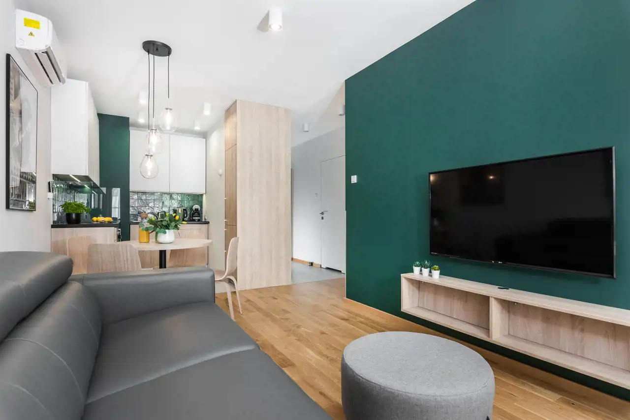 W salonie znajduje się wygodna rozkładana narożna sofa, stolik kawowy, stół z krzesłami oraz szafka RTV i telewizor. Dodatkowo osobna sypialnia z dwuosobowym łóżkiem oraz szafą