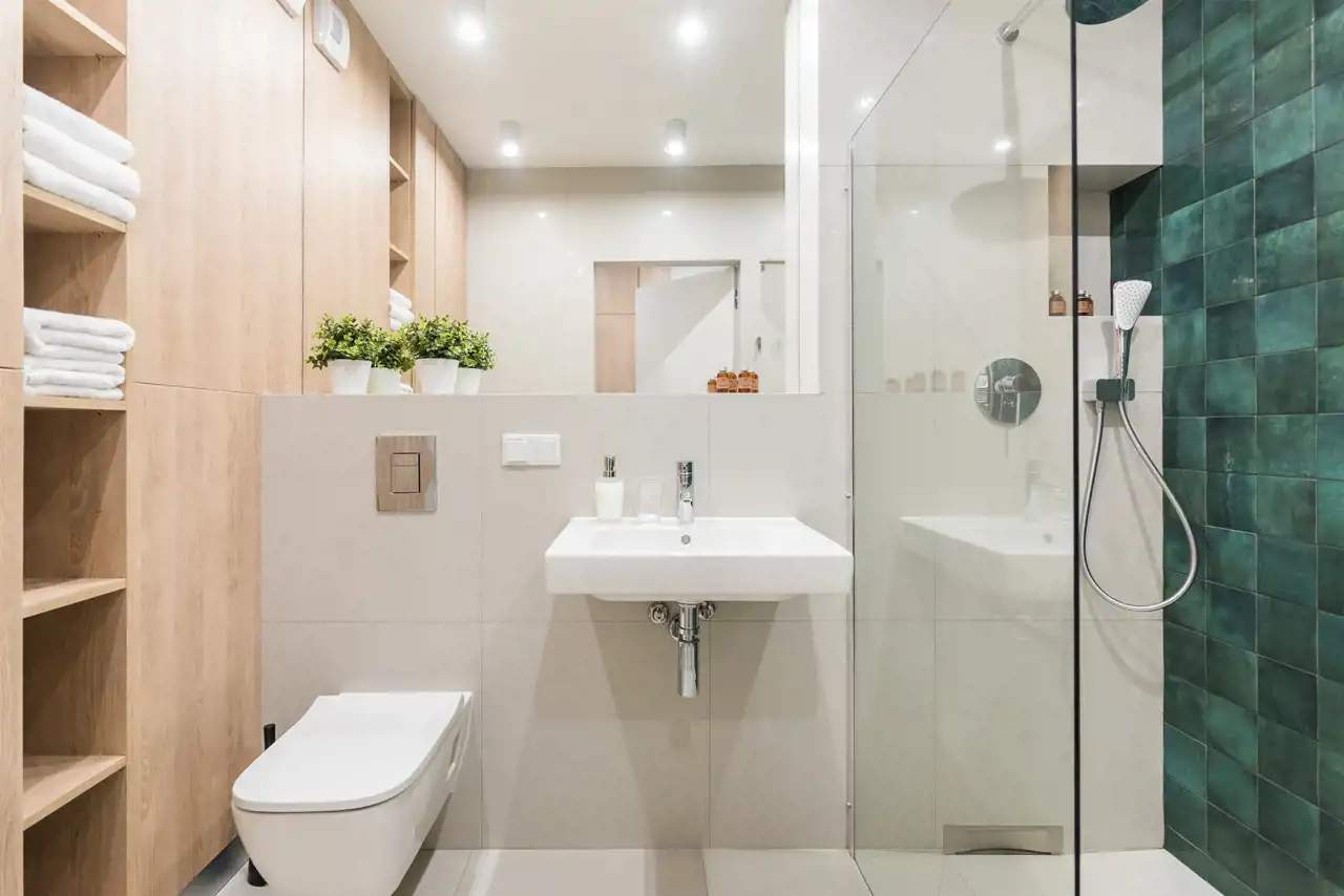Gustownie urządzona łazienka posiada prysznic z deszczownicą, toaletę, umywalkę oraz szafkę w zabudowie, lustro i pralkę.