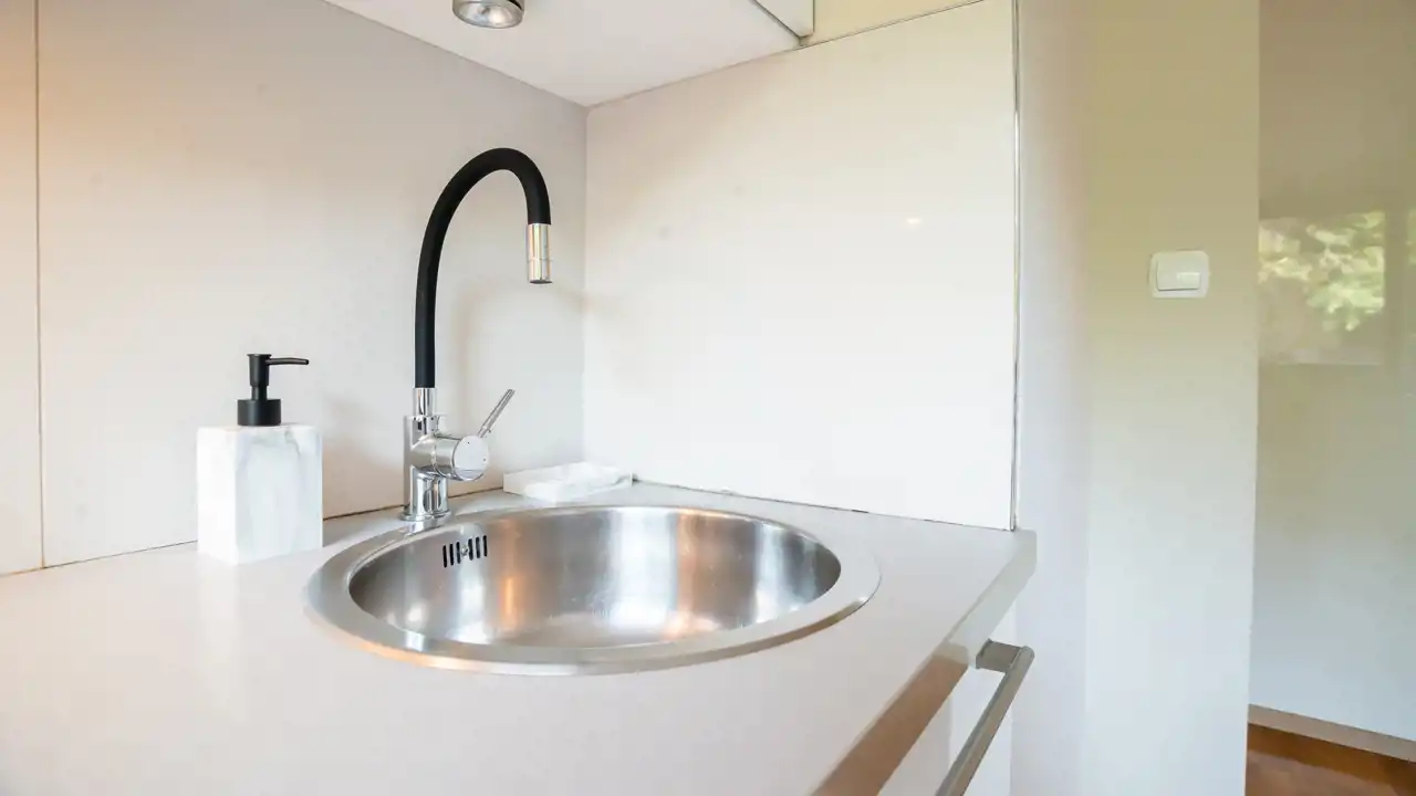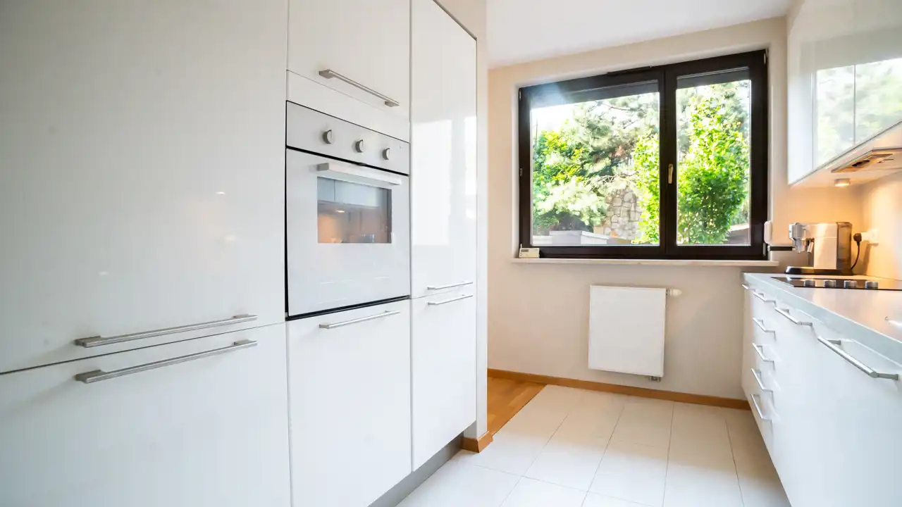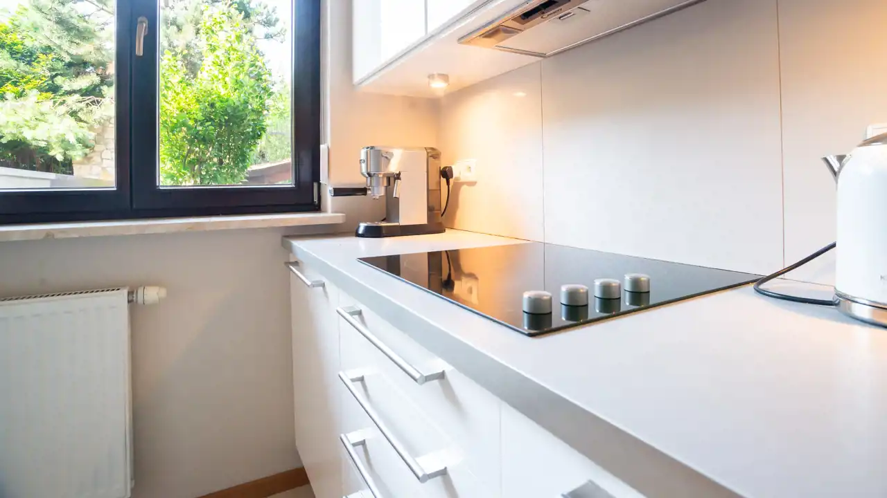 - Kuchnia w zabudowie z pełnym sprzętem AGD: lodówko-zamrażarka, zmywarka, płyta grzewcza, piekarnik, mikrofalówka, okap.