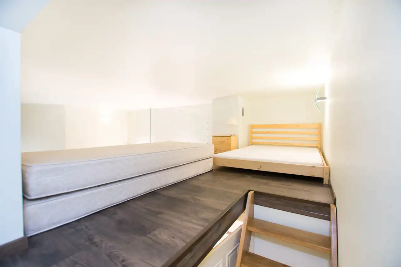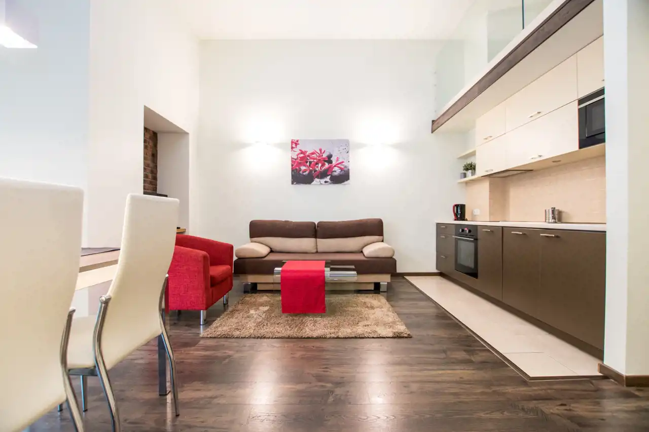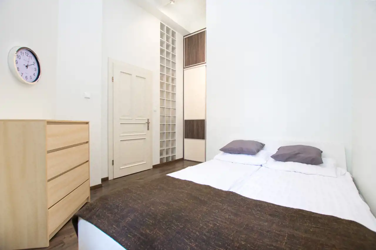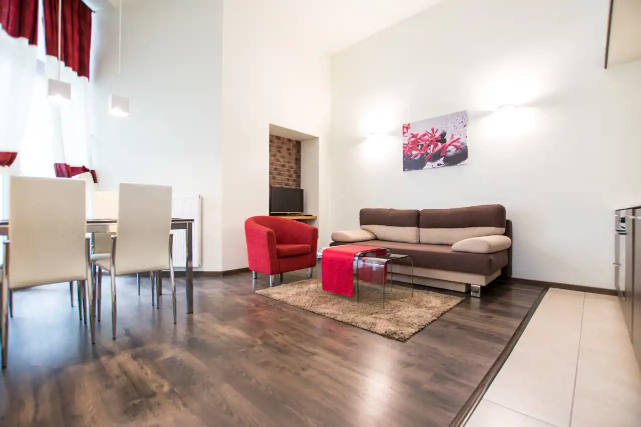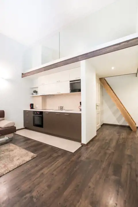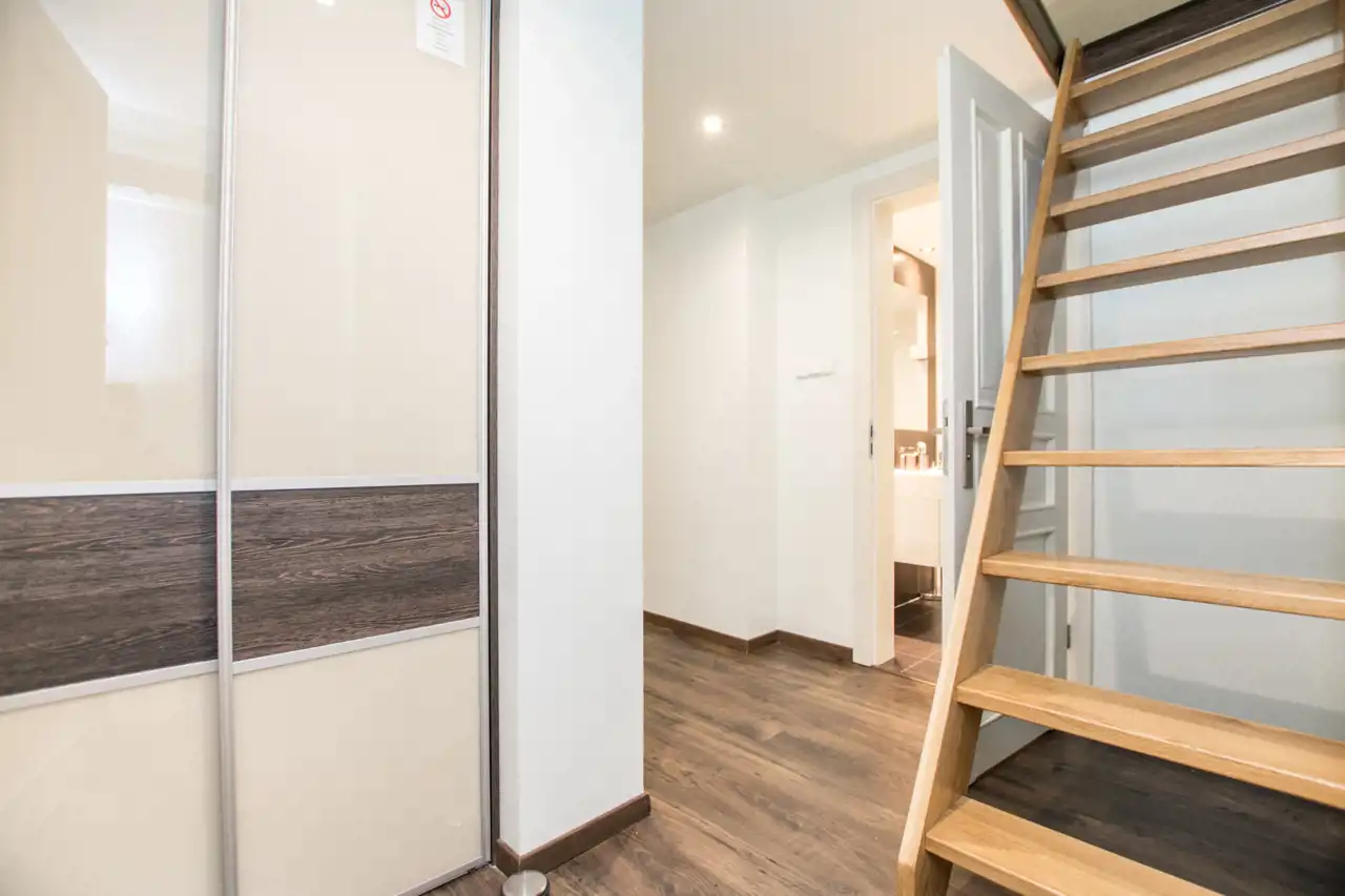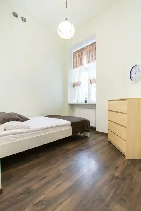 Okna nieruchomości wychodzą na zadbane podwórze, co zapewnia cisze i komfort użytkowania. Kompletnie wyposażony aneks kuchenny (płyta grzewcza, piekarnik, lodówka z zamrażarką, zmywarka). W salonie kącik telewizyjny z rozkładaną sofą oraz stół jadalniany dla 4 osób. Łazienka z wanną i pralką. Przestronna sypialnia pozwala na zaaranżowanie miejsca do pracy w domu. Dwie pojemne szafy w zabudowie i schowek na antresoli zapewniają dużo miejsca na przechowywanie.