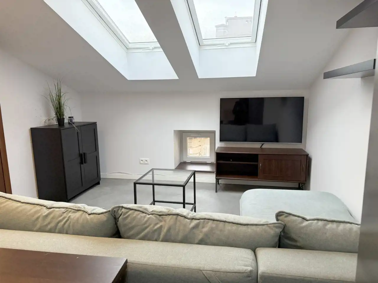 Mieszkanie ok 43 m2 (ze względu na skosy powierzchni liczonej jako użytkowa jest 31 m2) składa się salonu z aneksem kuchennym, łazienki i sypialni z balkonem.