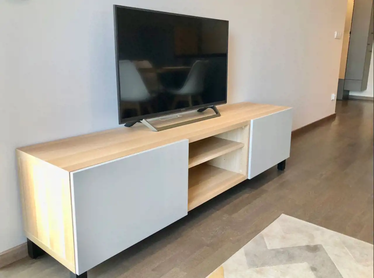 • kuchnia: duża lodówka z zamrażarką, zmywarka, piekarnik z funkcją mikrofali, płyta indukcyjna oraz cały drobny sprzęt AGD (garnki, sztućce, talerze, szkło, itp.)