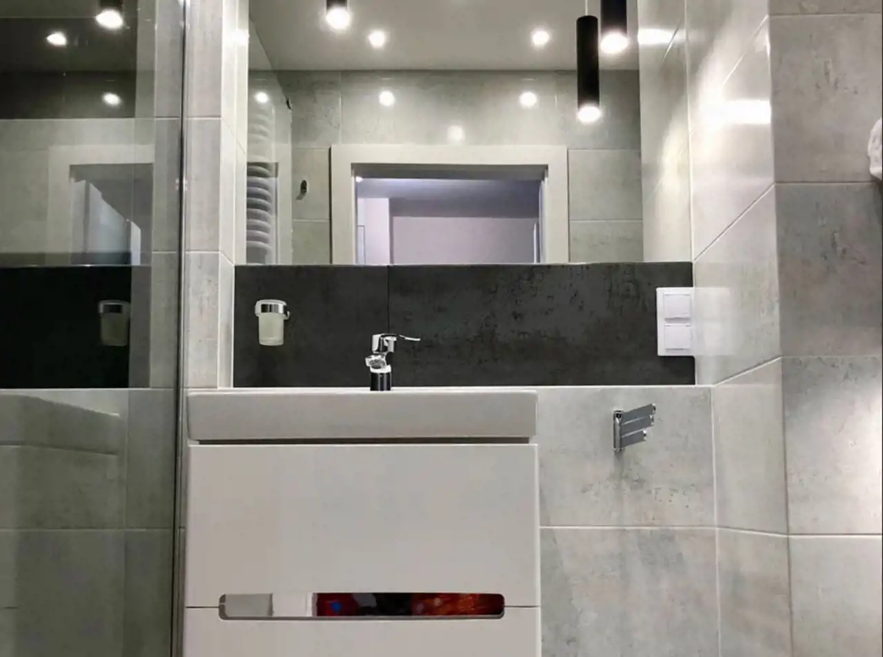 • łazienka: kabina prysznicowa walk-in, umywalka z szafką, WC, ręczniki, dywaniki podłogowe