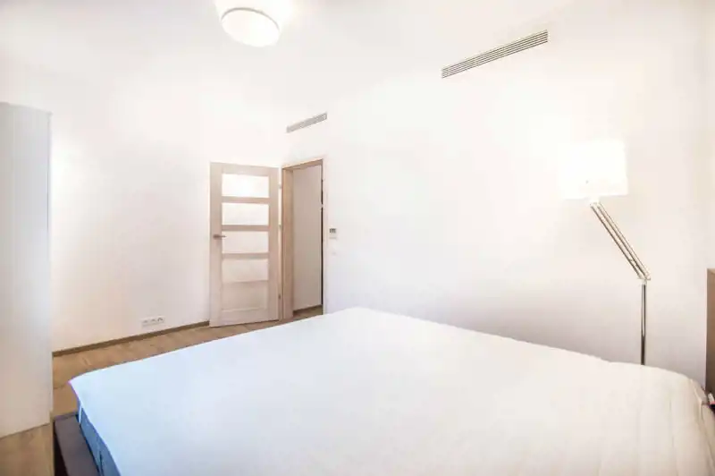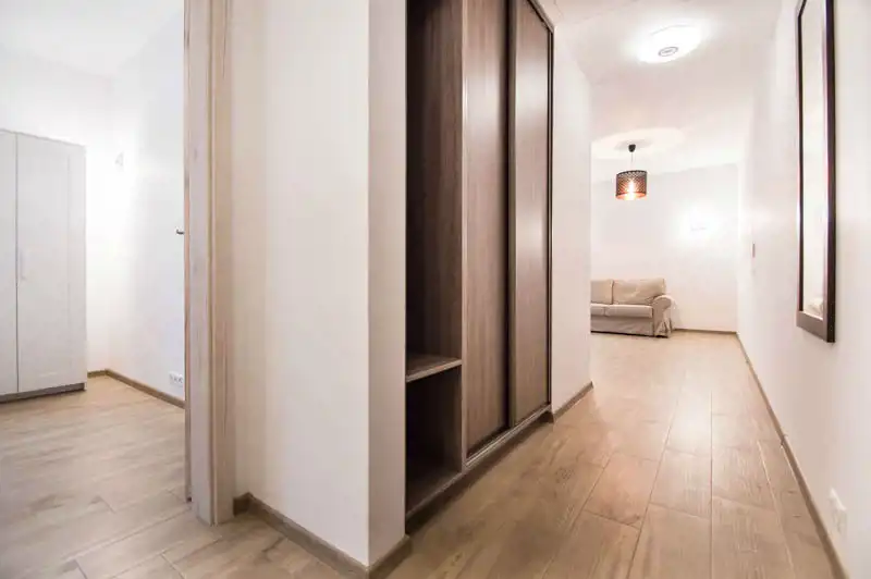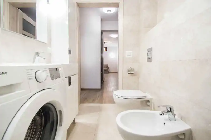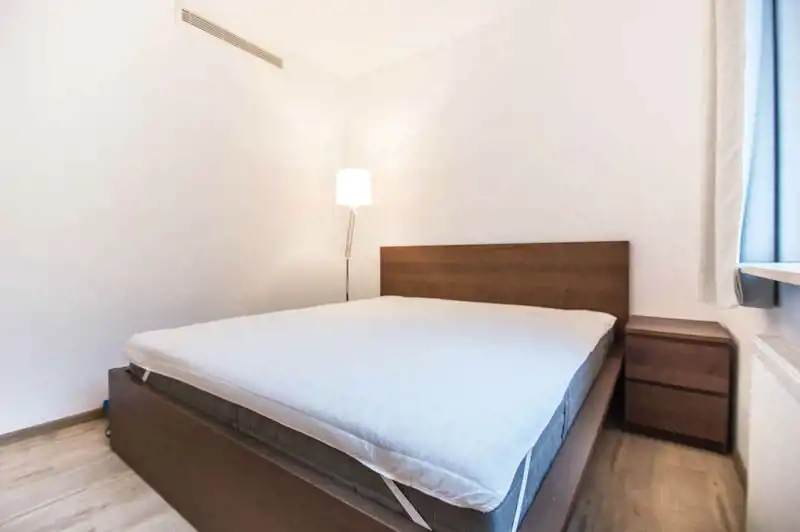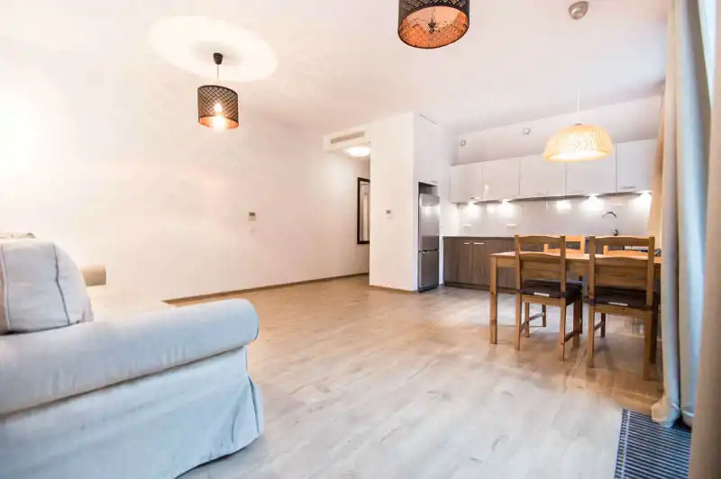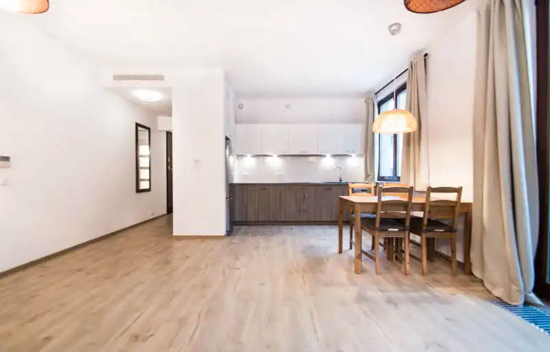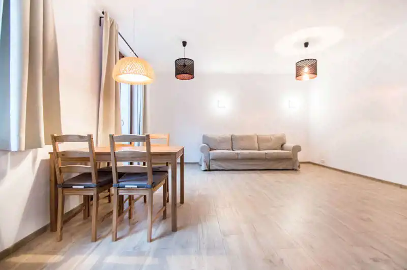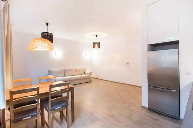 Apartament pełni wyposażony i umeblowany. W salonie znajdziemy sofę z funkcją spania, TV, stół i 4 krzesła. Aneks kuchenny wyposażony w sprzęt AGD (lodówka z zamrażarką, zmywarka, płyta grzewcza, okap). W sypialni łóżko dwuosobowe z materacem 160x200cm i pojemna szafa (niewidoczna na zdjęciach). Duża i nowoczesna łazienka z prysznicem i bidetem. Przestronny przedpokój z szafą w zabudowie. Nieruchomość klimatyzowana.