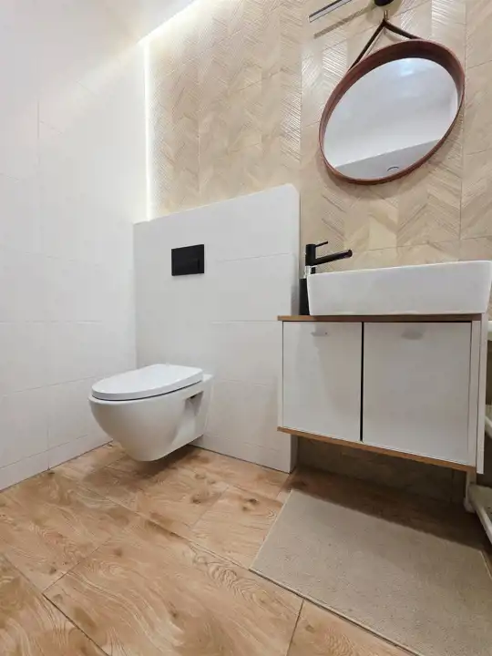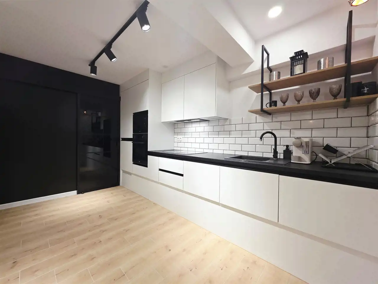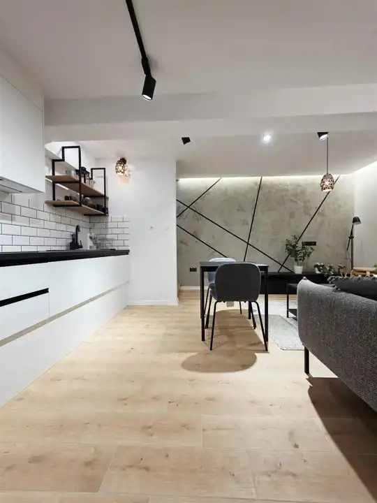 Nieruchomość posiada: solidne zewnętrzne drzwi z zamkiem antywłamaniowym, drzwi łazienkowe wewnętrzne wypełnione w kolorze stonowanej czerni, nowoczesne oświetleniowe moduły na suficie, listwy przypodłogowe kolorystycznie nawiązującymi do jasnych barw wnętrza. Całość nawiązujące do stylu nowoczesnej klasyki. Łazienka w stylu naturalistycznym została wystylizowana dzięki płytkom na podłodze nawiązującym tonacją i wyglądem do drewnianych desek a płytki naścienne zostały ułożone z wzorem w jodełkę. Styl w którym nieruchomość została wykończona jest często nazywany stylem nowoczesnym lub też stylem dla wymagających.