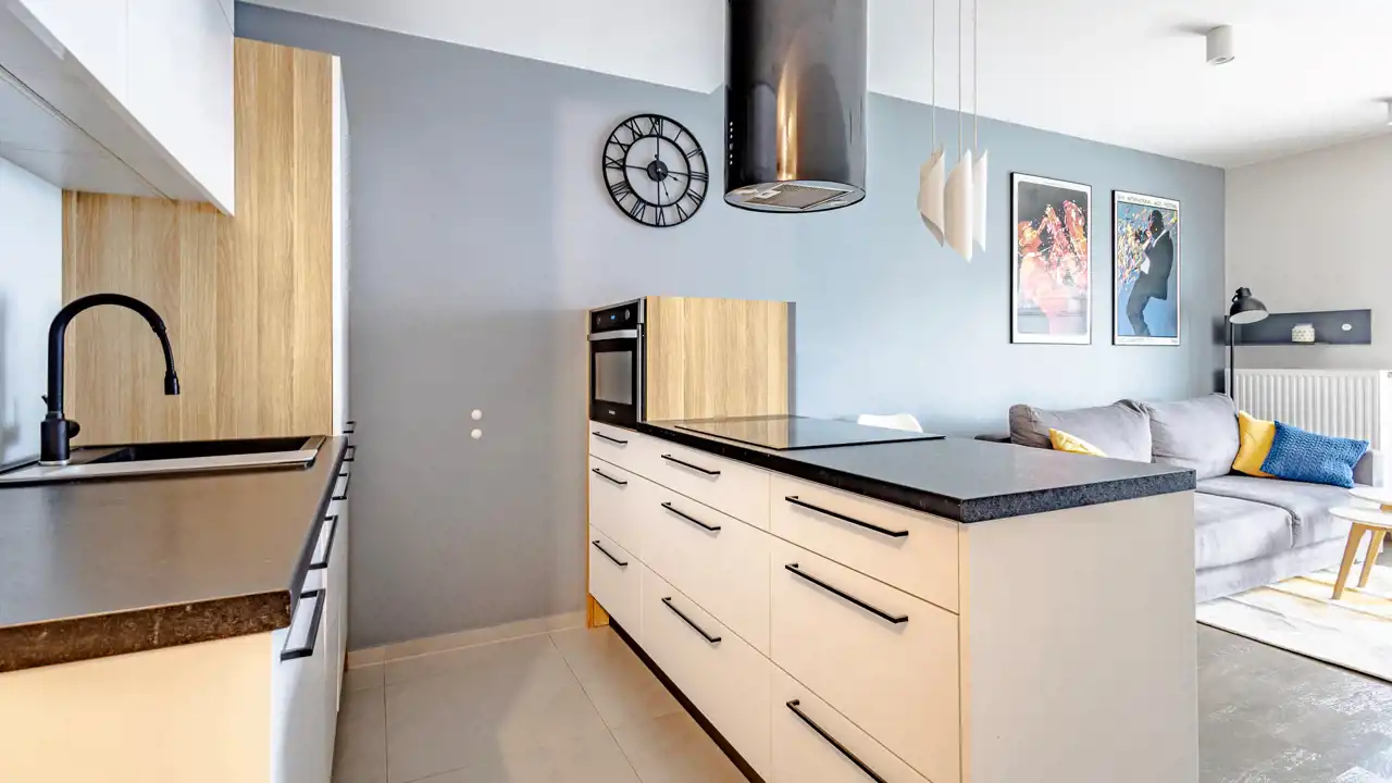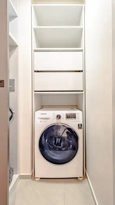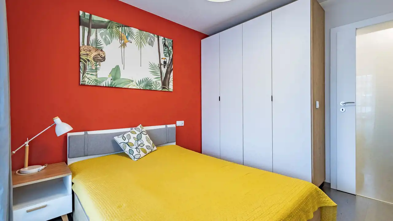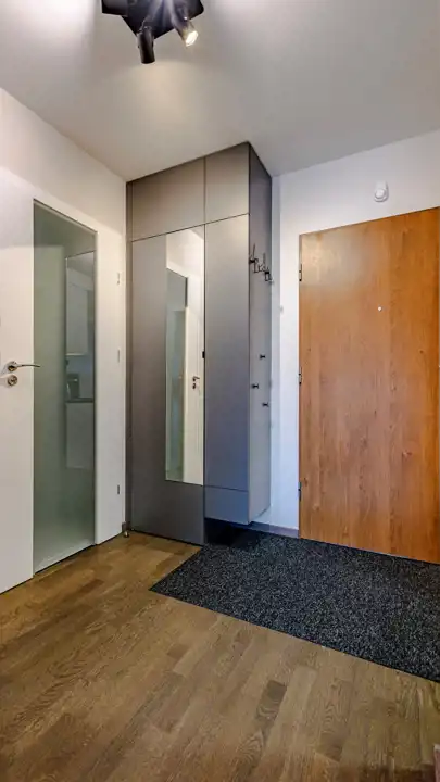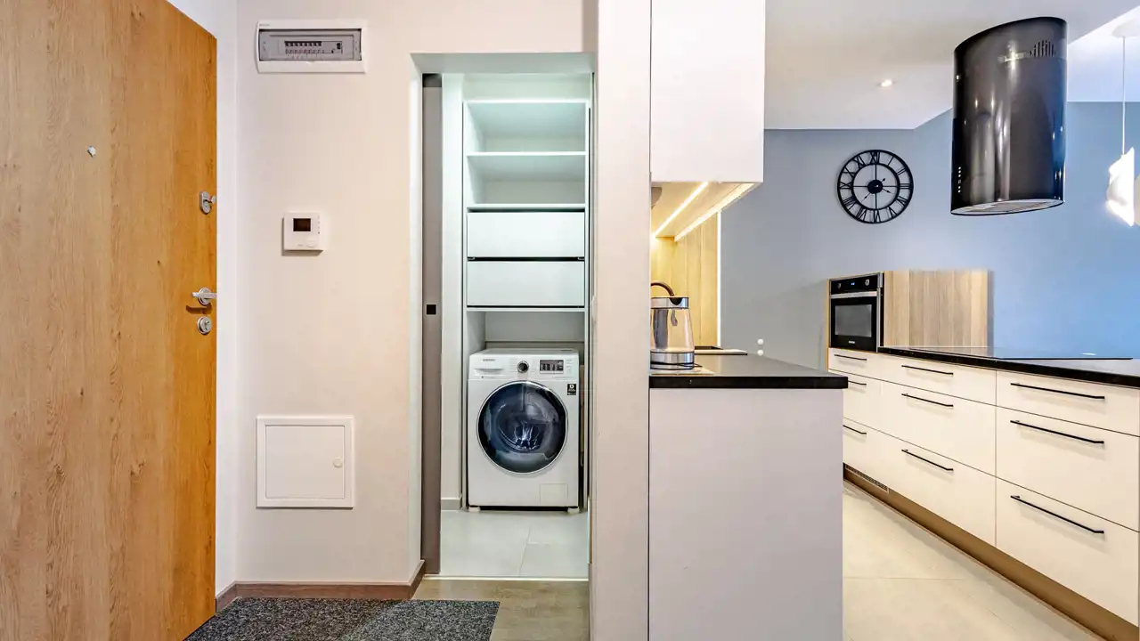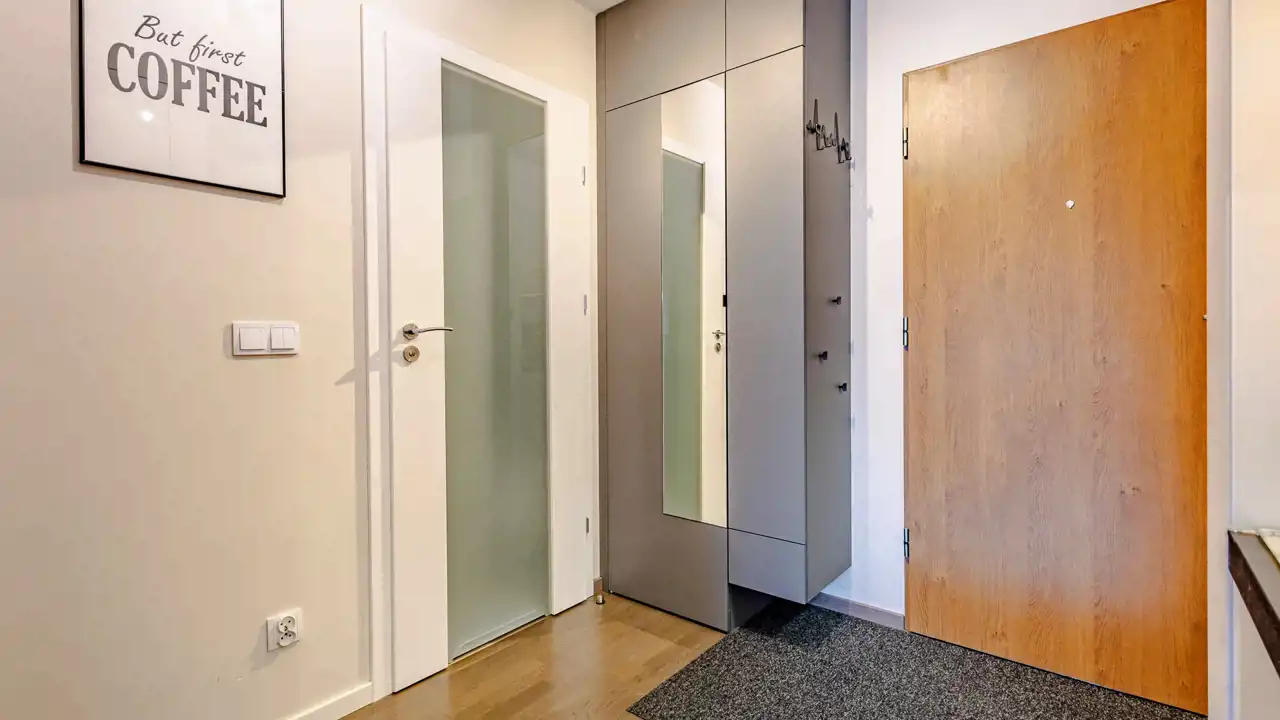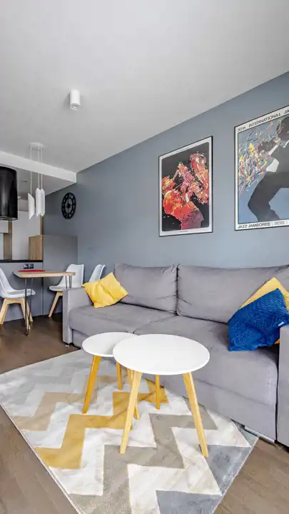 Mieszkanie składa się z salonu z aneksem kuchennym, sypialni oraz dodatkowego schowka/garderoby, co daje dużo miejsca do przechowywania. Lokal jest w pełni wyposażony, w kuchni znajdują się wszystkie niezbędne sprzęty oraz wyposażenie (w tym zmywarka), a w schowku m.in. pralka, odkurzacz i żelazko. Mieszkanie jest gotowe do wprowadzenia.