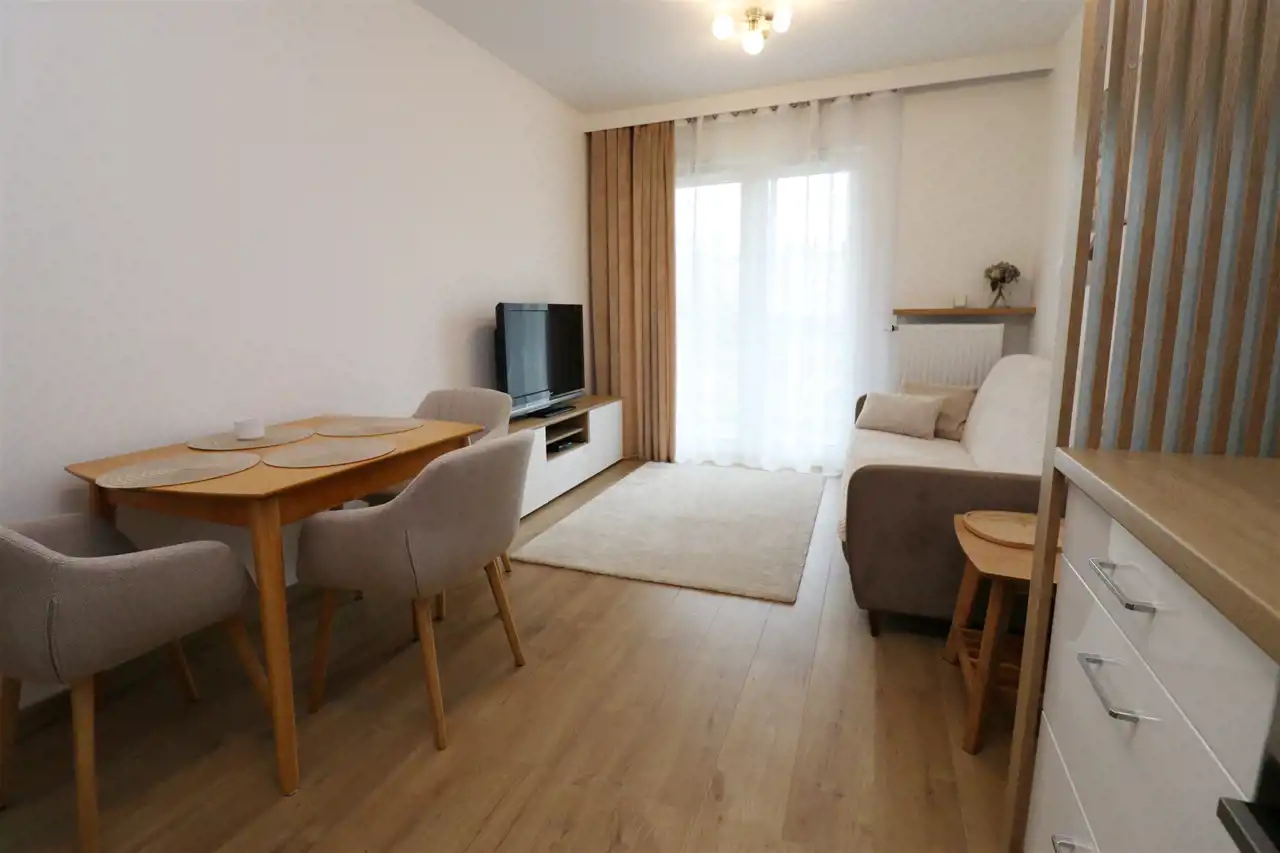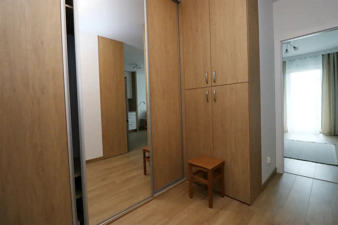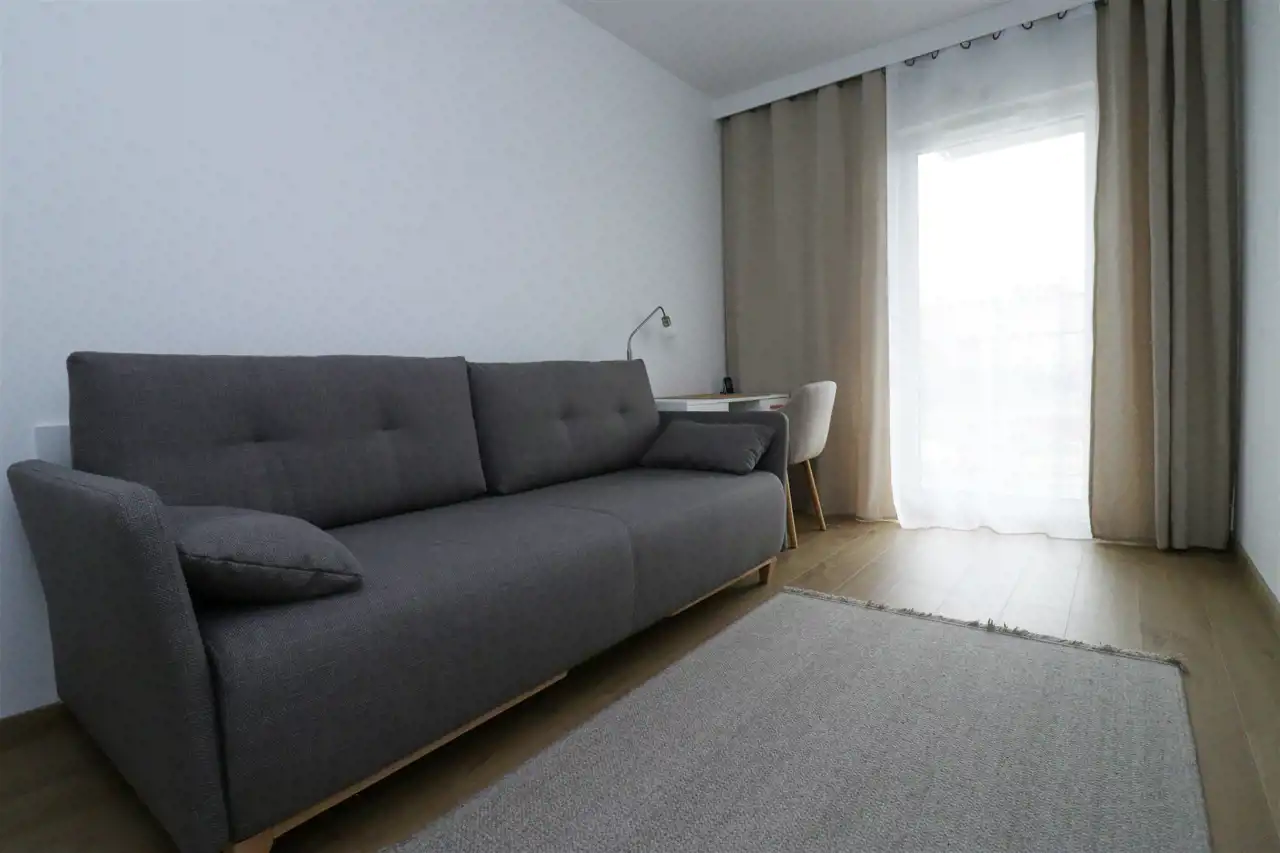 Mieszkanie jest bardzo przestronne i funckjonalne. Espozycja północno-wschodnia. W salonie jest sofa rozkładana, tv, stolik kawowy, stół z krzesłami. Kuchnia wyposażona w sprzęty agd: lodówko-zamrażarkę, zmywarkę, piekarnik, płytę grzewczą, zlew, okap. Kuchnia również jest wyposażona. W sypialni jest duża szafa, sofa rozkładana i biurko. W łazience prysznic, szafka, pralka, umywalka, toaleta. W przedpokoju jest bardzo duża zabudowa szaf, więc mieszkanie jest idealne dla osób potrzebujących dużo miejsca do przechowywania.