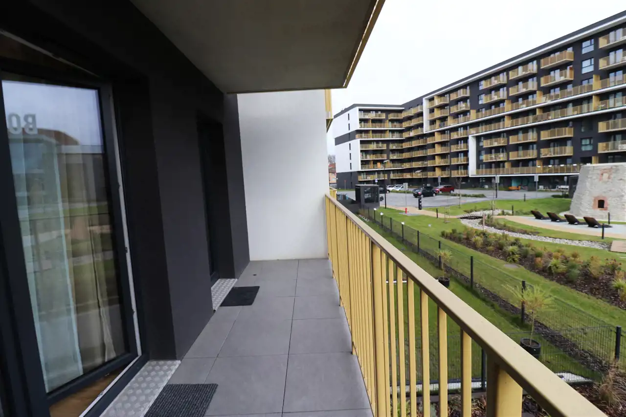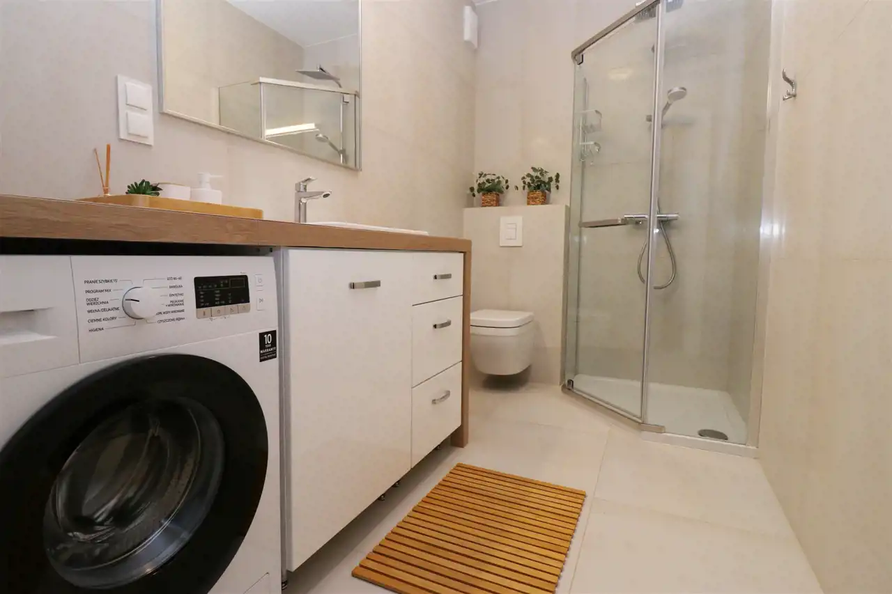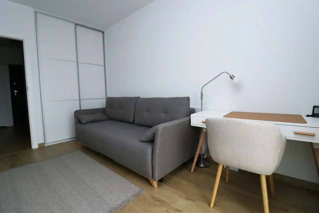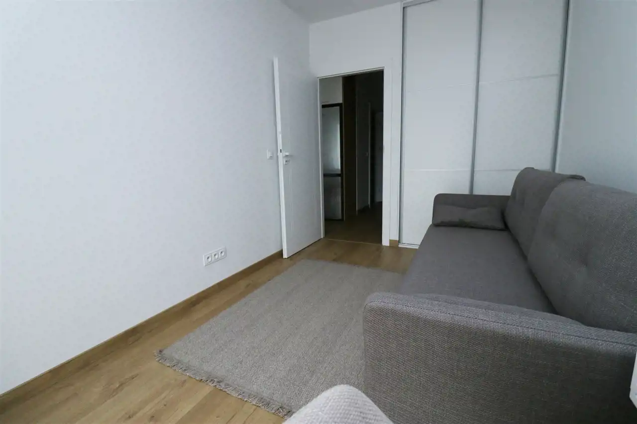 Mieszkanie jest bardzo przestronne i funckjonalne. Espozycja północno-wschodnia. W salonie jest sofa rozkładana, tv, stolik kawowy, stół z krzesłami. Kuchnia wyposażona w sprzęty agd: lodówko-zamrażarkę, zmywarkę, piekarnik, płytę grzewczą, zlew, okap. Kuchnia również jest wyposażona. W sypialni jest duża szafa, sofa rozkładana i biurko. W łazience prysznic, szafka, pralka, umywalka, toaleta. W przedpokoju jest bardzo duża zabudowa szaf, więc mieszkanie jest idealne dla osób potrzebujących dużo miejsca do przechowywania.