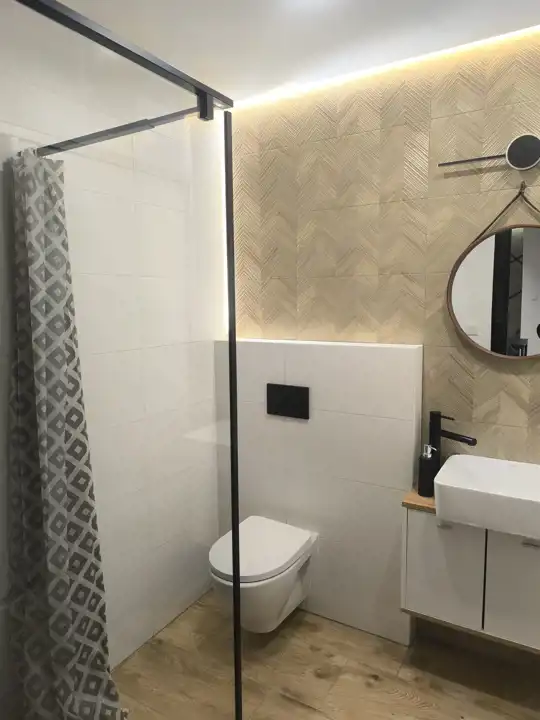 Nieruchomość posiada: solidne zewnętrzne drzwi z zamkiem antywłamaniowym, drzwi łazienkowe wewnętrzne wypełnione w kolorze stonowanej czerni, nowoczesne oświetleniowe moduły na suficie, listwy przypodłogowe kolorystycznie nawiązującymi do jasnych barw wnętrza. Całość nawiązujące do stylu nowoczesnej klasyki. Łazienka w stylu naturalistycznym została wystylizowana dzięki płytkom na podłodze nawiązującym tonacją i wyglądem do drewnianych desek a płytki naścienne zostały ułożone z wzorem w jodełkę. Styl w którym nieruchomość została wykończona jest często nazywany stylem nowoczesnym lub też stylem dla wymagających.