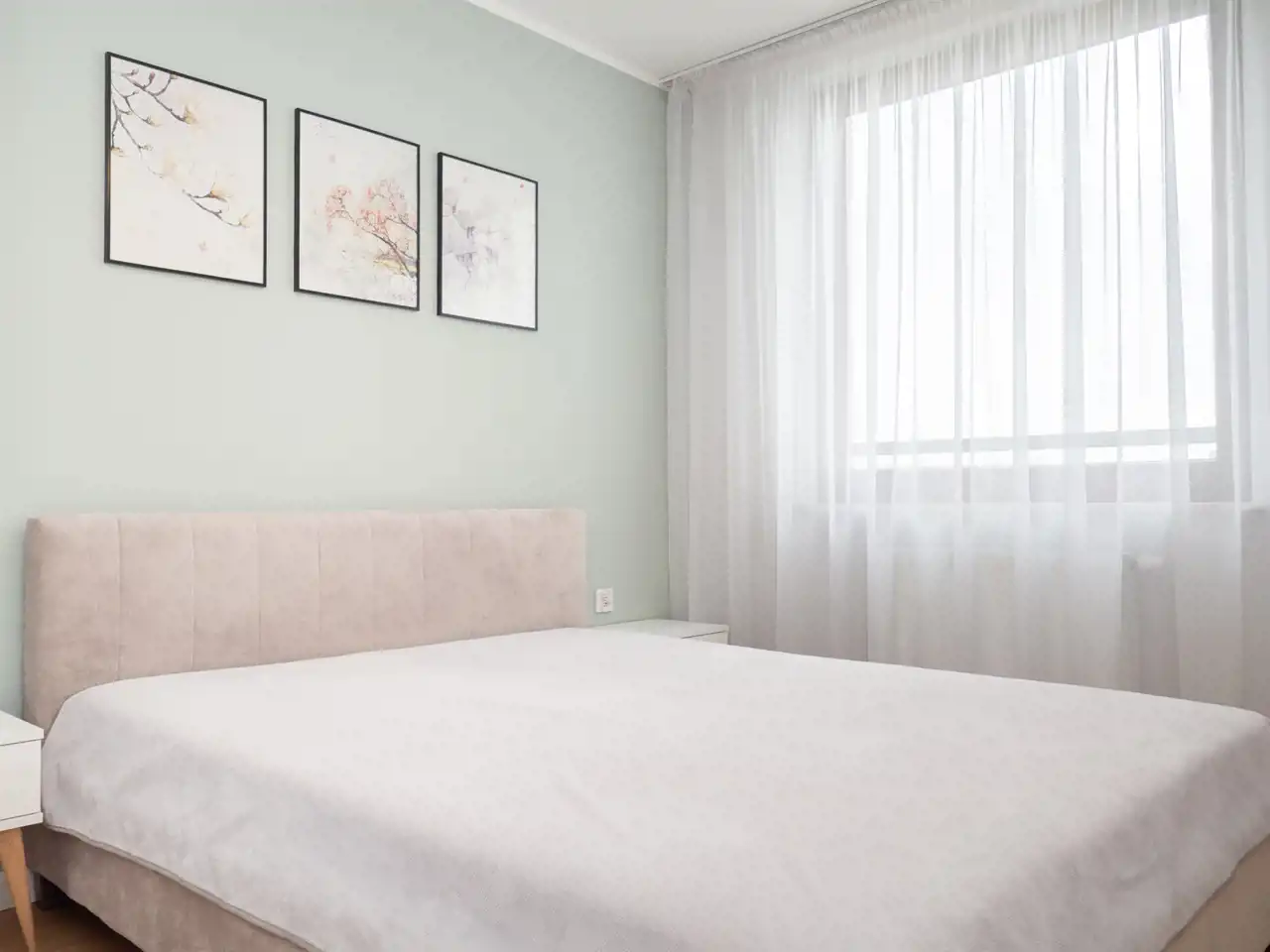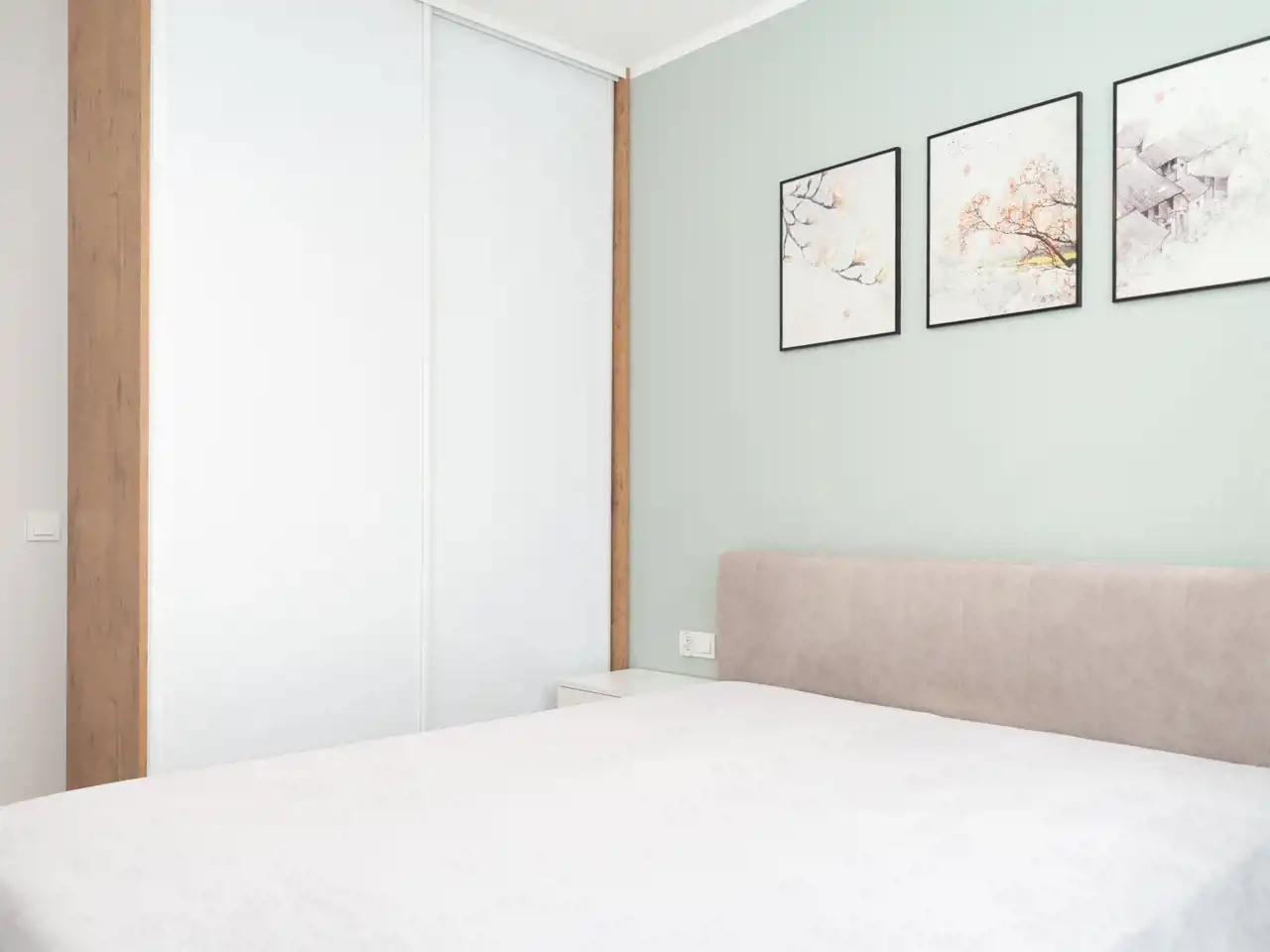 W sypialni znajduje się duże, wygodne łóżko 160 cm z pojemnikiem oraz pojemną szafą.