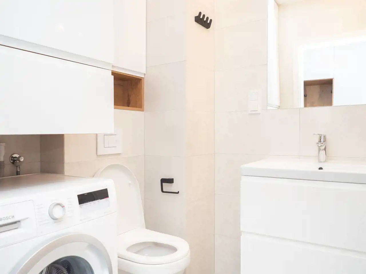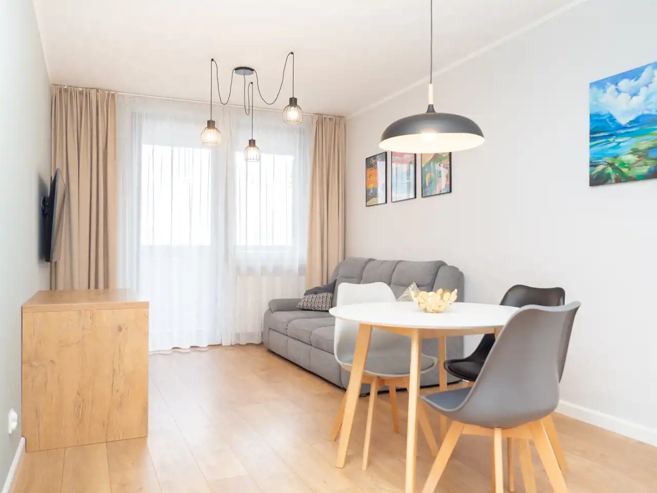 Salon został wyposażony w telewizor Samsung 50 cali z funkcją Smart TV oraz rozkładaną, trzyosobową sofę. Aneks kuchenny oferuje wysokiej jakości sprzęt AGD, w tym lodówkę z zamrażarką, płytę indukcyjną, okap, zmywarkę 60 cm oraz piekarnik z funkcją mikrofali.