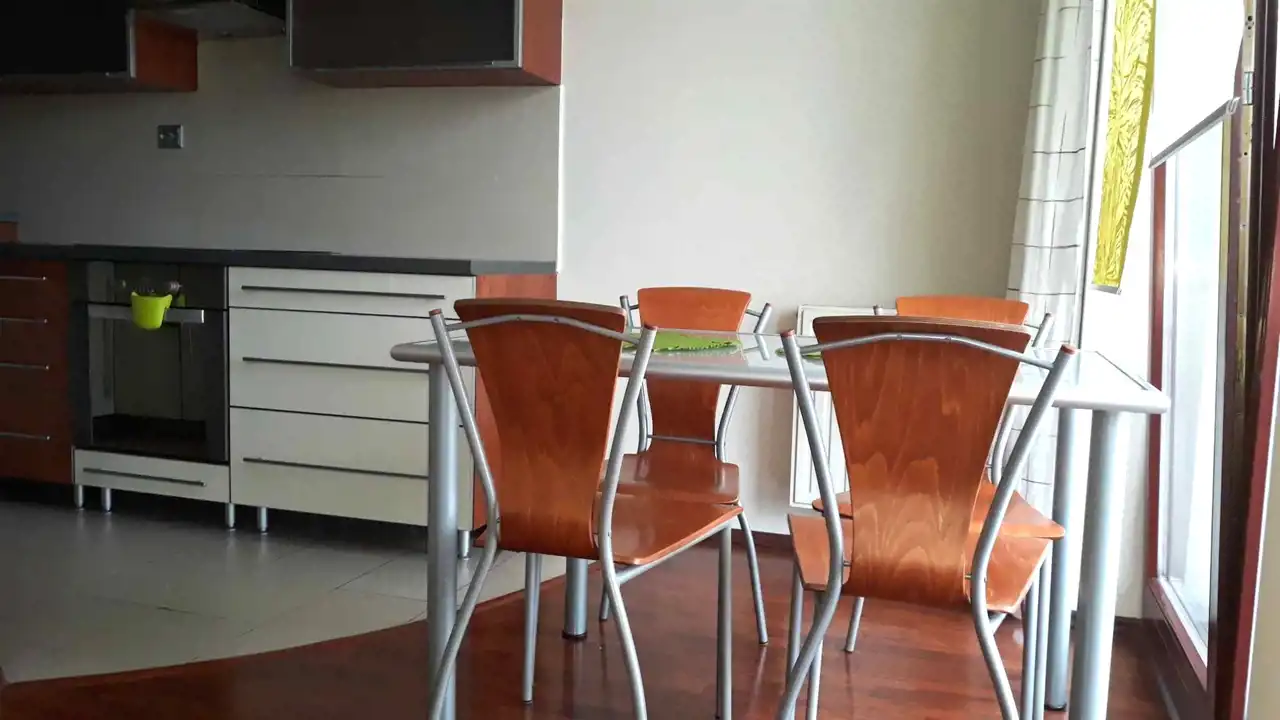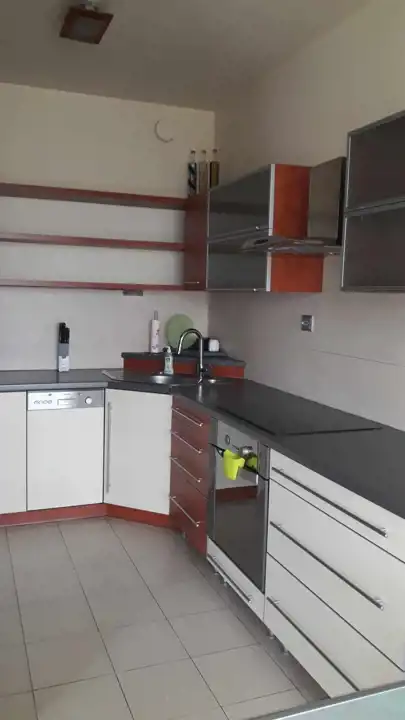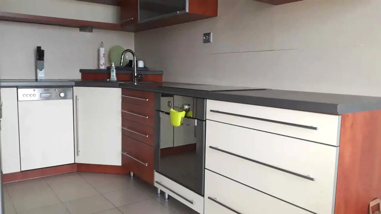 Kuchnia z pełnym wyposażeniem (lodówka, zmywarka, piekarnik, palnik elektryczny) częściowo połączona z salonem.