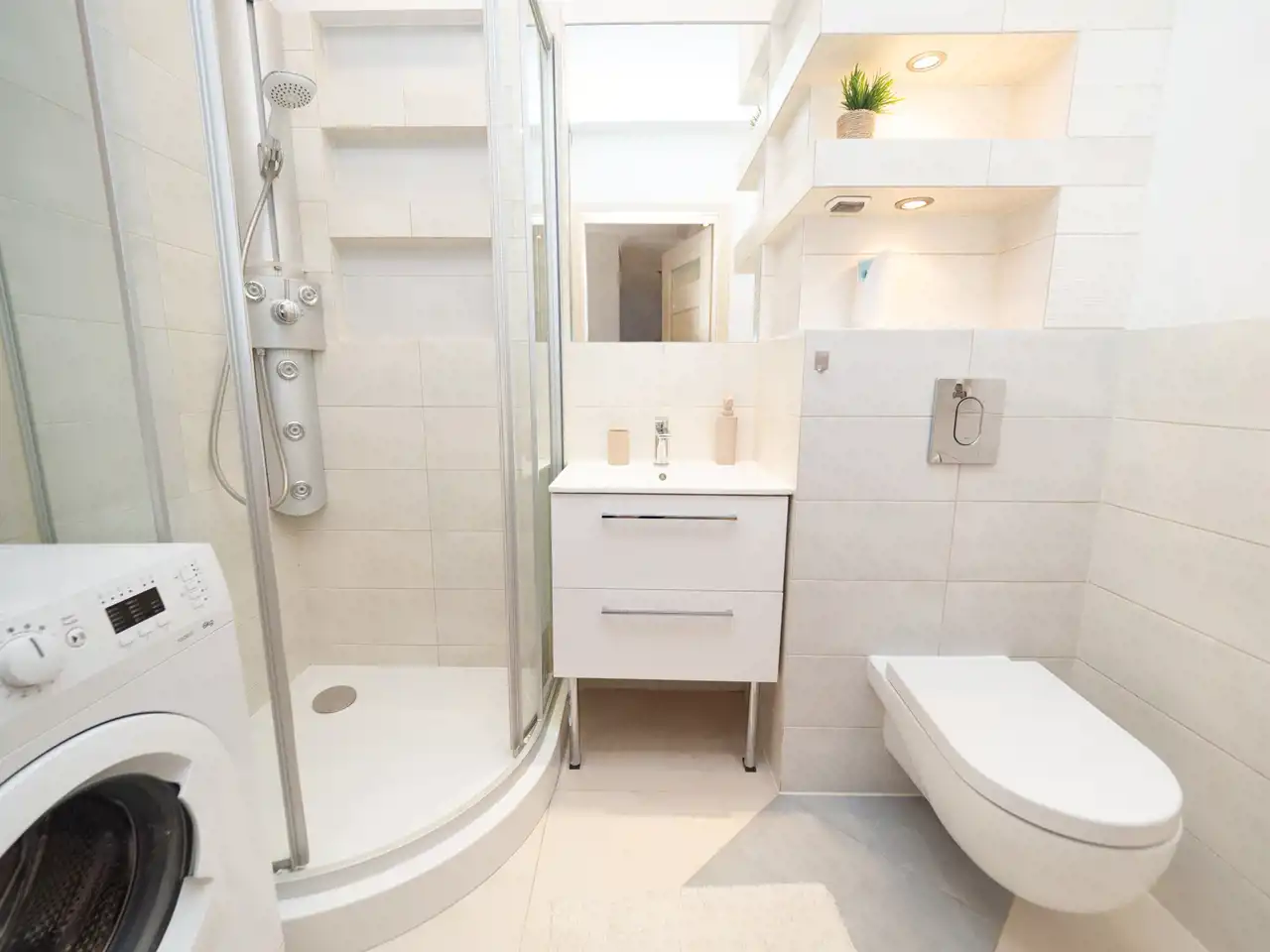 - a bathroom (washing machine, shower with a shower panel, sink with a cabinet, and an additional wall-mounted cabinet)