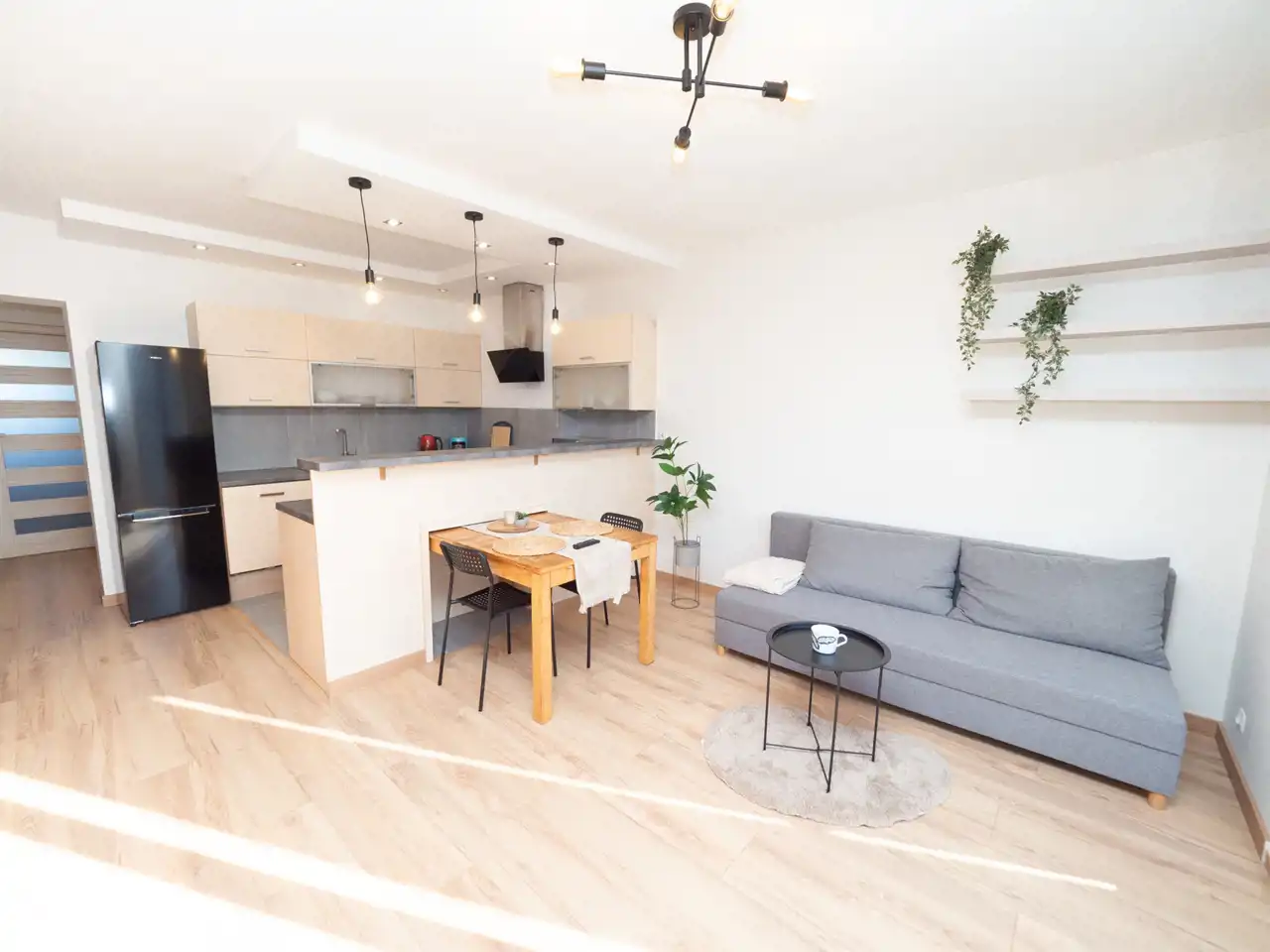 - salon z aneksem kuchennym (lodówka, piekarnik elektryczny, płyta grzewcza z elektronicznym programatorem czasowym, okap kuchenny, stalowy zlewozmywak , ledowe oświetlenie pod szafkami, stół jadalny rozkładany, sofa rozkłada,półki na ścianach)