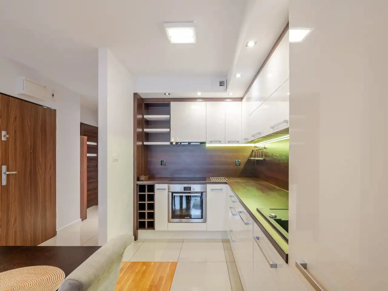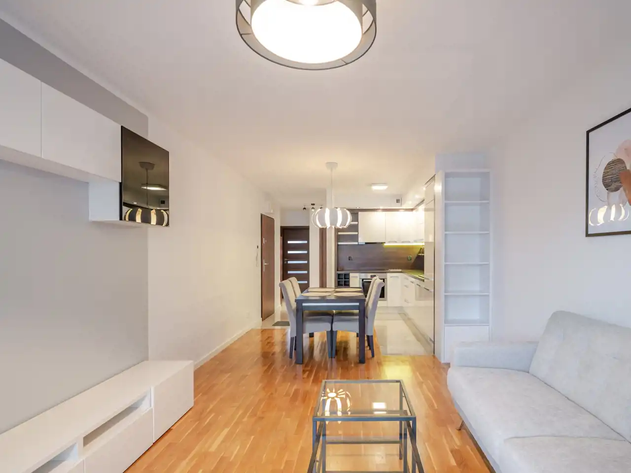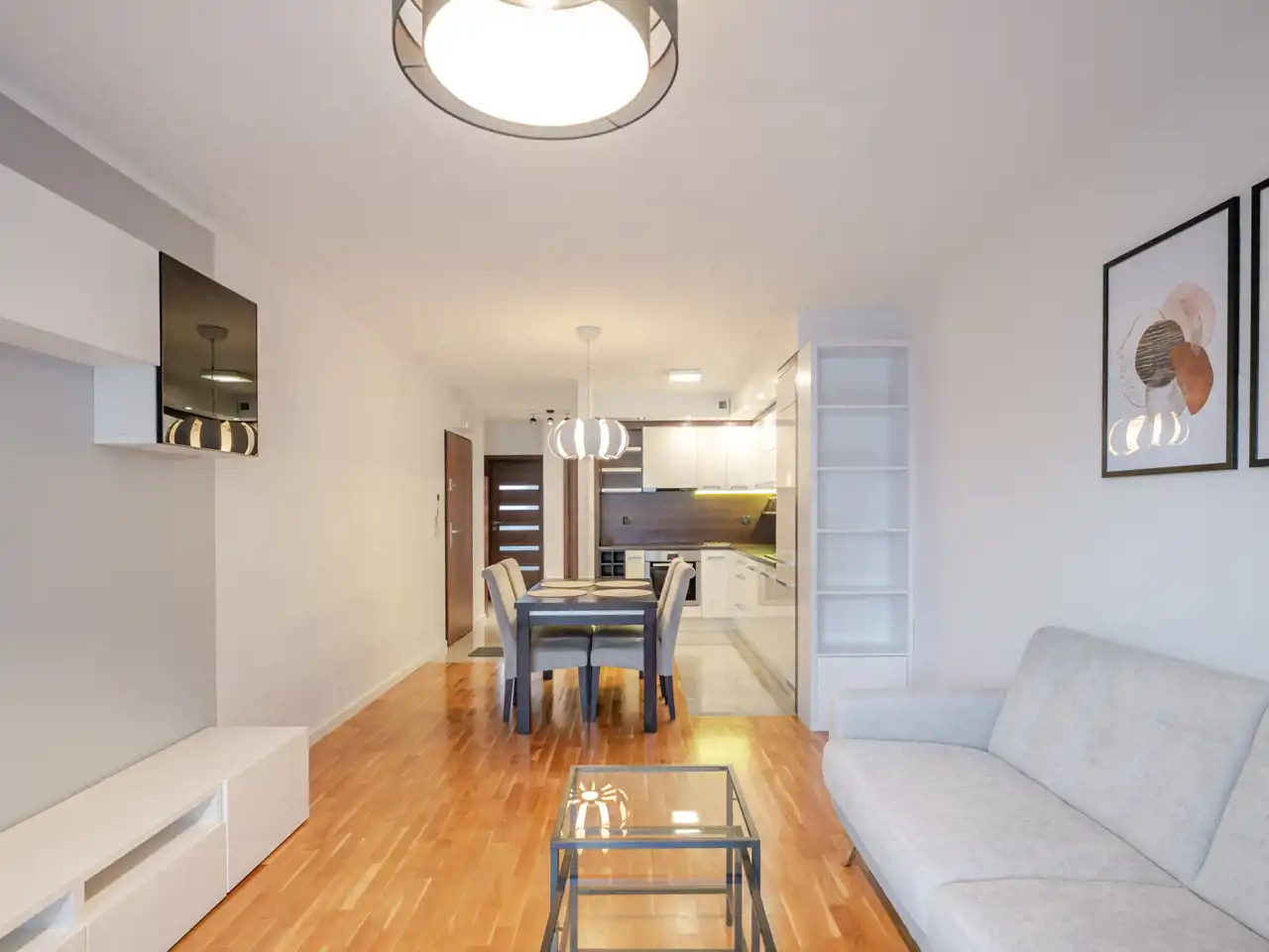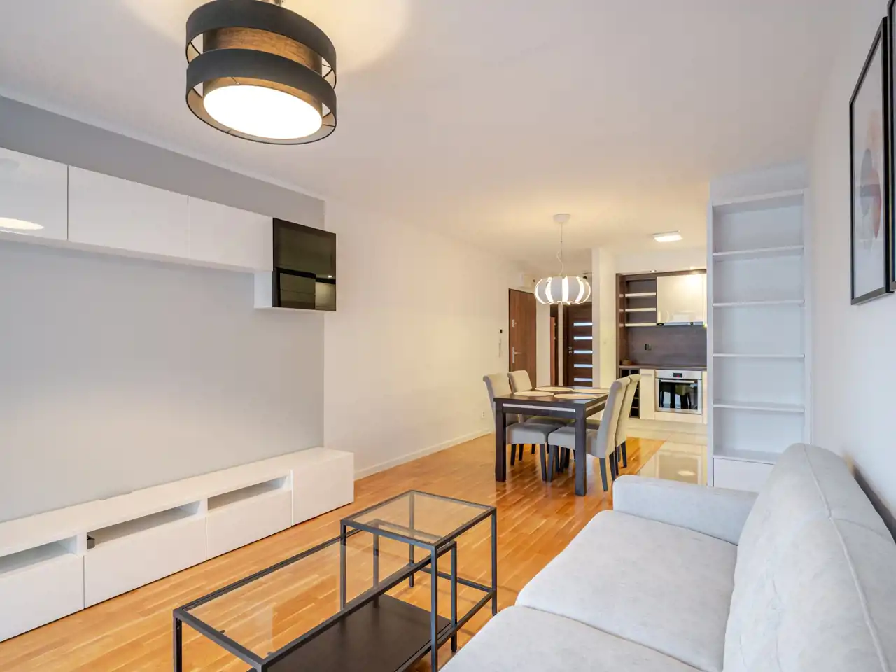 Mieszkanie jest w pełni umeblowane. Kuchnia wyposażona w kompletne AGD: piekarnik, płytę indukcyjną, zmywarkę oraz zestaw naczyń. W łazience znajduje się pralka.