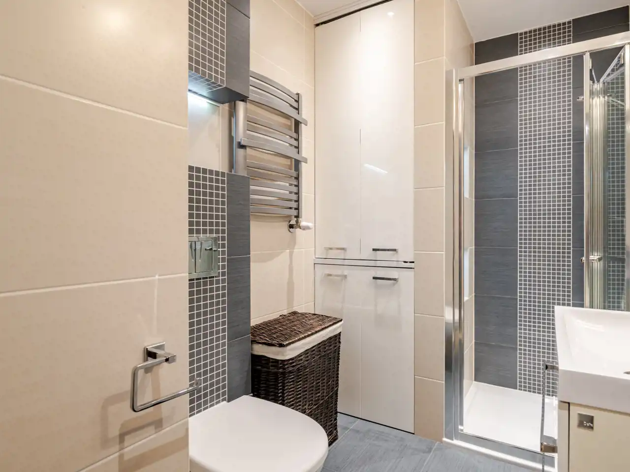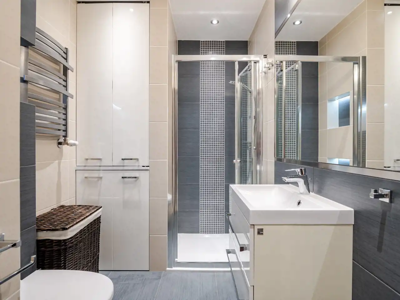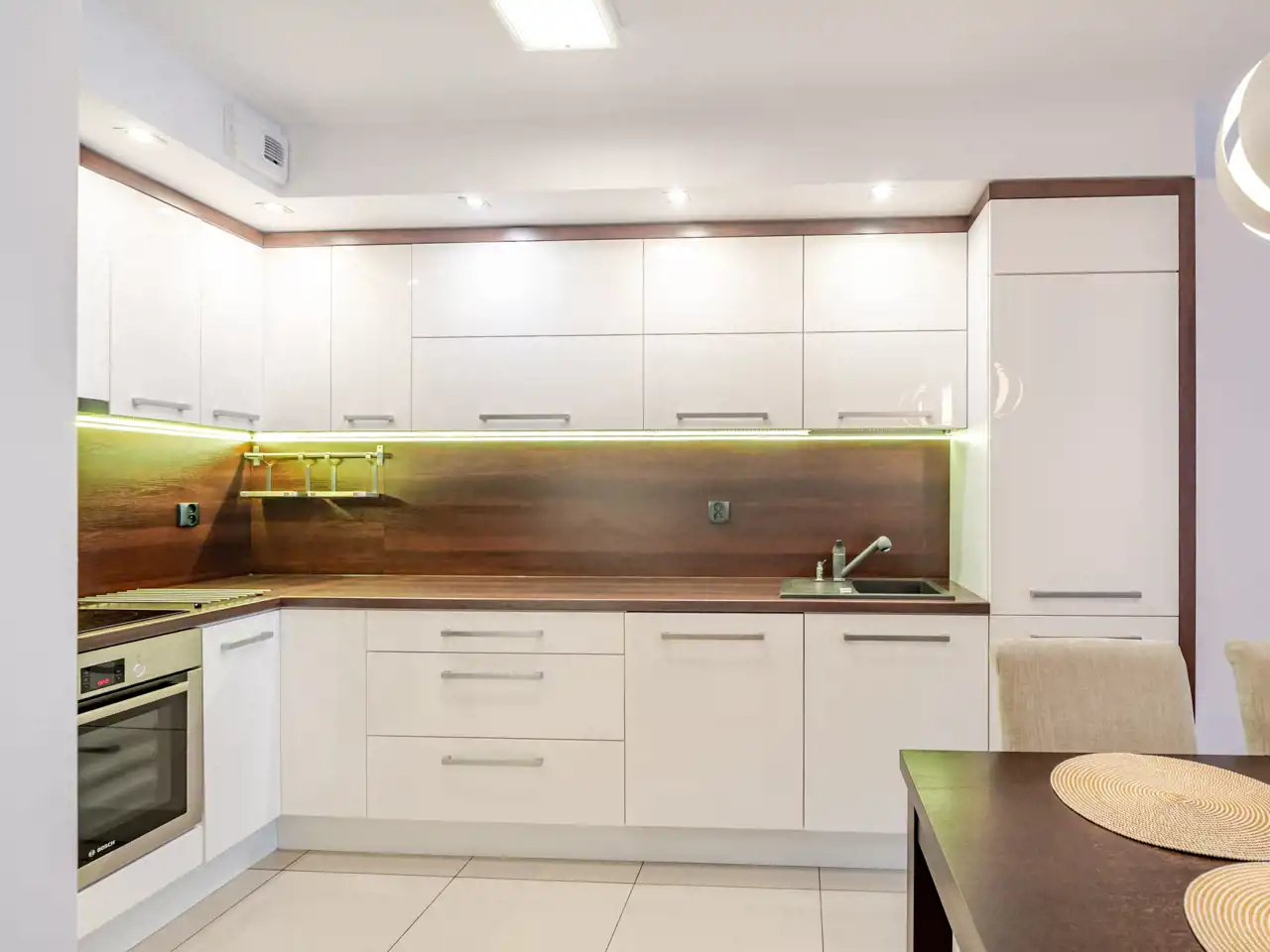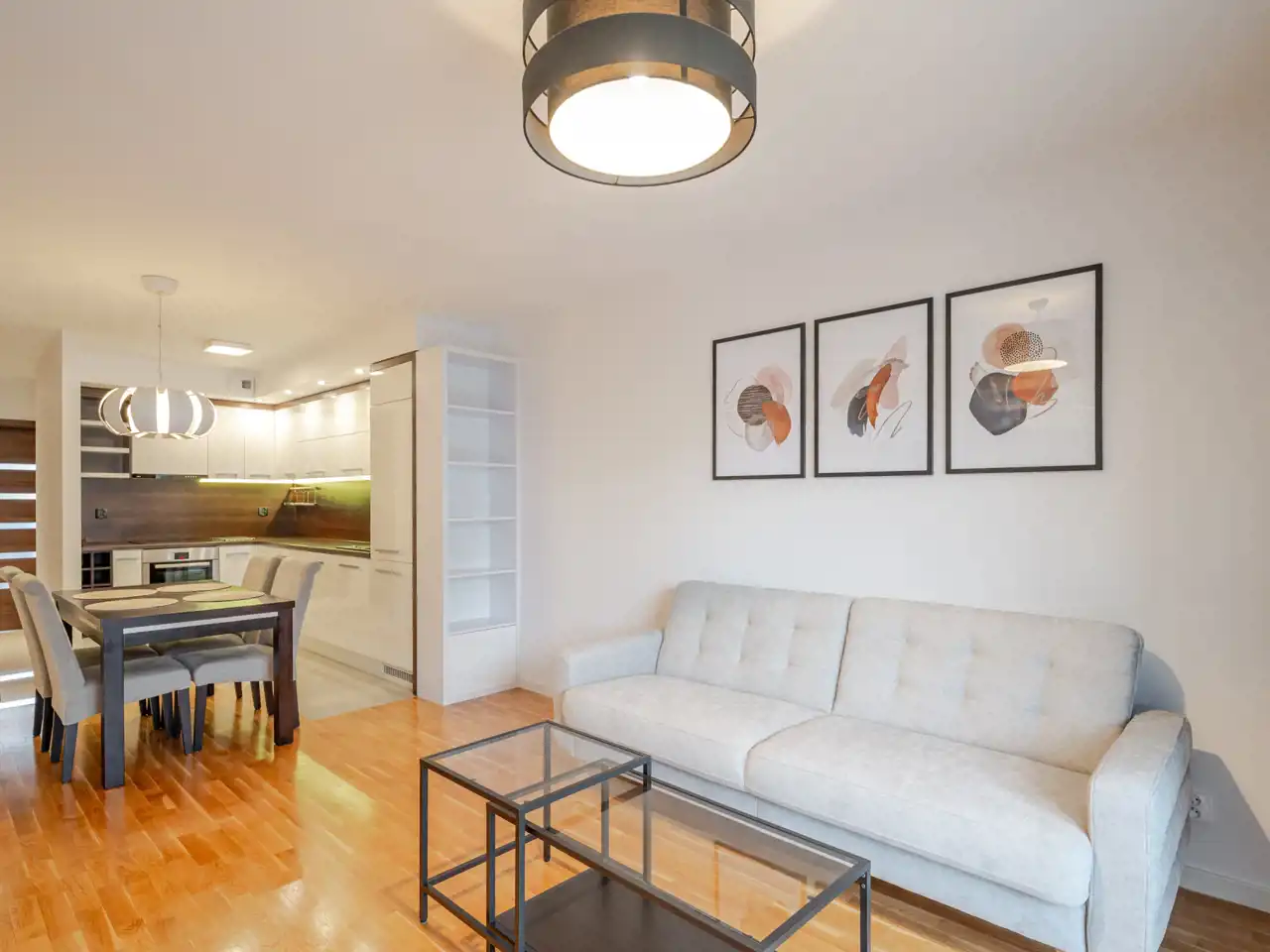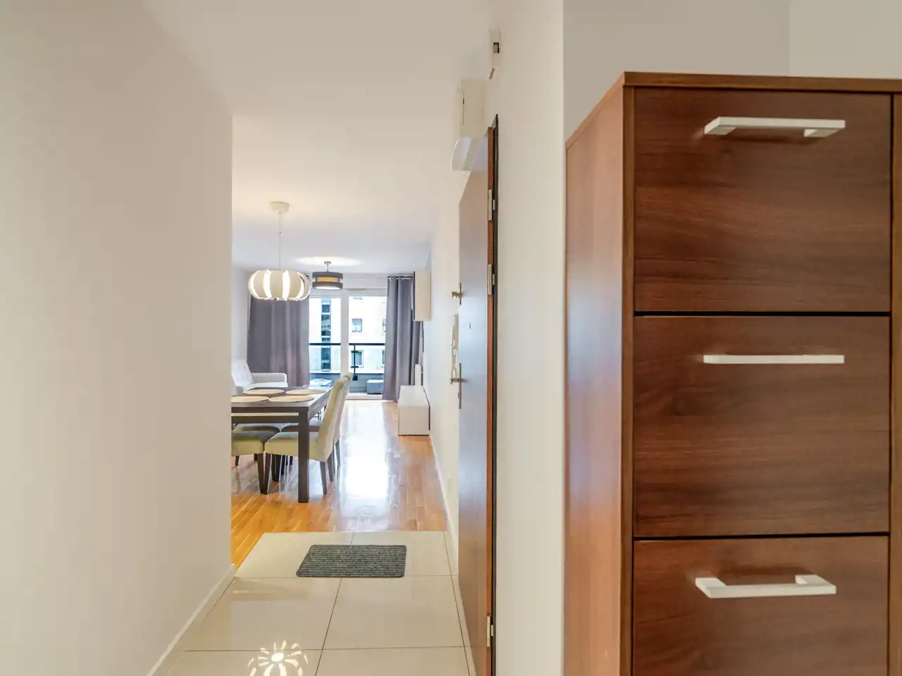 Mieszkanie jest w pełni umeblowane. Kuchnia wyposażona w kompletne AGD: piekarnik, płytę indukcyjną, zmywarkę oraz zestaw naczyń. W łazience znajduje się pralka.