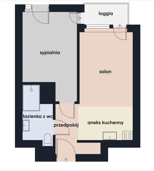 Mieszkanie składa się z: przedpokoju, salonu z aneksem kuchennym, sypialni oraz łazienki z wc. Z salonu wyjście na loggię.